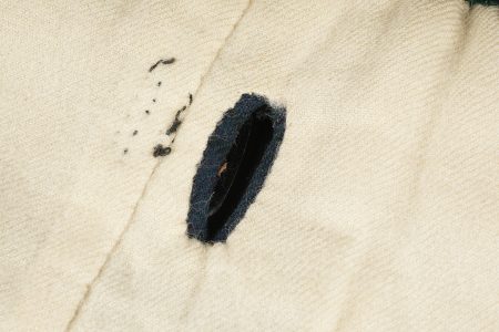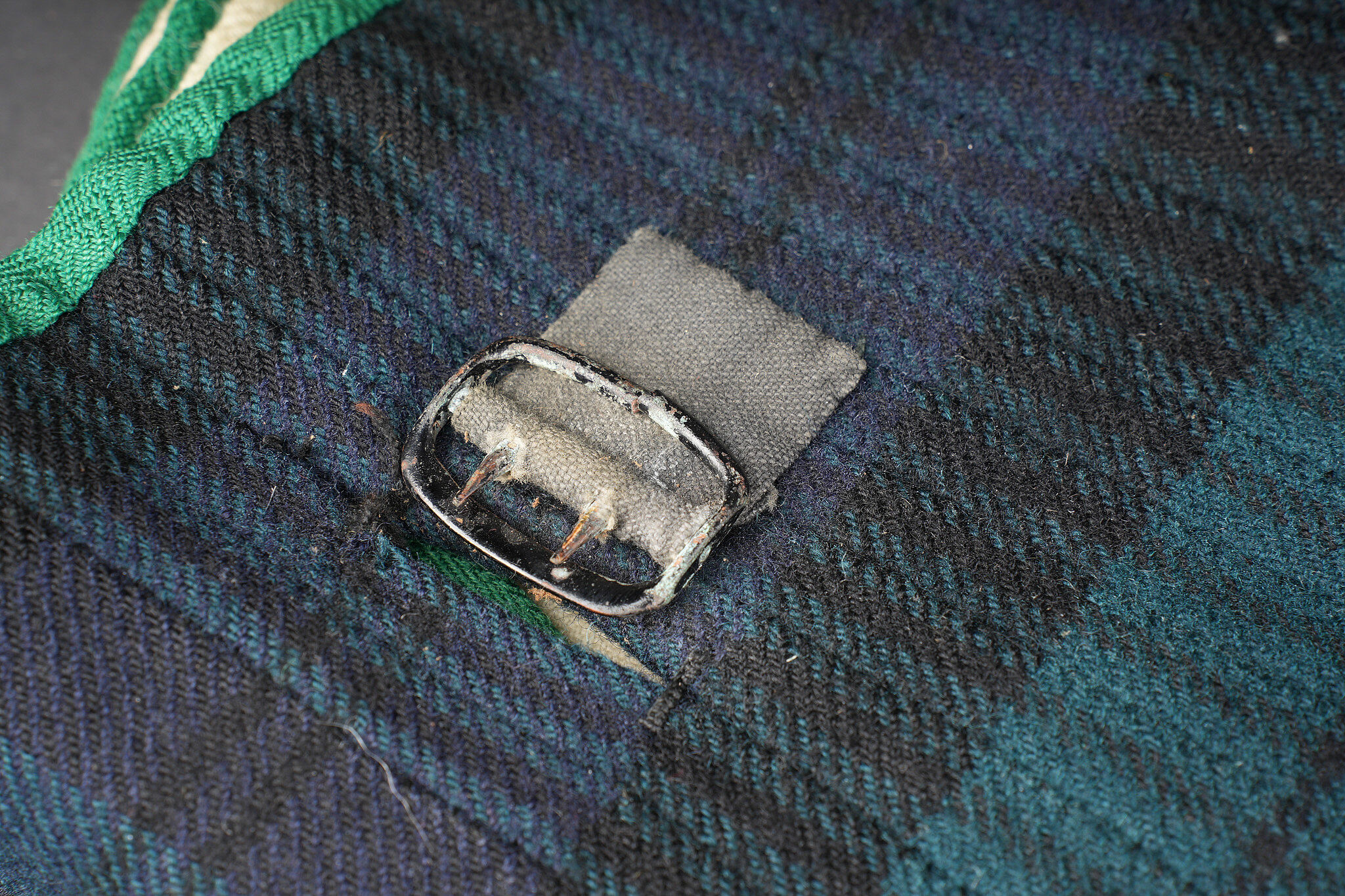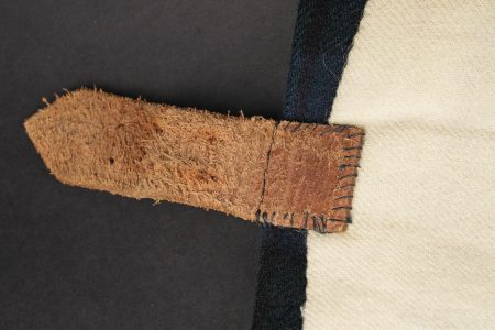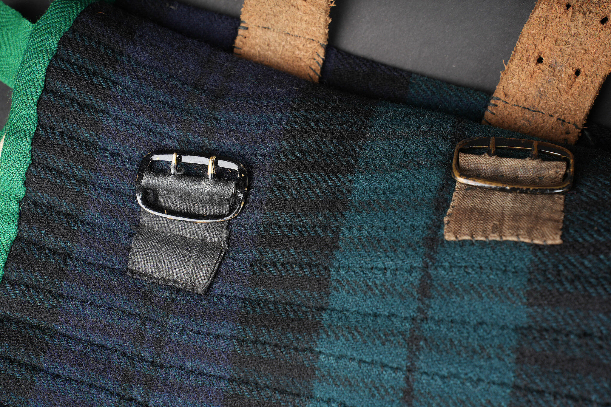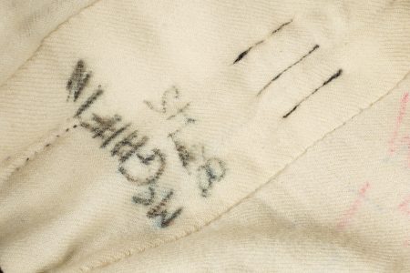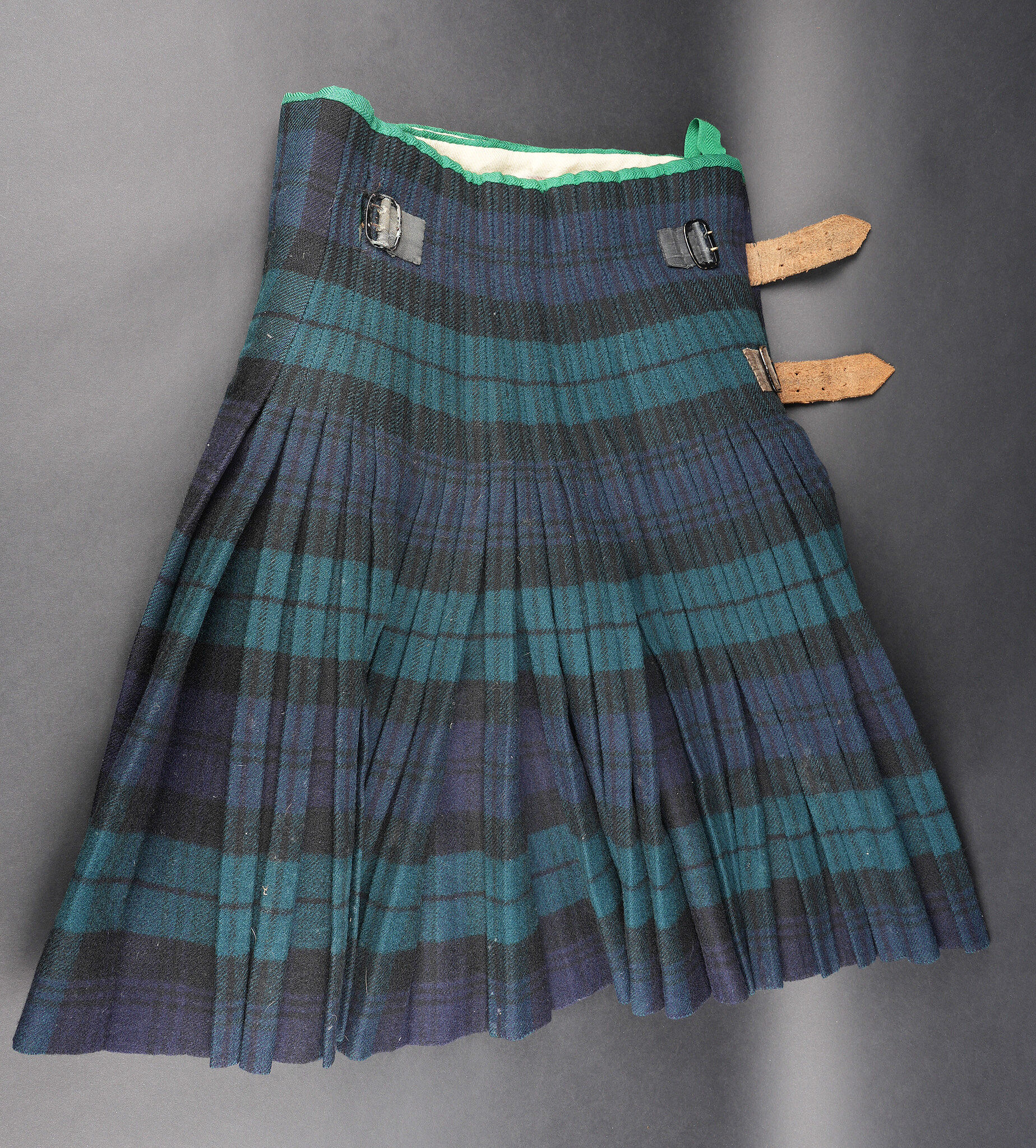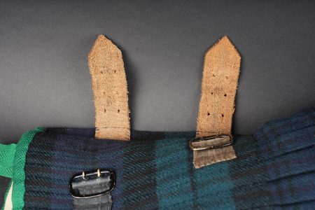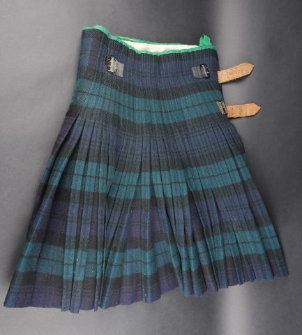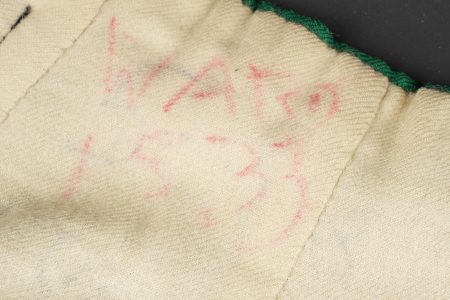 Kilt écossais règlementaire. En laine à tartan militaire standard, fabrication après 1918 comme indiqué par le tampon War Department au dessus duquel se trouve une lettre, peu lisible, peut être un M pour 1944 ou 1953, et au dessous le chiffre d’inspecteur. Fermeture par 2 pattes de cuir. De nombreuses inscriptions manuscrites sur la doublure avec des noms, matricules et/ou unités. Bon état. Regulation Scottish kilt in standard military tartan wool, manufactured after 1918 as indicated by the War Department stamp with an indistinct letter above, possibly M for 1944 or 1953, and inspector number below. Fastening by two leather straps. Numerous manuscript inscriptions inside the lining with names, service numbers and units. Good condition.