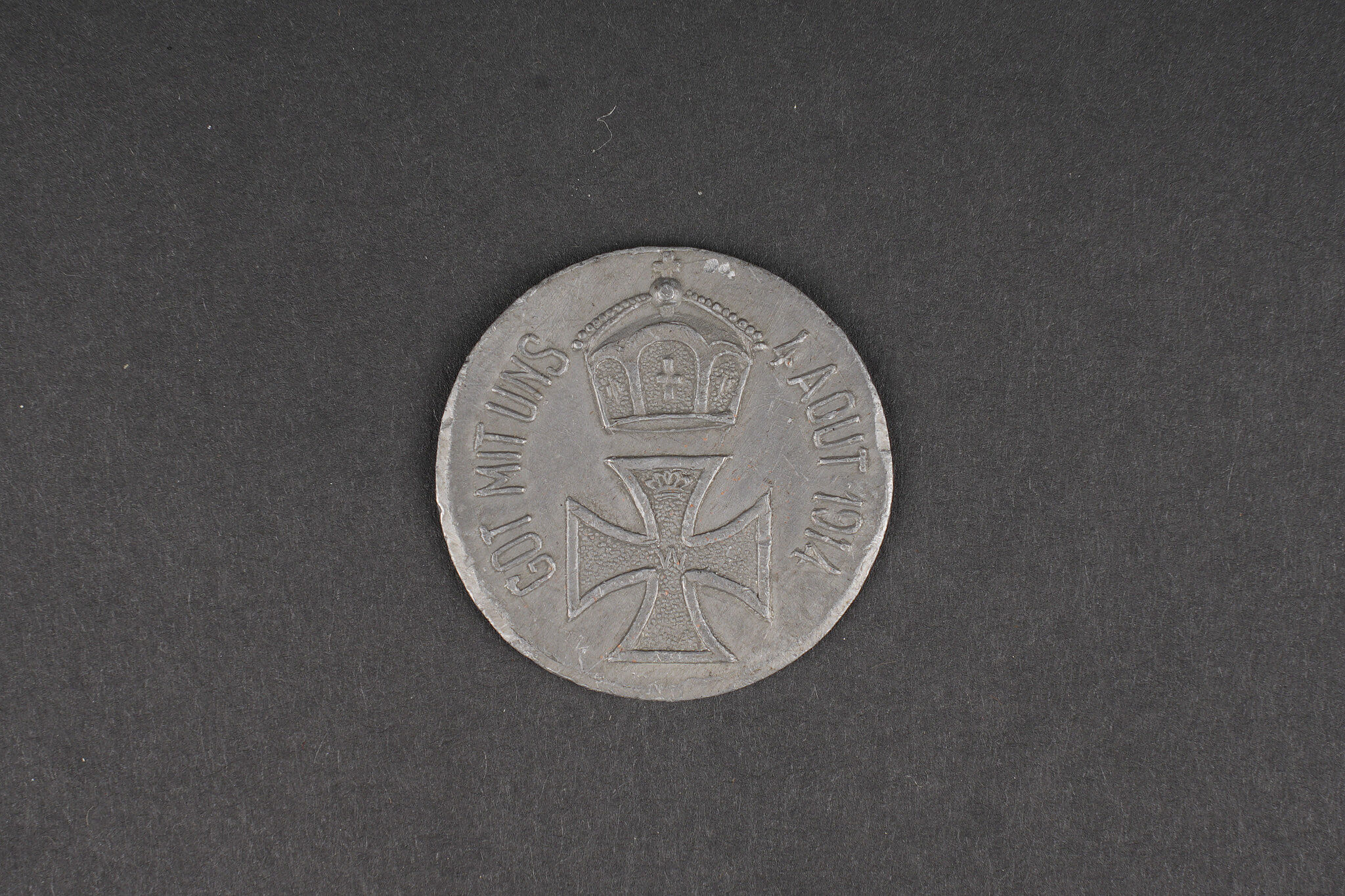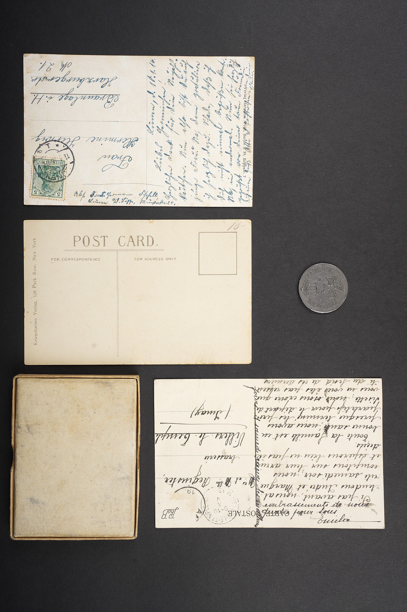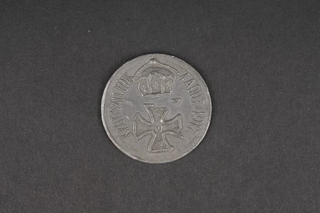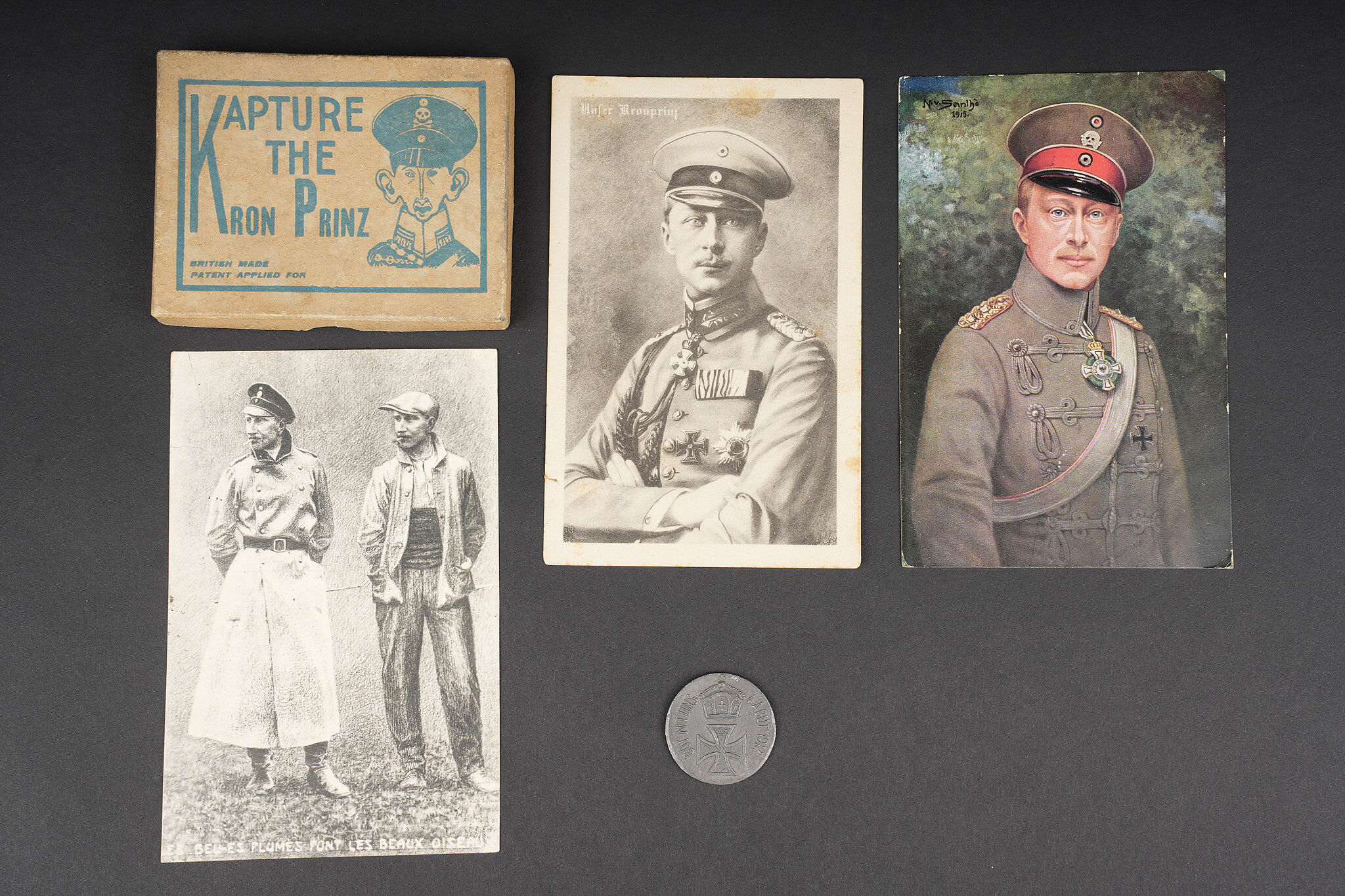 Kronprinz objets patriotiques ou satyriques. 2 cartes postales patriotiques, une carte postale satyrique. Un jeu de tranchée anglais Kapture the Kron Prinz complet de ses pions. On y joint un jeton satyrique Krot mit Uns. Usure d’usage. Objects relating to Wilhelm, German Crown Prince including two patriotic postcards and one satirical postcard. Included is one complete British trench game Kapture the Kron Prinz with all pieces present, together with one satirical token marked Krot mit Uns. Service wear.