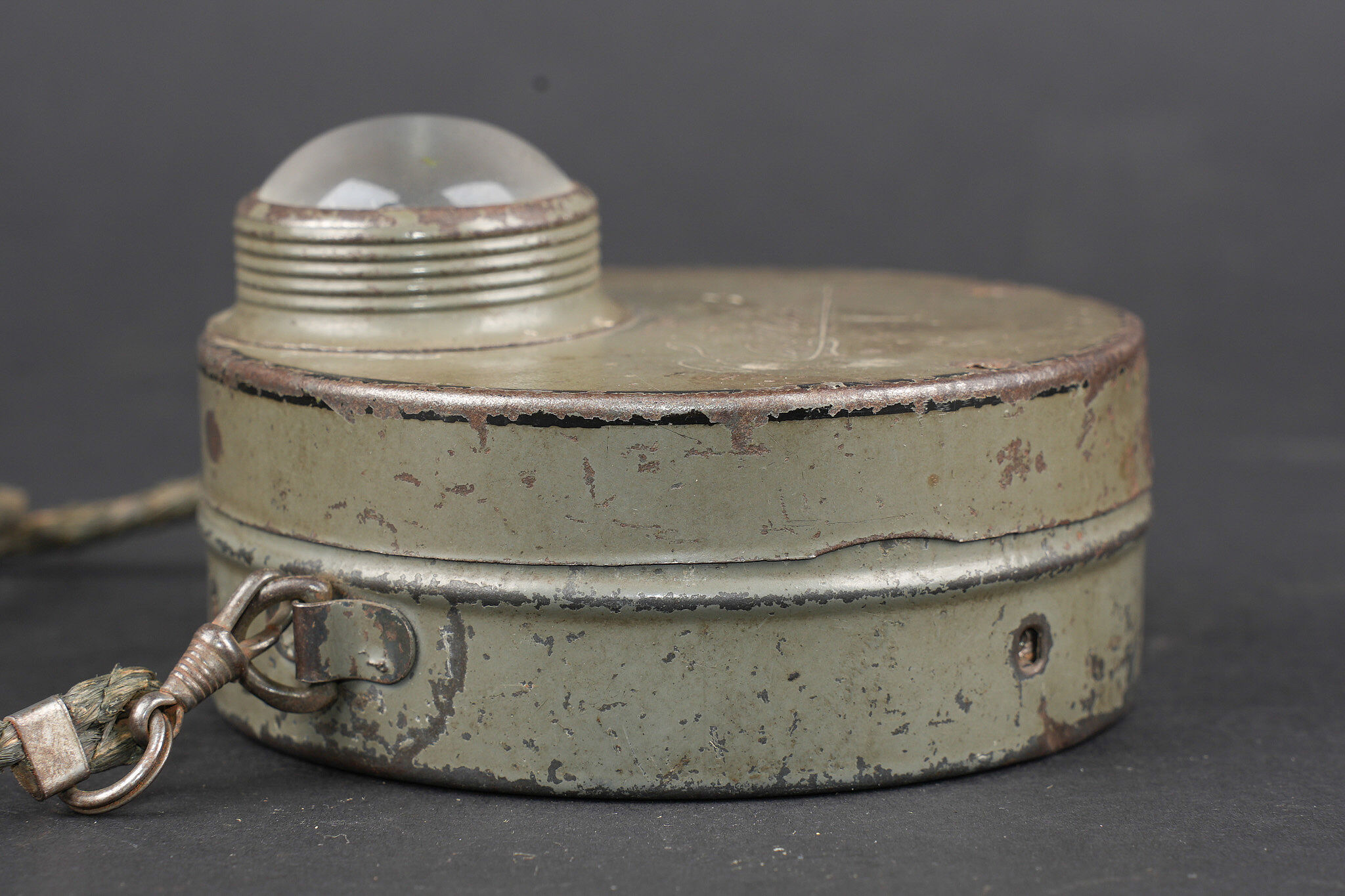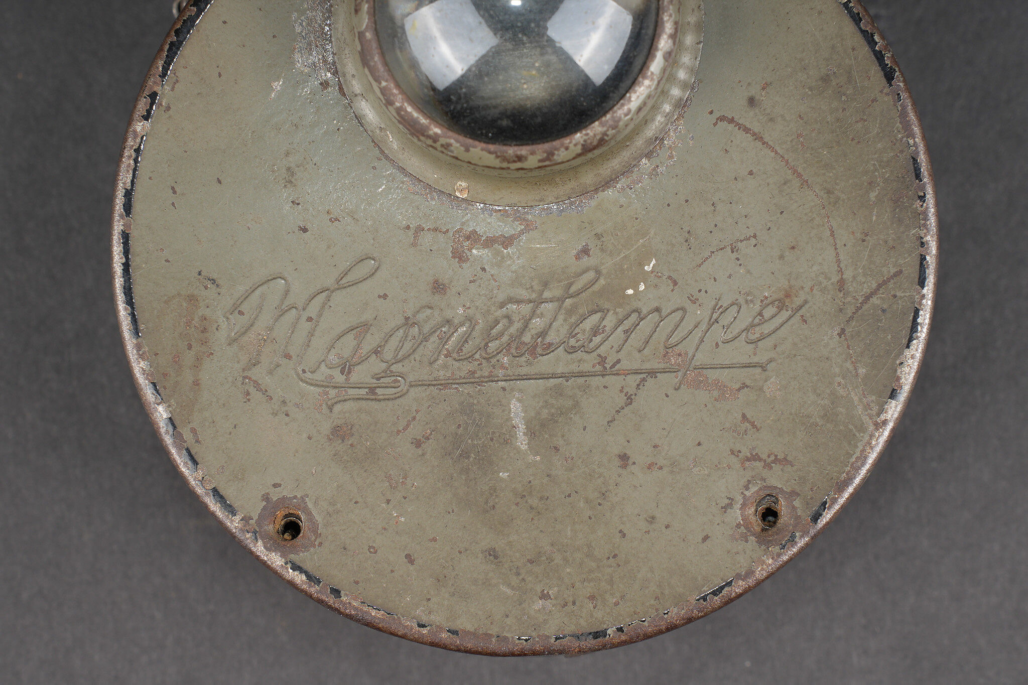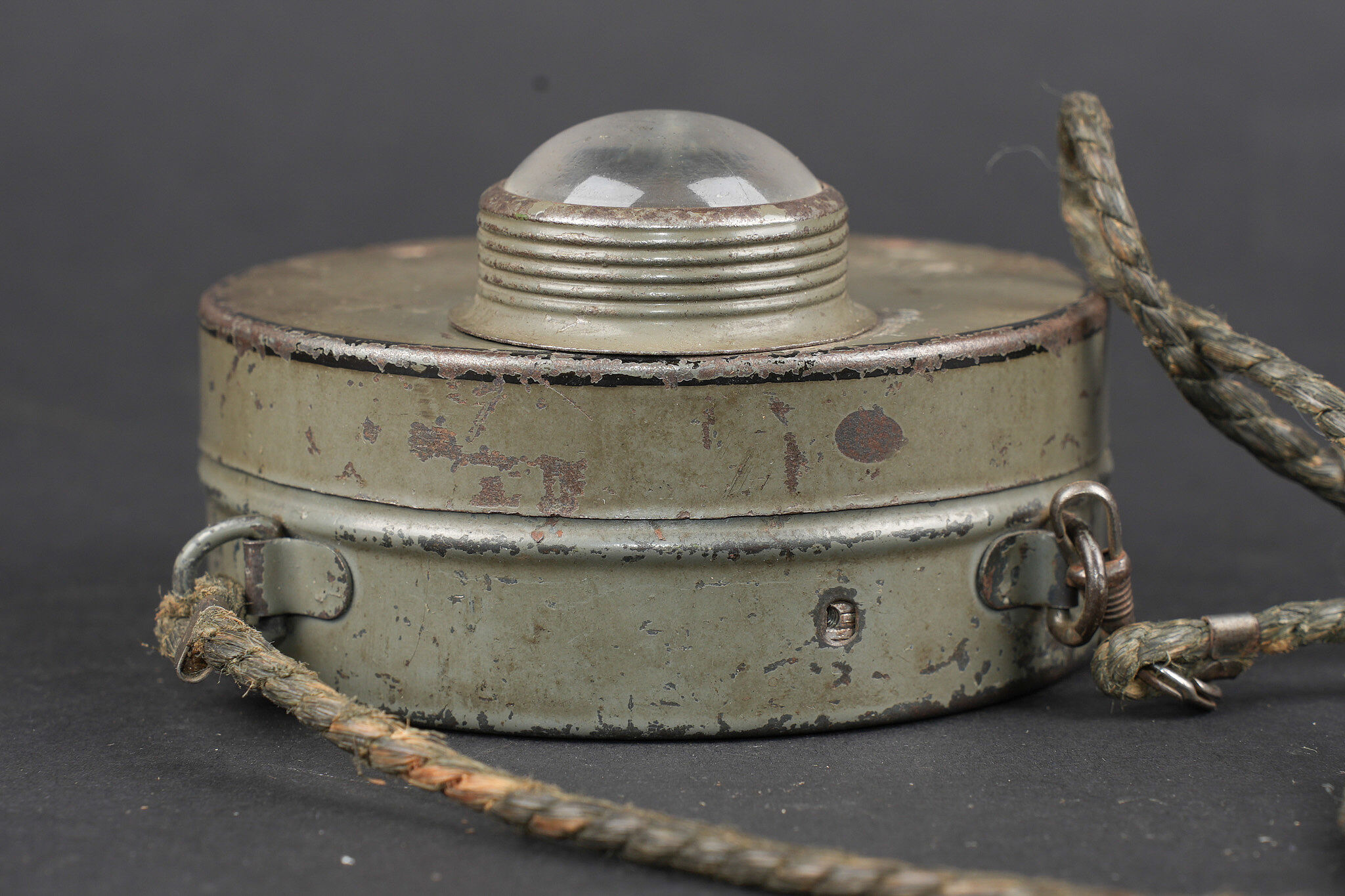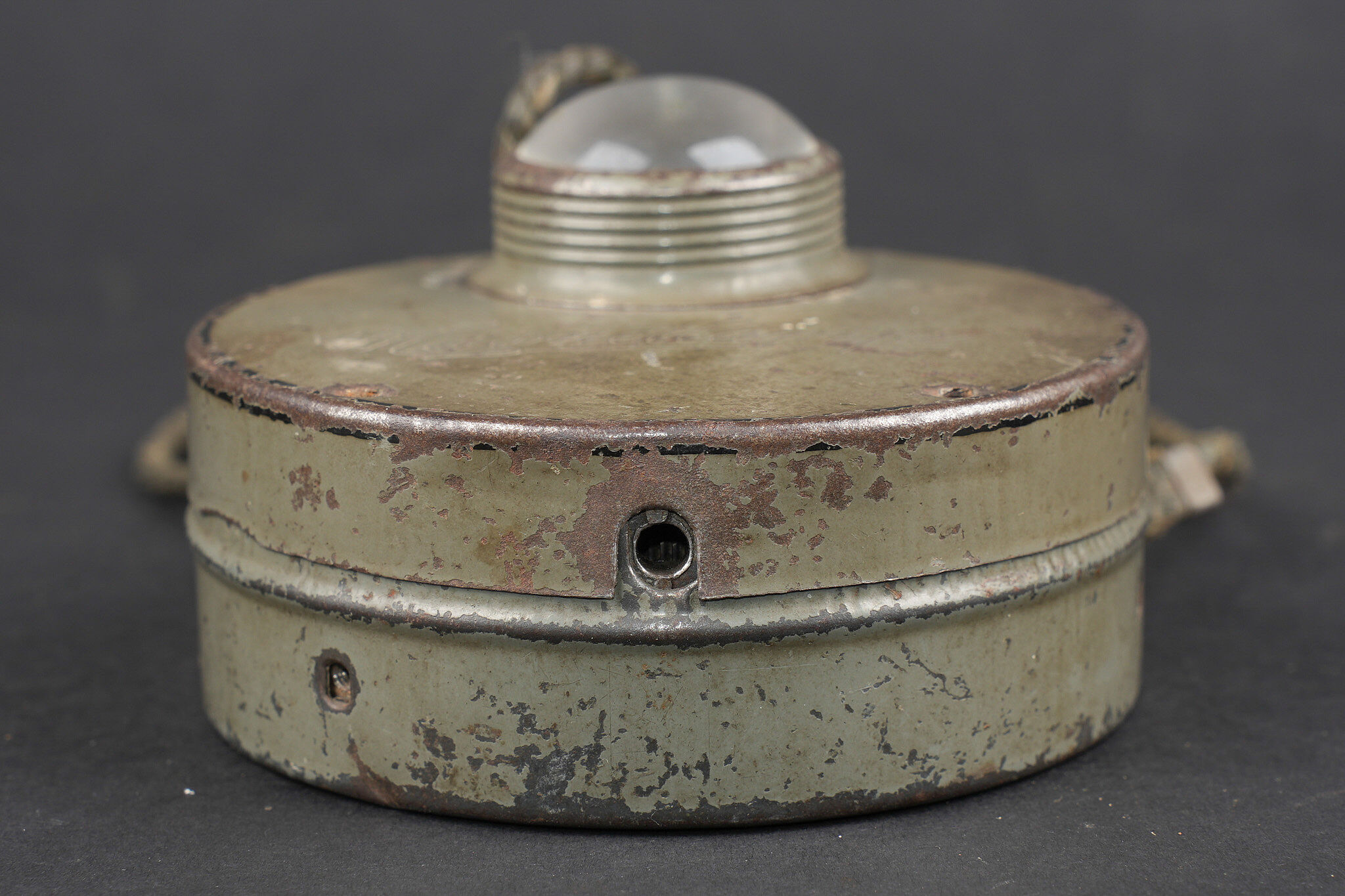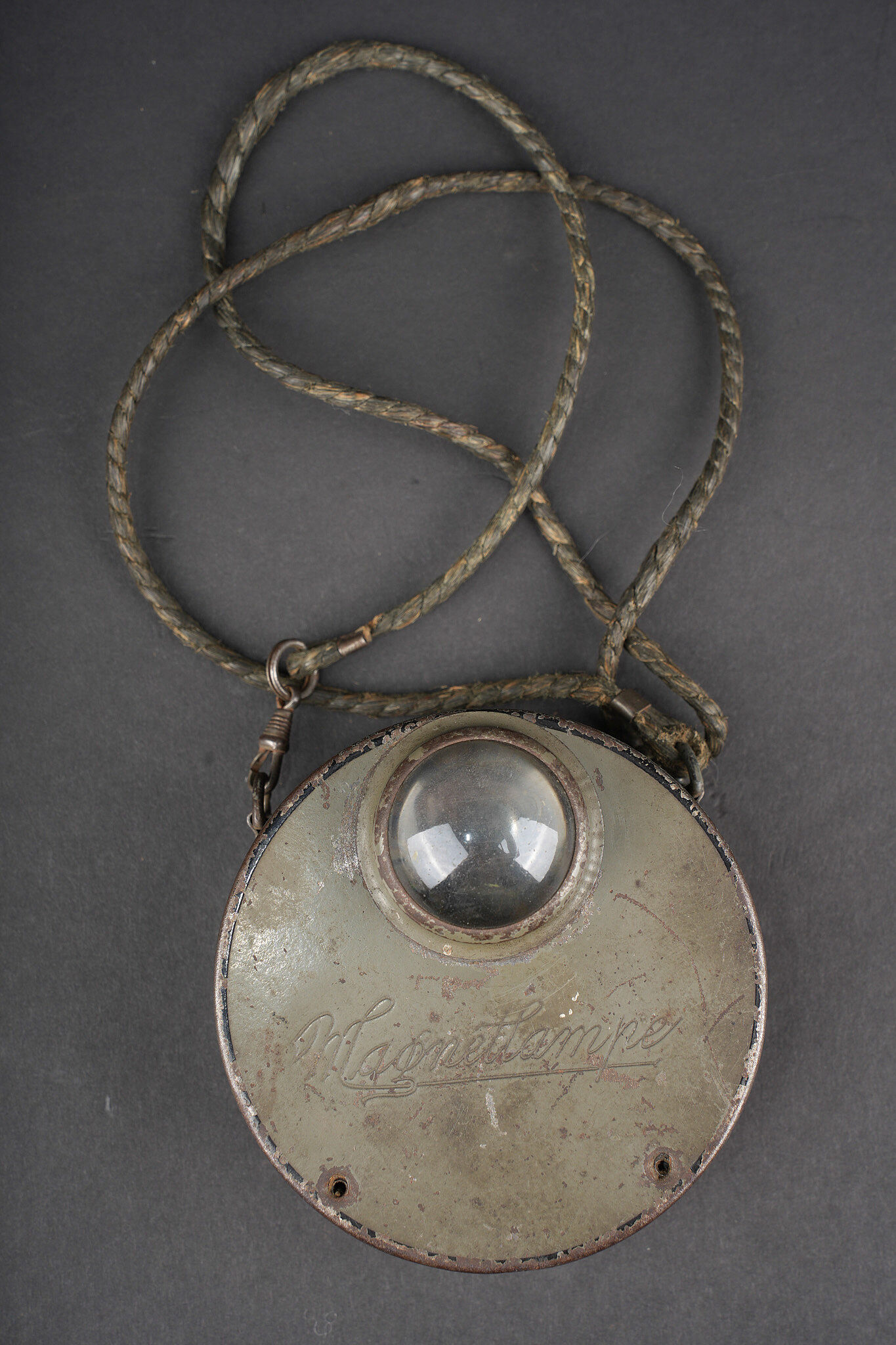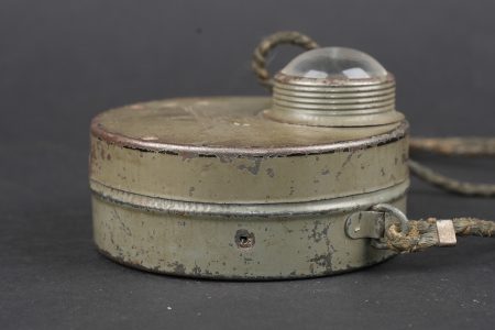 Lampe allemande feldgrau Magnetlampe. Jolie lampe circulaire avec encore une grande part de sa peinture feldgrau. Son cordon de suspension d’origine. Chainette de fonctionnement manquante ainsi que les vis de facade. Datée 2-19 à l’intérieur. Bon état, usure d’usage, patine. Magnetlampe attractive circular lamp retaining much of its feldgrau paint. Original suspension cord present. Operating chain absent as well as front screws. Dated 2–19 internally. Good condition with service wear and patina