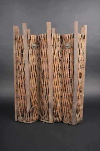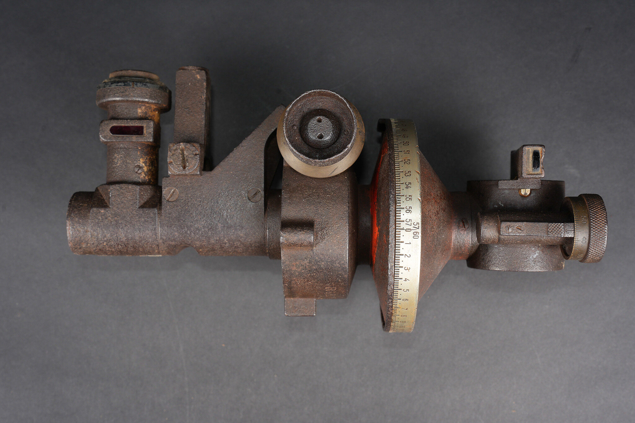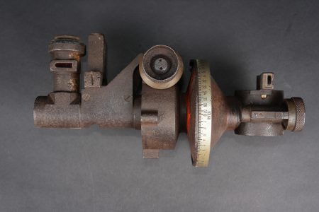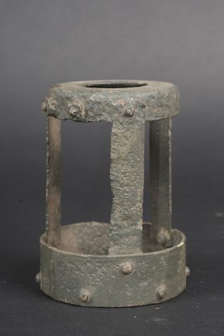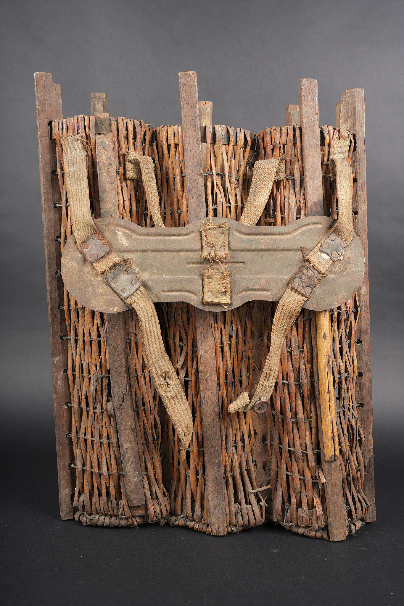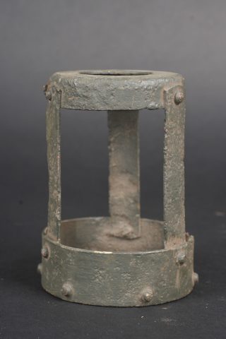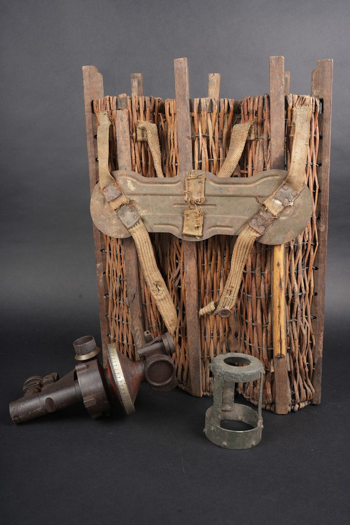 Lot artillerie allemande ww1 panier obus et visée. Un panier en osier pour 3 coups, avec son couvercle métal peint feldgrau, ses sangles. Usure d’usage. Une visée Rundblick Fernrohr 13, optique sale, corrosion. Fabricant Goerz, pour schwere Feldhaubitze 1913. Une cale pour obus en métal. First World War German artillery lot including one wicker shell basket for three rounds with feldgrau painted metal lid and straps, one Rundblickfernrohr 13 sight with dirty optics and corrosion by Goerz for the schwere Feldhaubitze 1913, and one metal shell wedge.