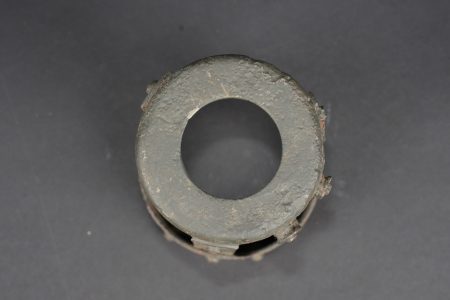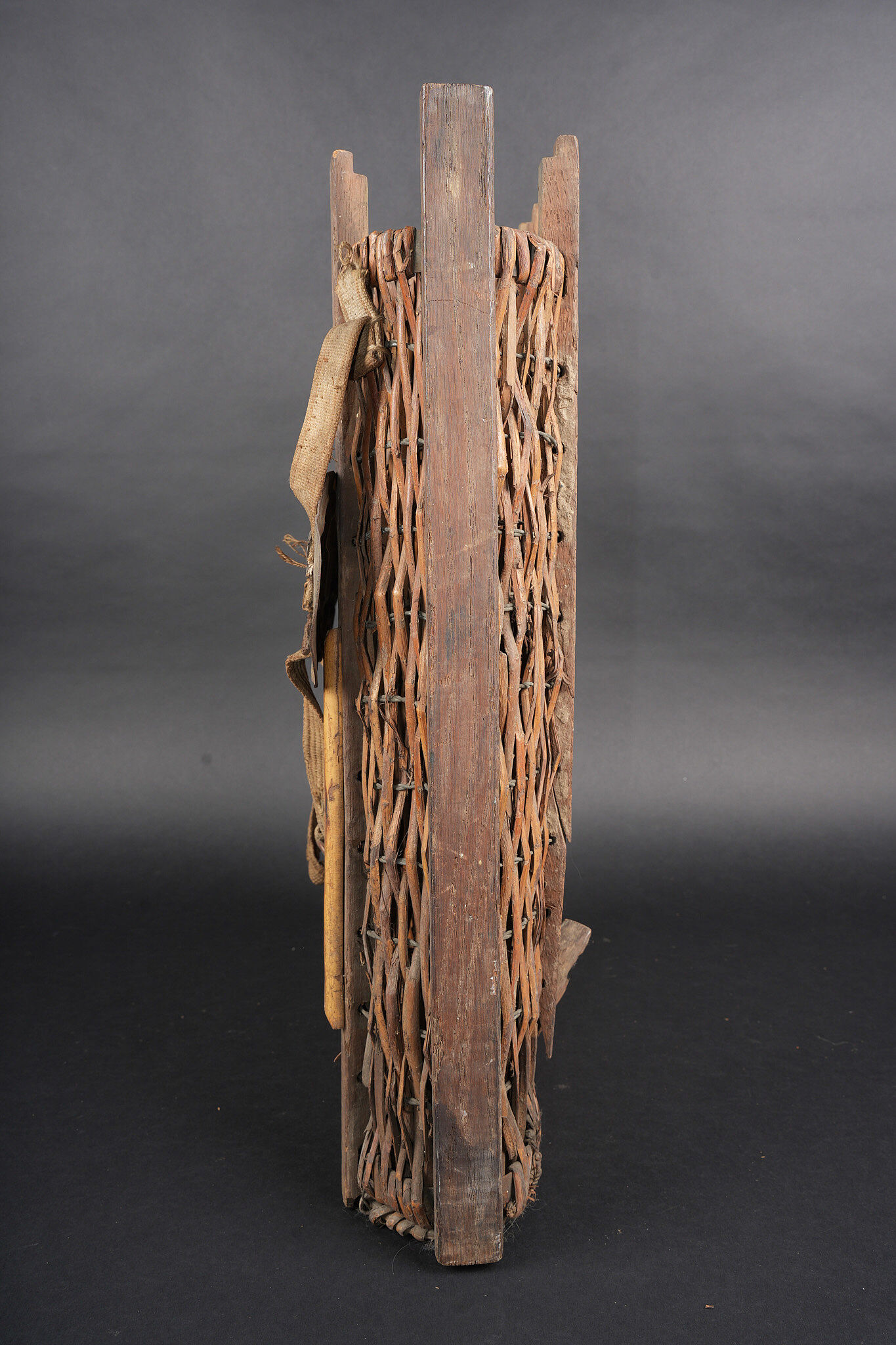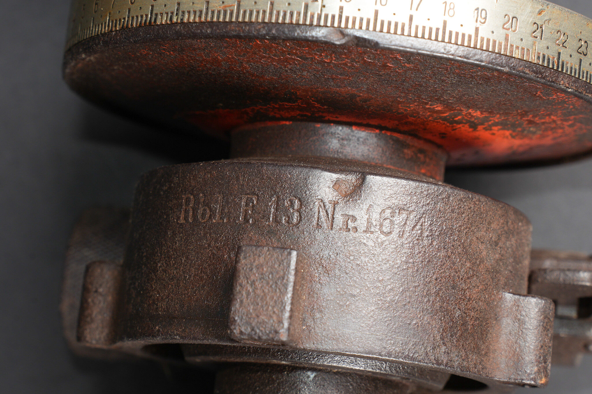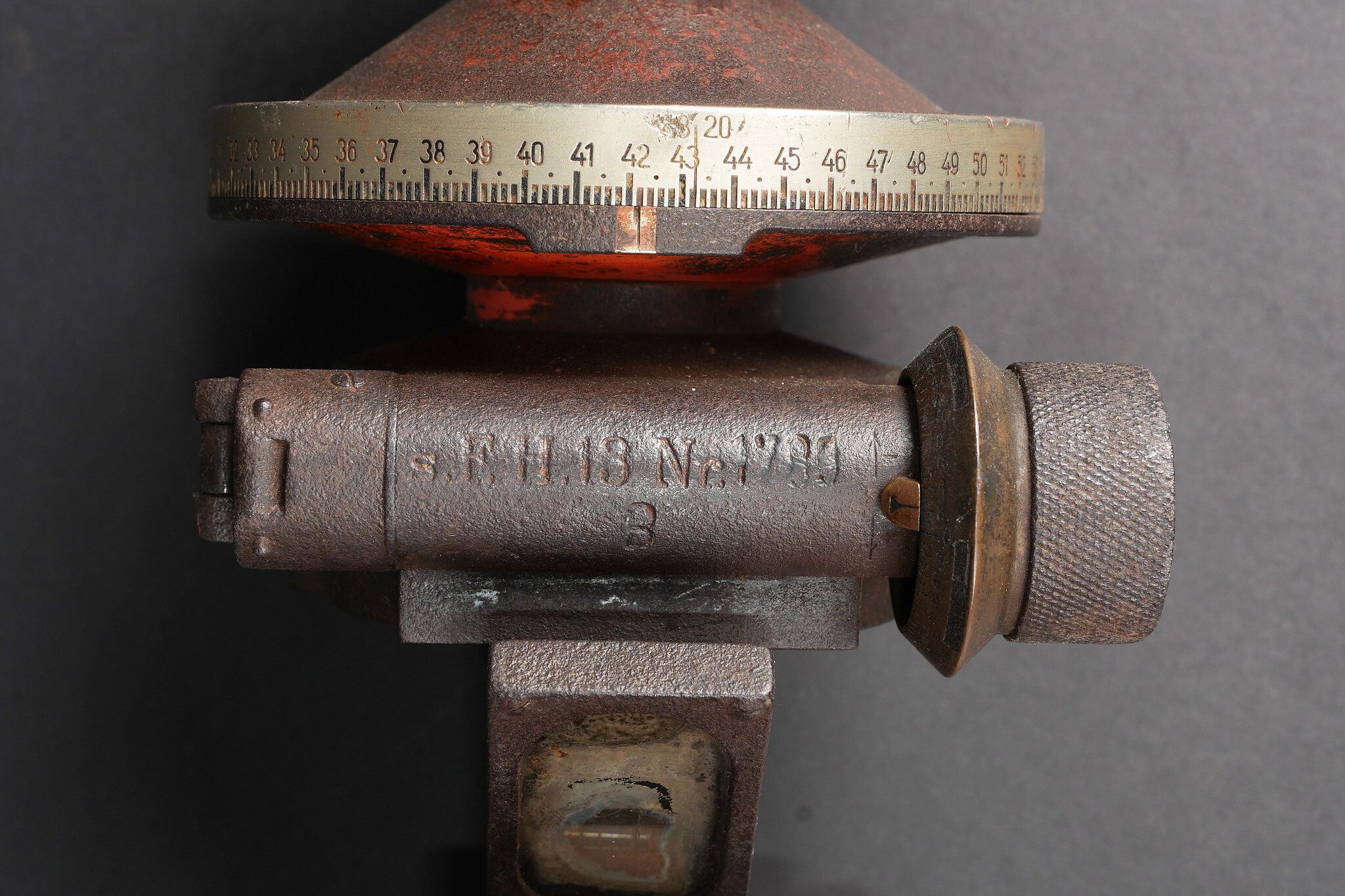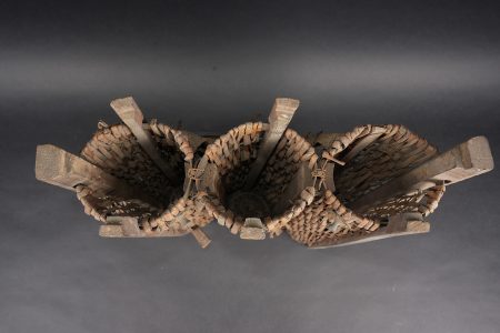 Lot artillerie allemande ww1 panier obus et visée. Un panier en osier pour 3 coups, avec son couvercle métal peint feldgrau, ses sangles. Usure d’usage. Une visée Rundblick Fernrohr 13, optique sale, corrosion. Fabricant Goerz, pour schwere Feldhaubitze 1913. Une cale pour obus en métal. First World War German artillery lot including one wicker shell basket for three rounds with feldgrau painted metal lid and straps, one Rundblickfernrohr 13 sight with dirty optics and corrosion by Goerz for the schwere Feldhaubitze 1913, and one metal shell wedge.