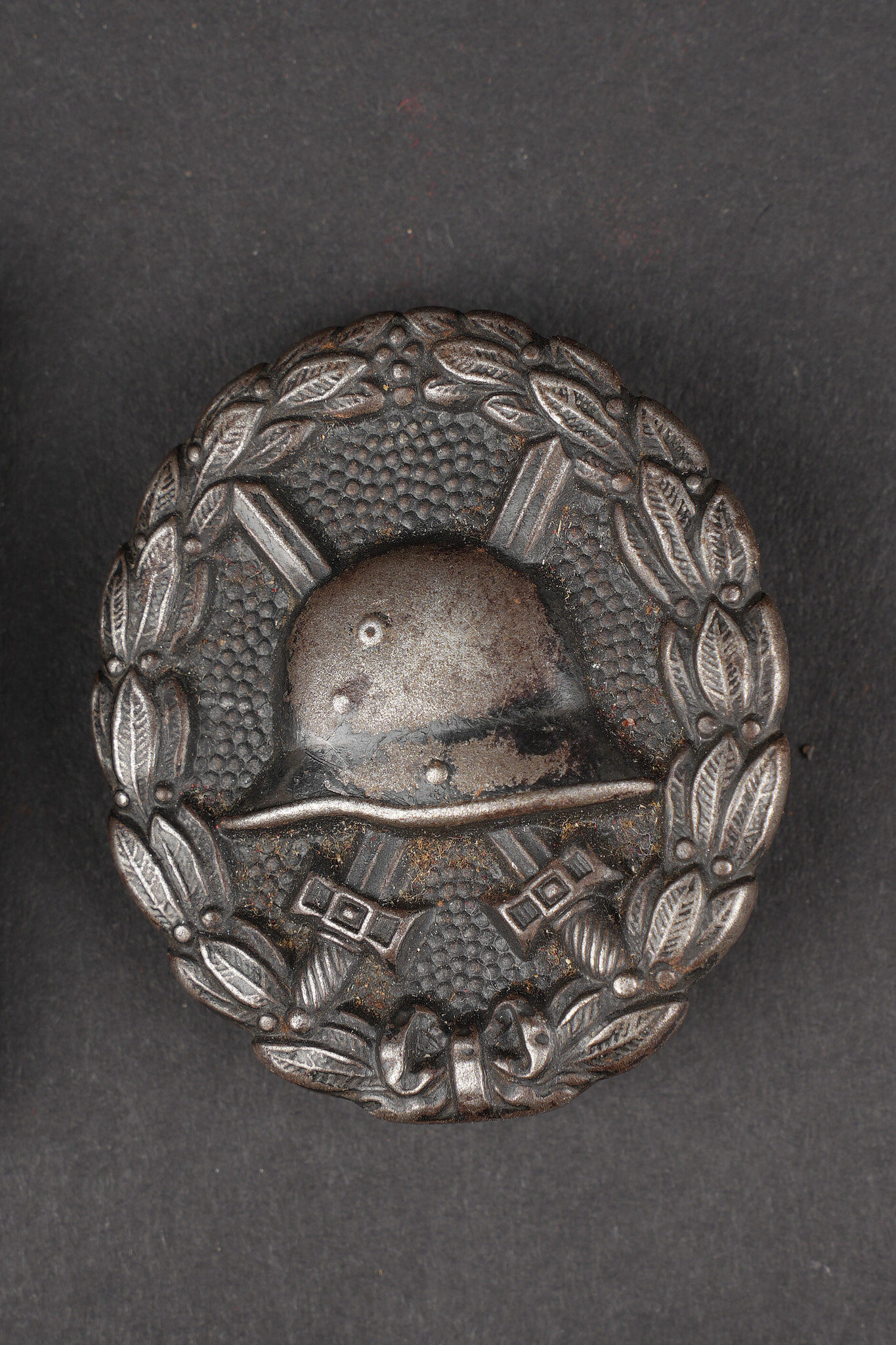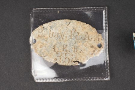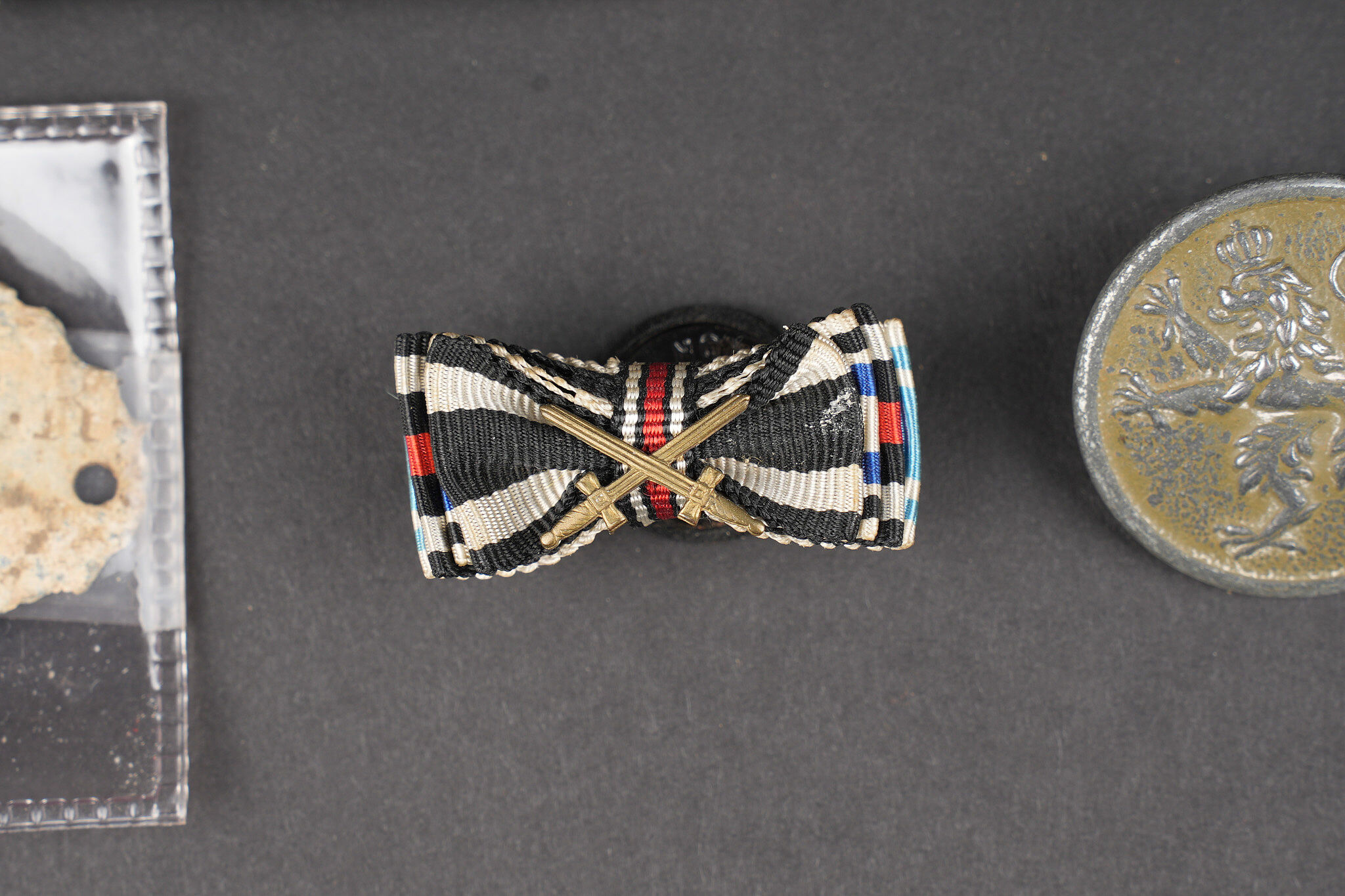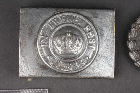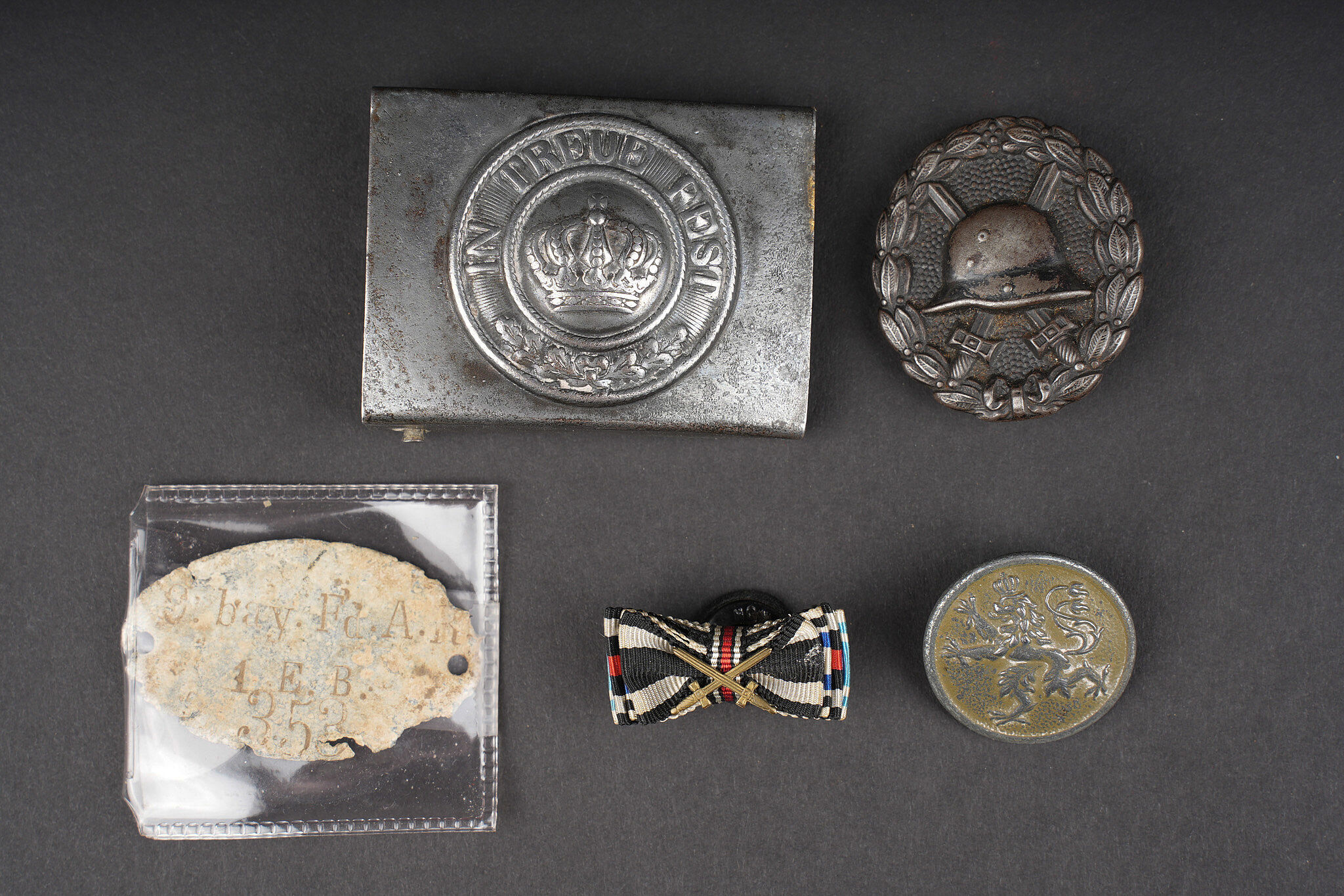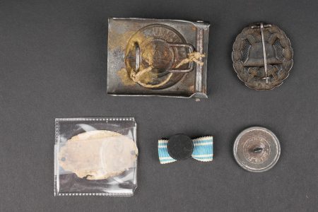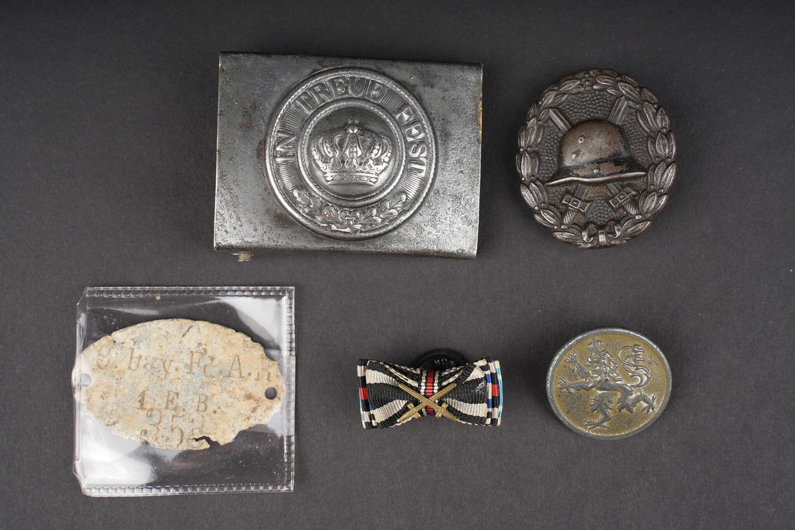 Lot bavarois boucle de ceinturon et insignes. Une boucle de ceinturon M1915 en fer, une plaque d’identité du terrain du 9 bay Feldartillerie Regiment, un bouton de col de grade de sous officier, un insigne de blessé noir, et un rappel de boutonnière. Usure d’usage. Bavarian lot including one M1915 iron belt buckle, one field identity plate of the 9th Bavarian Field Artillery Regiment, one NCO rank collar button, one black wound badge, and one buttonhole ribbon bar. Service wear.