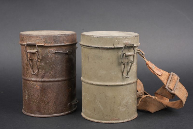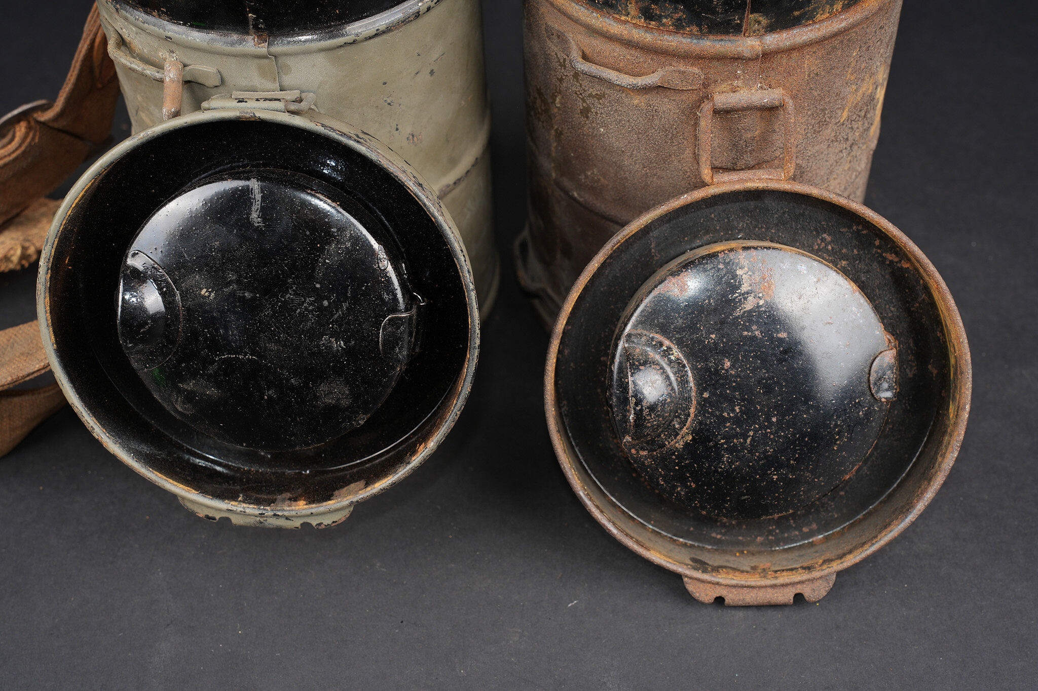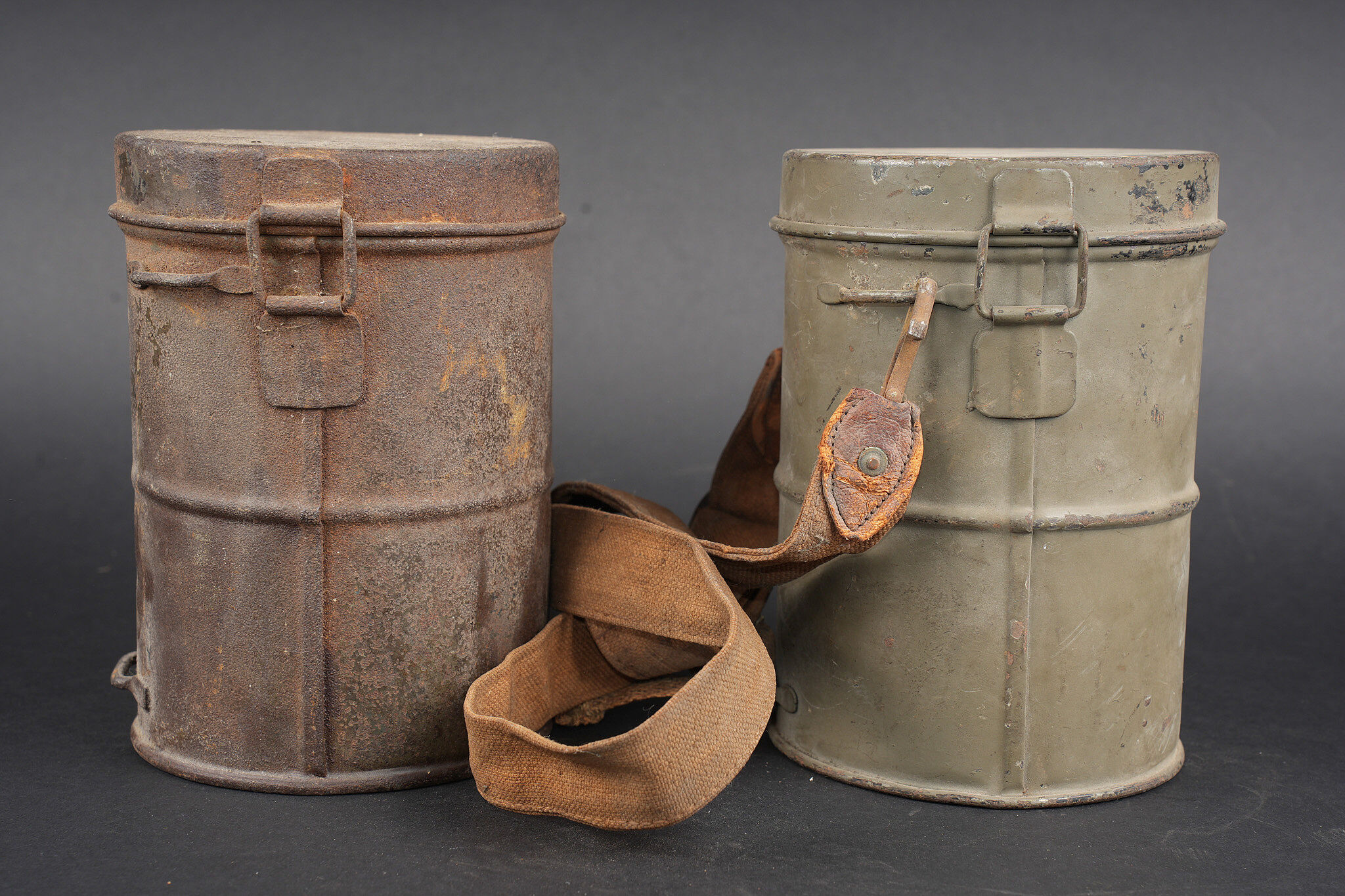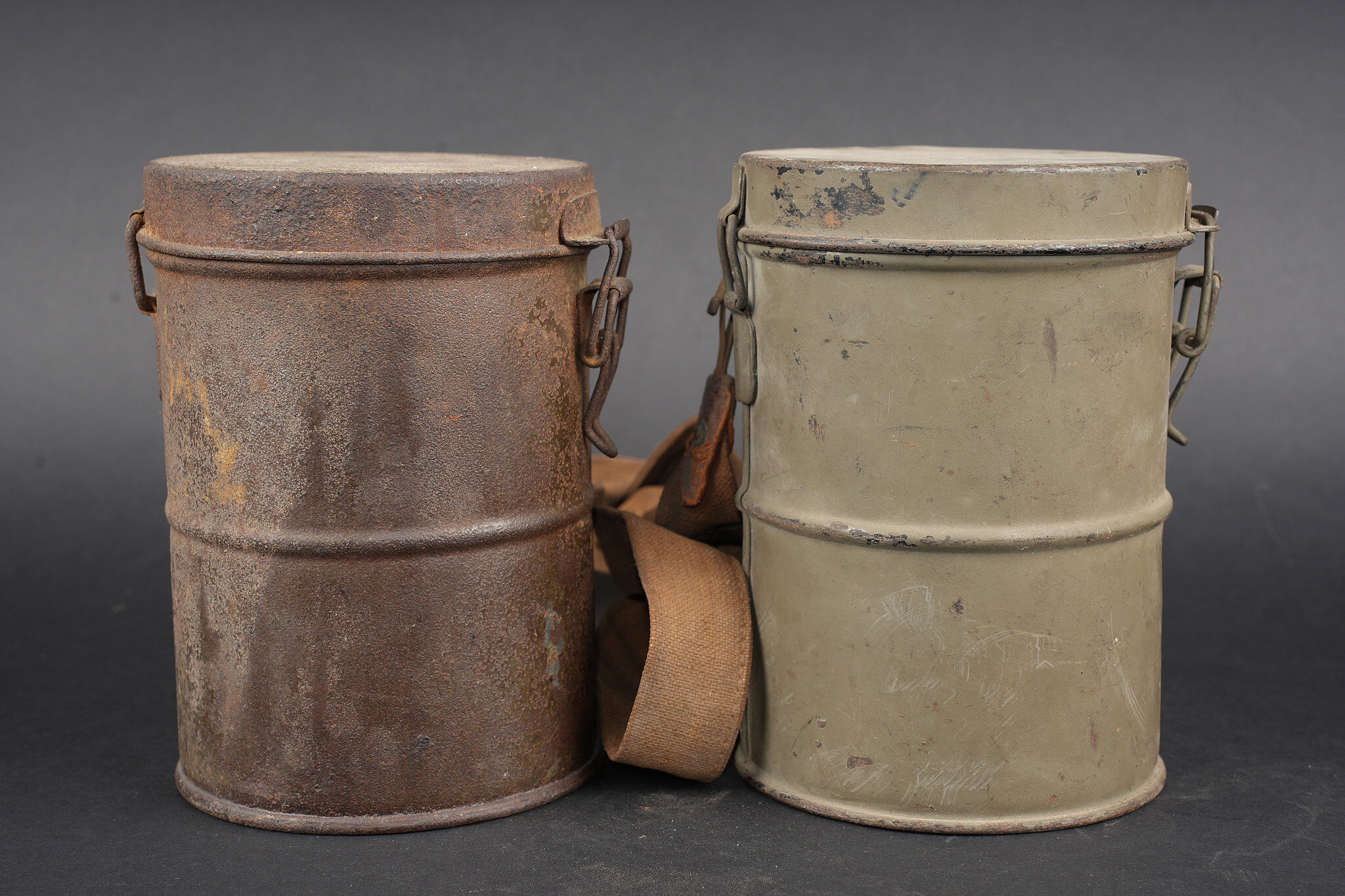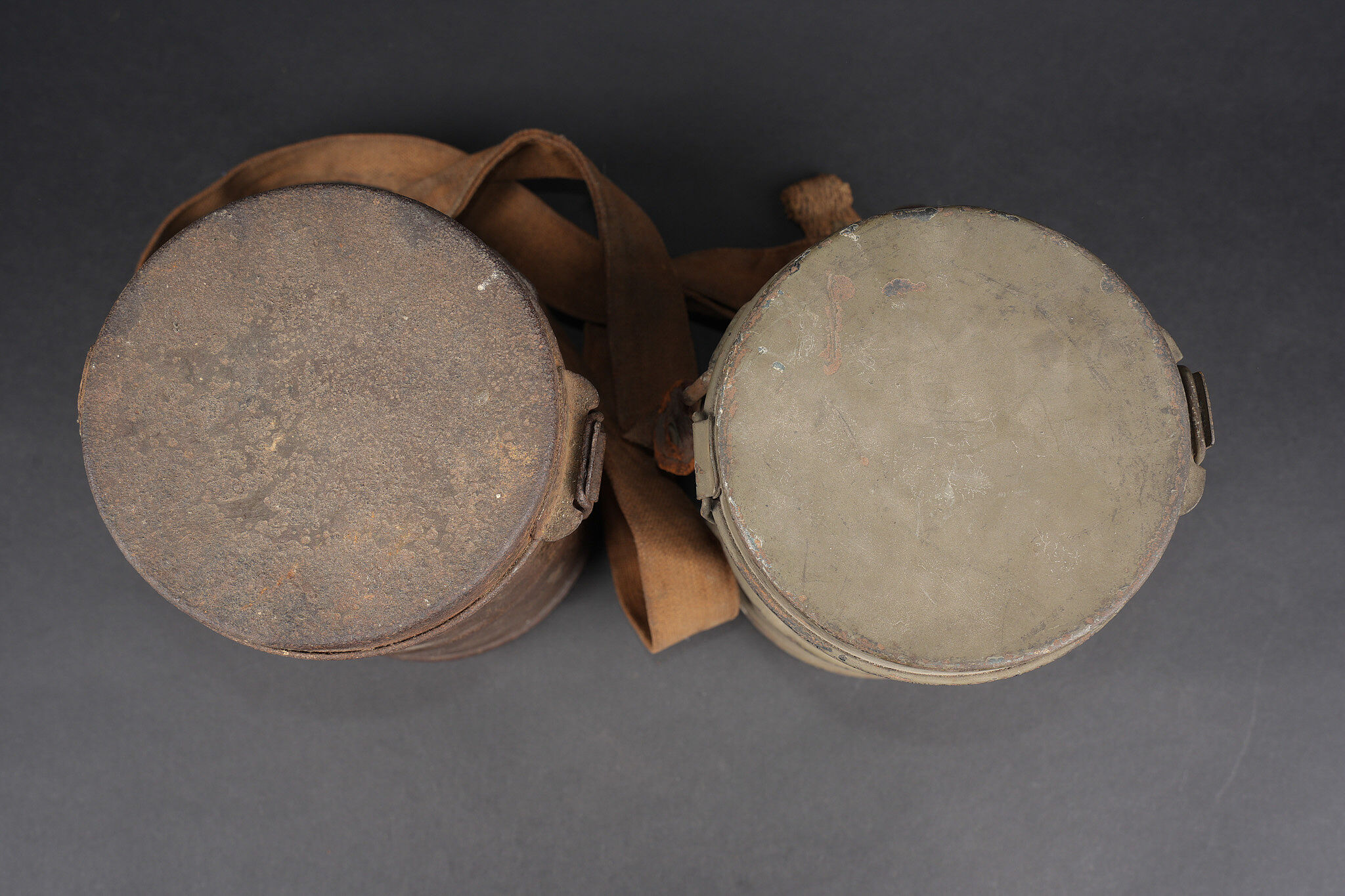 Lot de 2 boîtiers de masques anti-gaz allemands Lederschutzmaske. Lot of two German Lederschutzmaske gas mask containers.