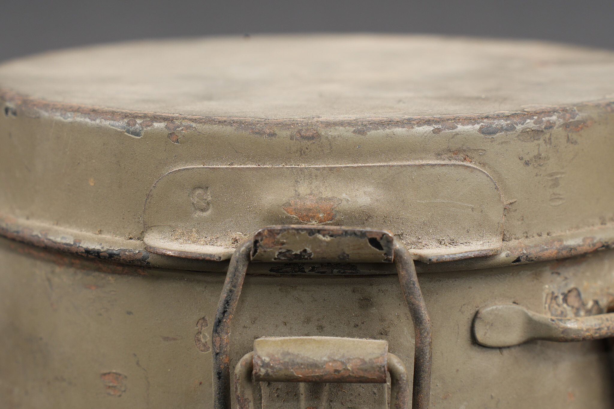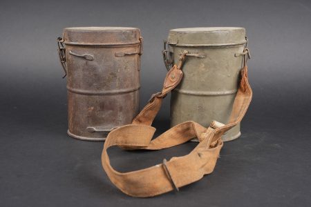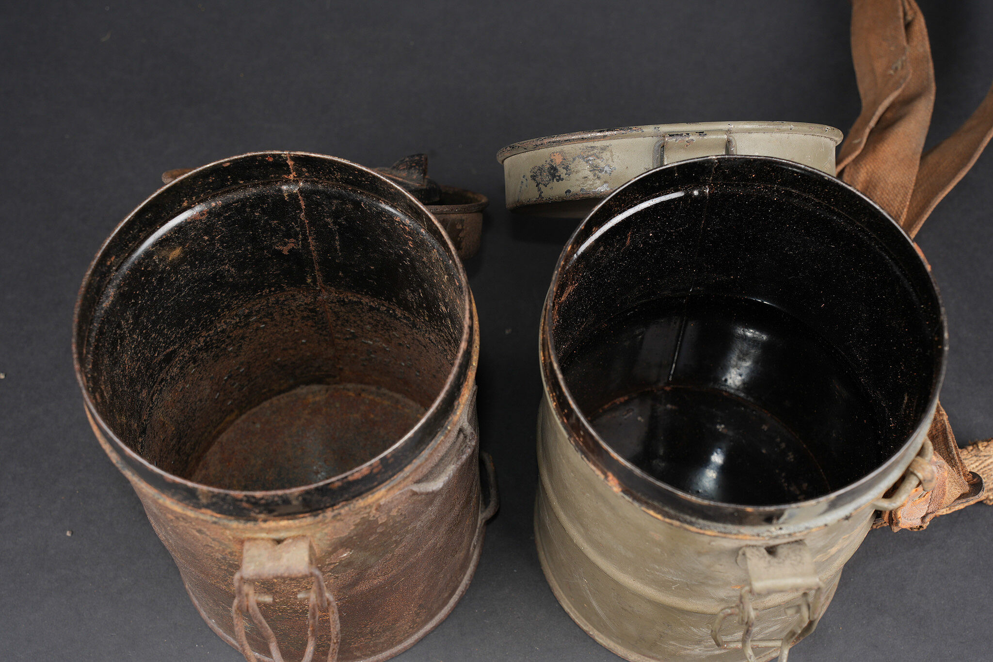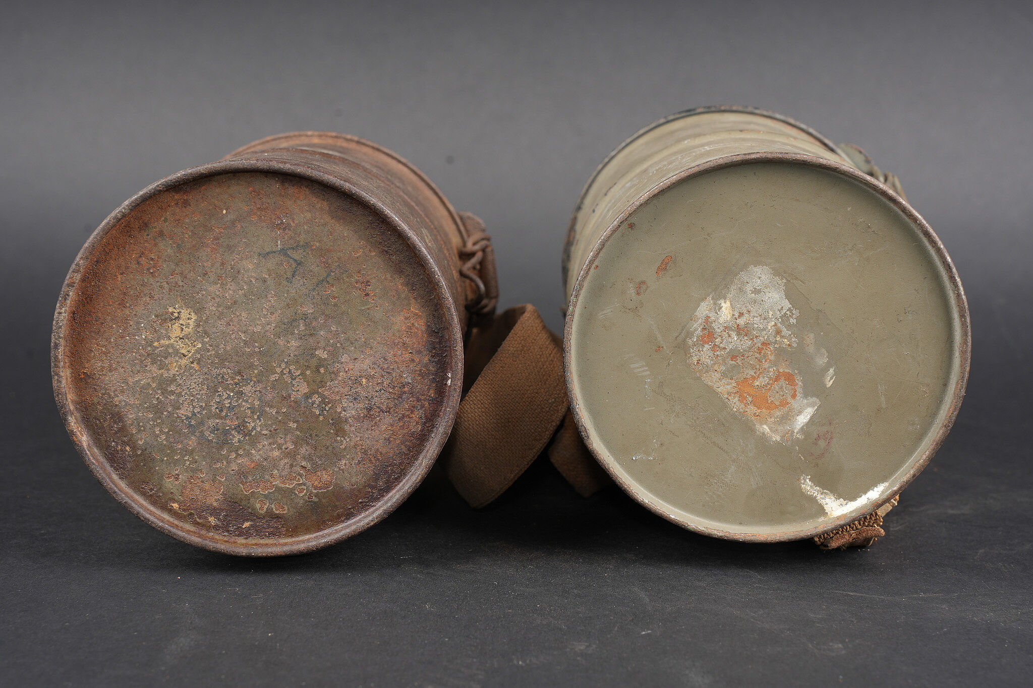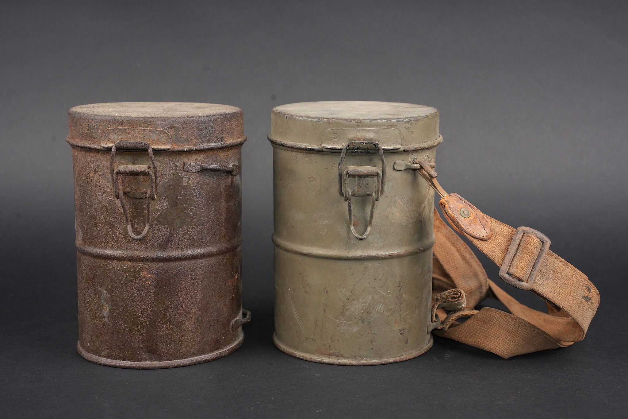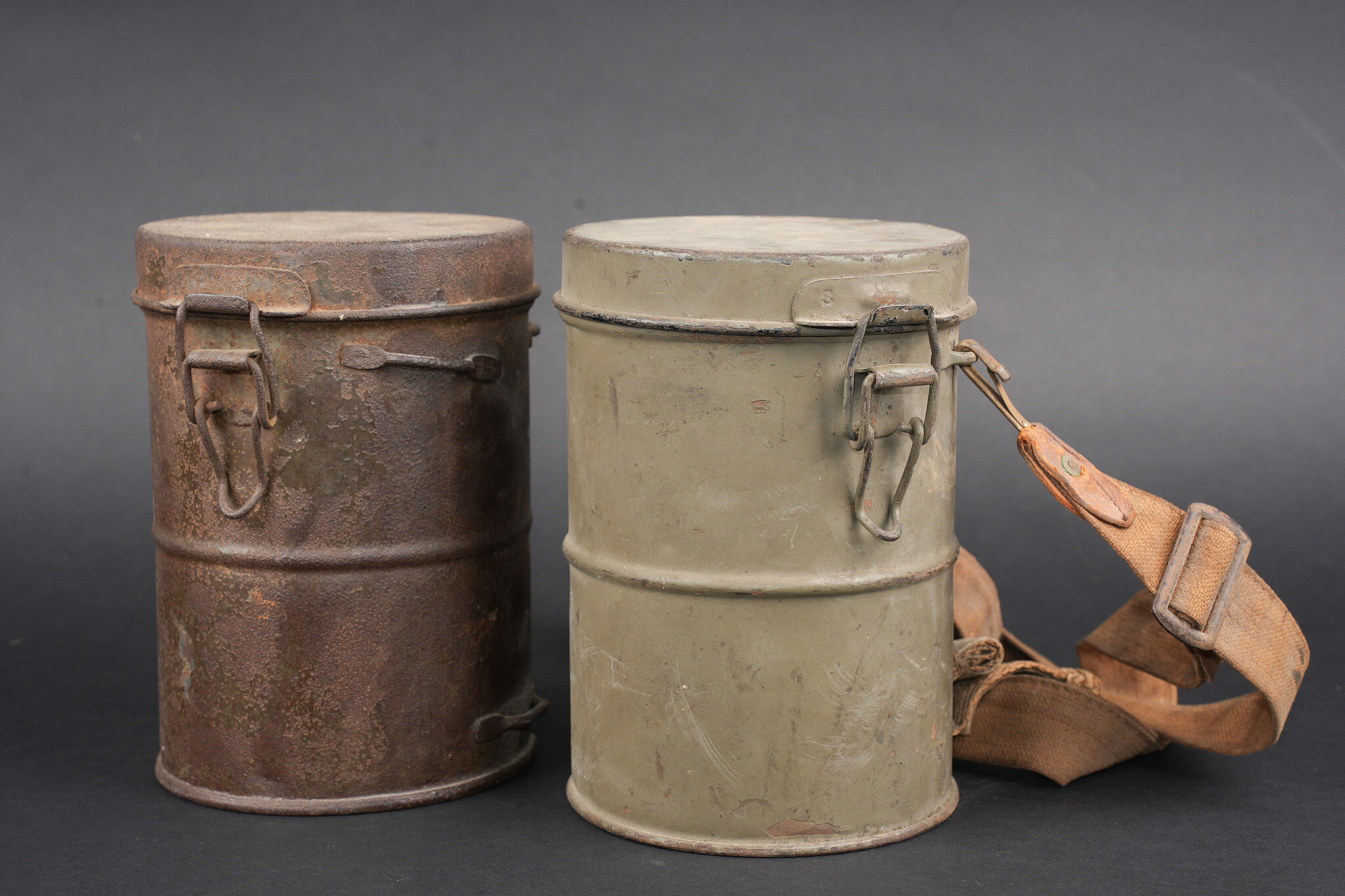 Lot de 2 boîtiers de masques anti-gaz allemands Lederschutzmaske. Lot of two German Lederschutzmaske gas mask containers.