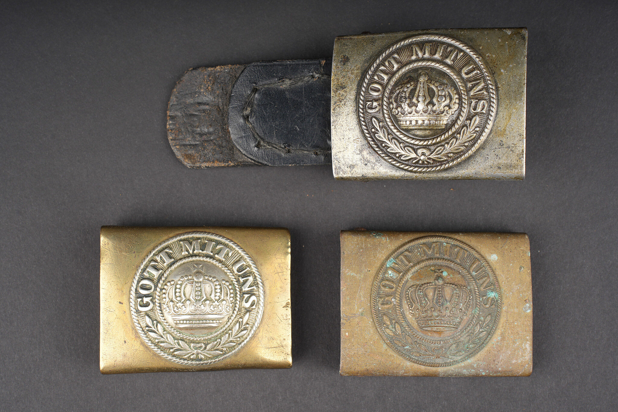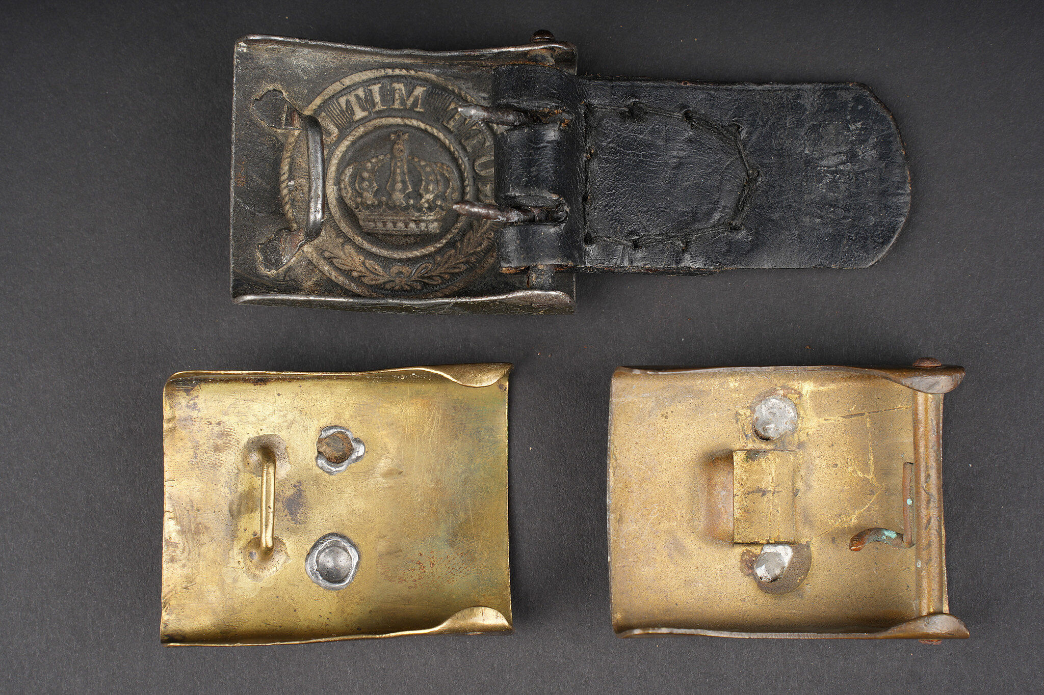 Lot de 3 boucles de ceinturon prussiennes. Une boucle M1895 sans son axe à ardillons, une boucle M1895 avec couronne ancien modèle, manque un ardillon, et une boucle M1915 en fer, sans peinture, patelette cuir postérieure. Usure d’usage. Three Prussian belt buckles including one Prussian belt buckle M1895 lacking its tongue bar, one M1895 buckle with early crown pattern missing one prong, and one Prussian belt buckle M1915 in steel without paint and with later leather tab. Service wear throughout.