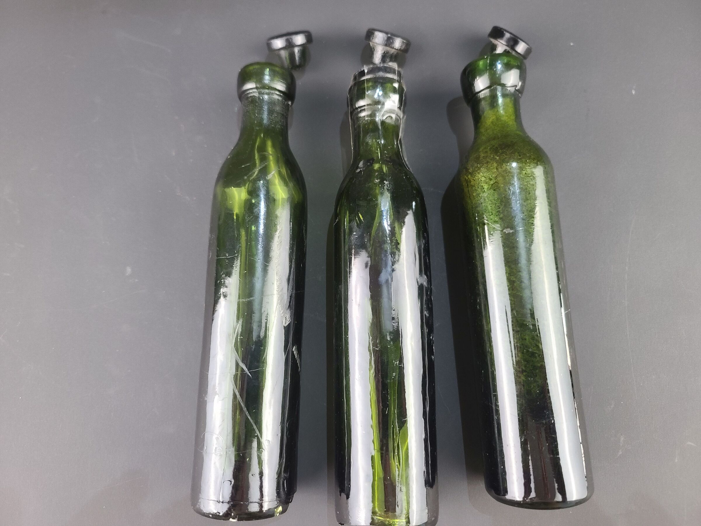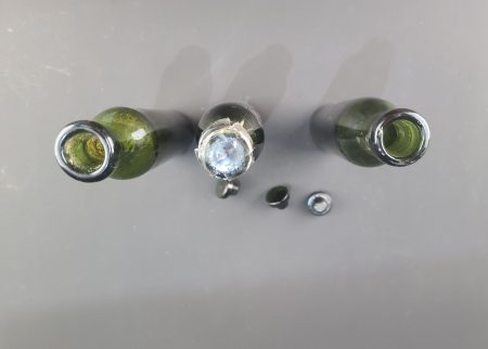 Lot de 3 flacons en verre pour obus à gaz allemands. Lot of three German glass flasks for gas shells