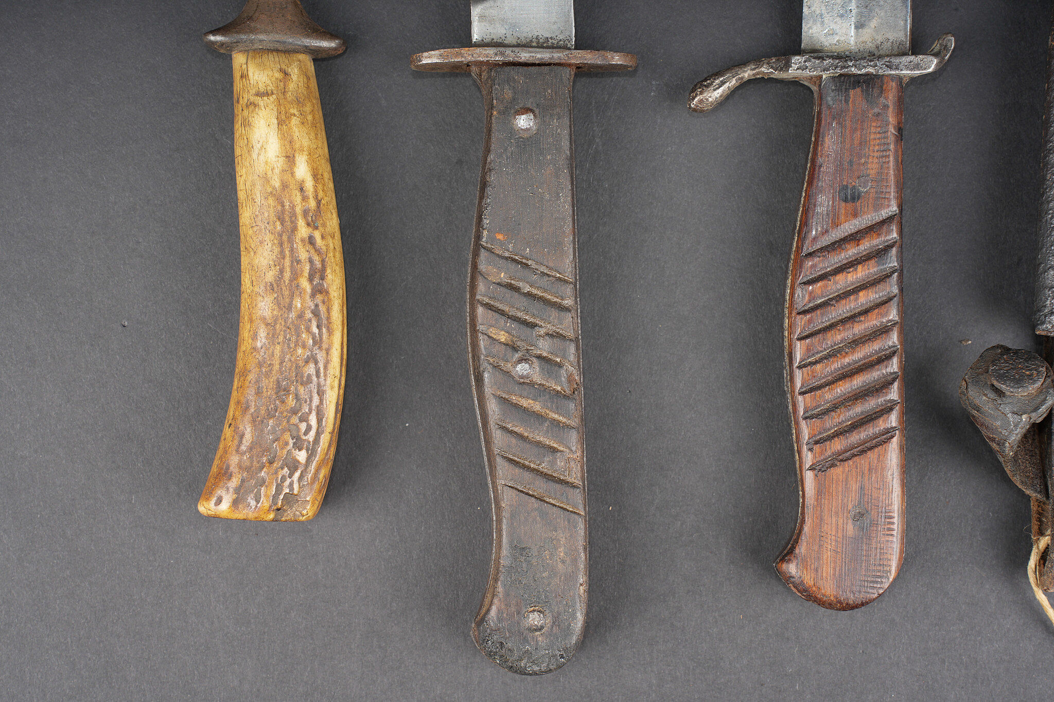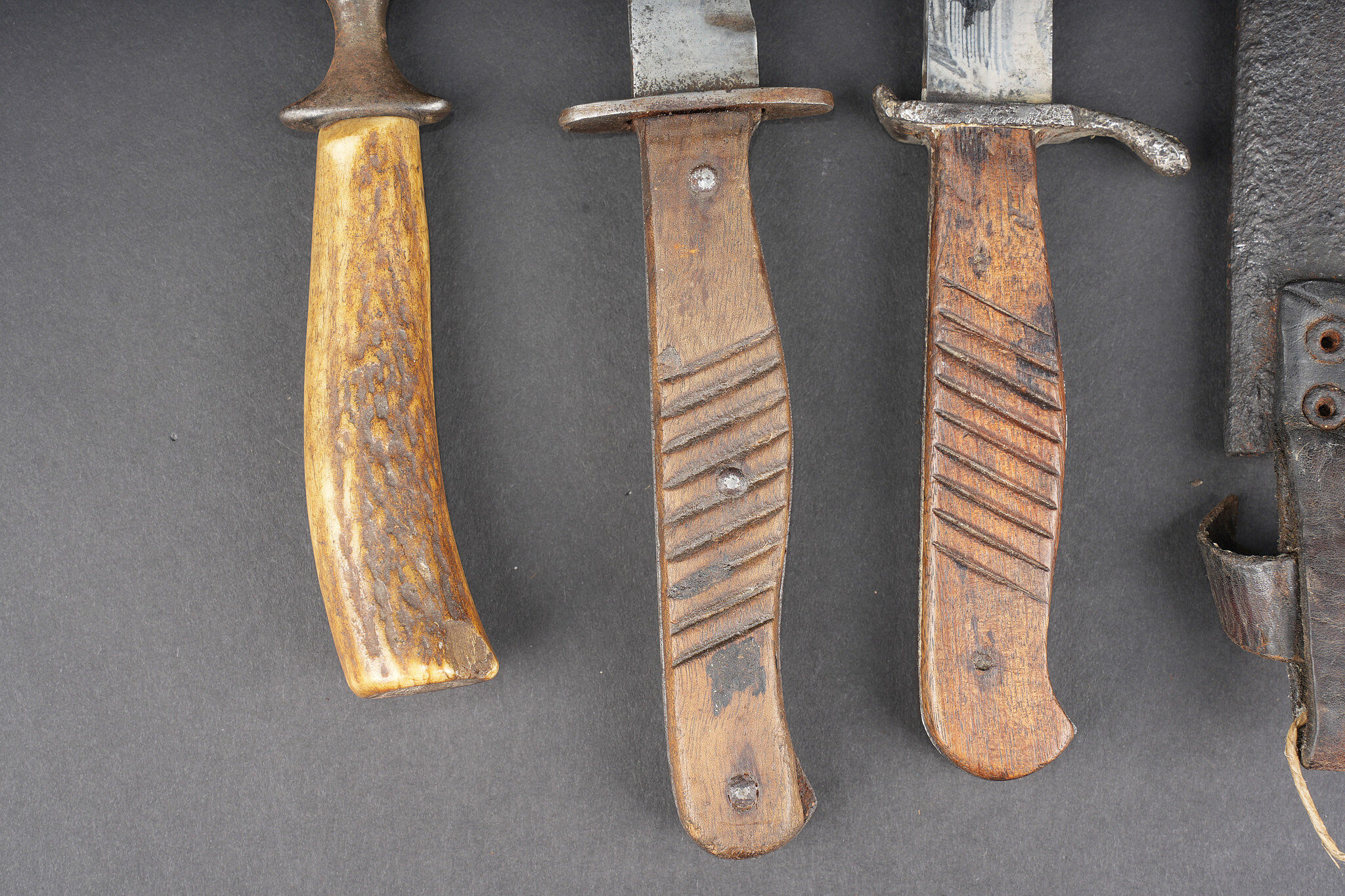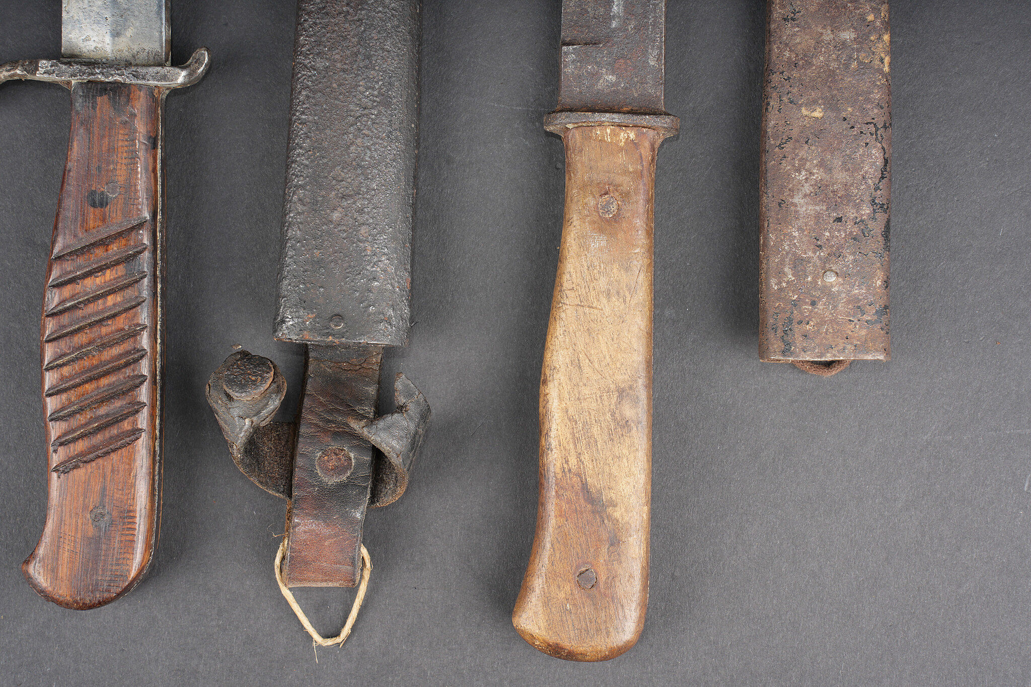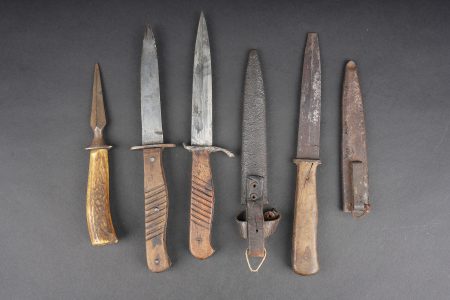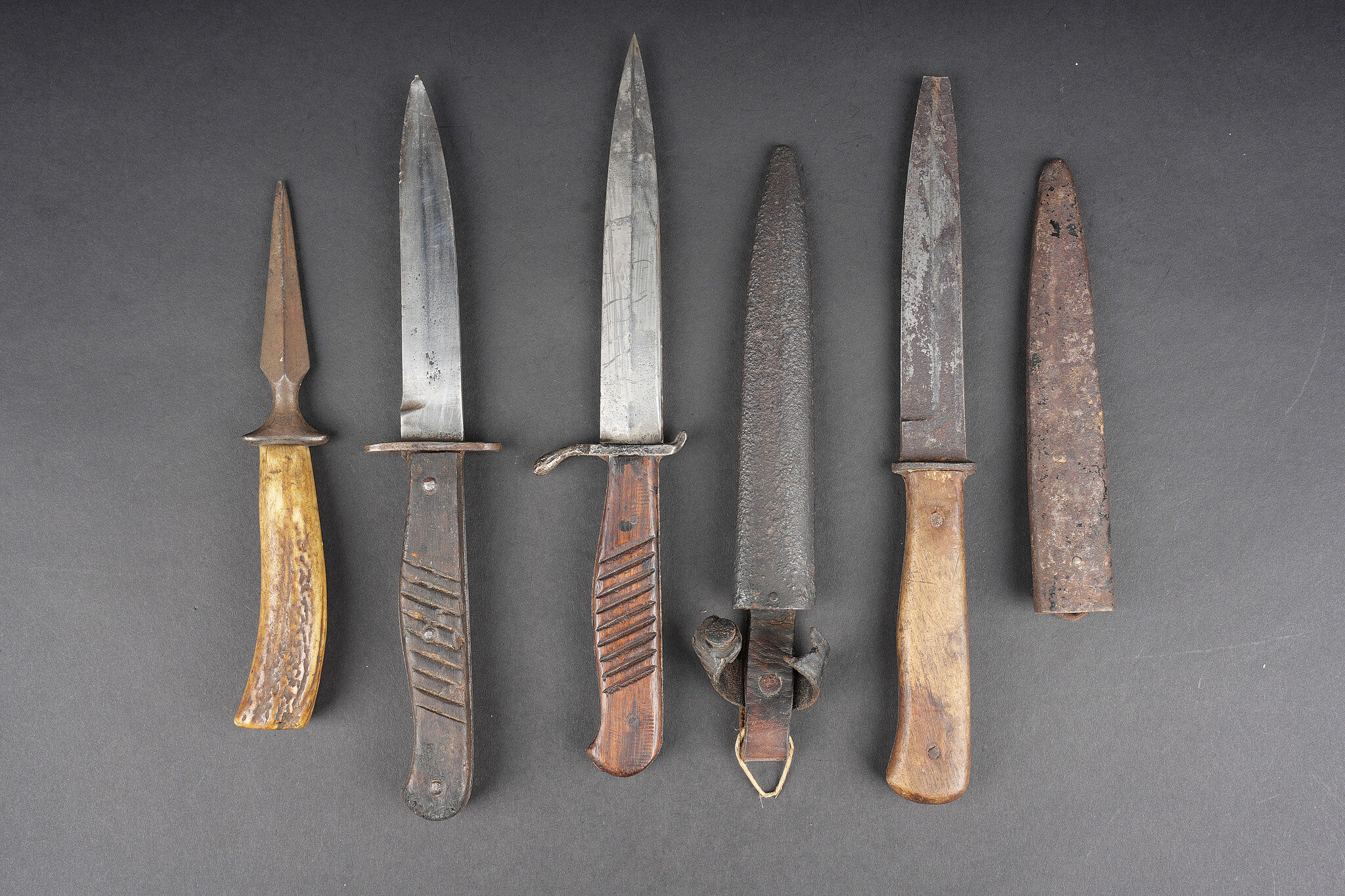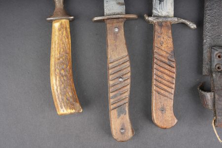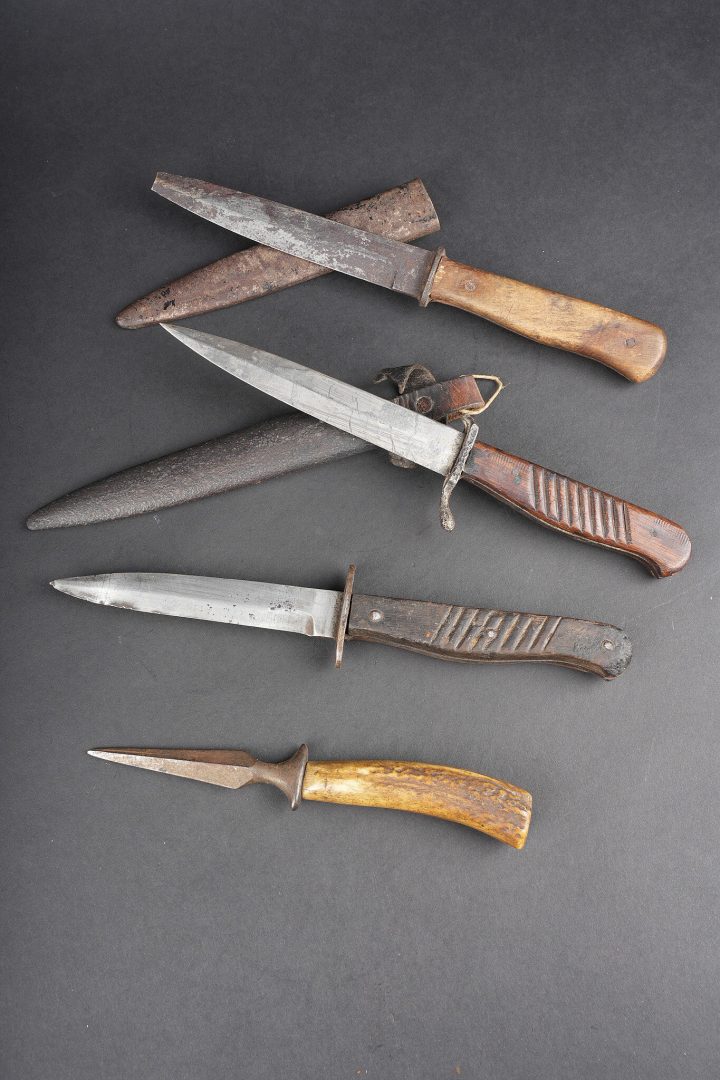 Lot de 4 poignards de combat allemands. Un poignard avec fourreau fer oxydé et passant cuir avec manque, belles lame et plaquettes mais croisière oxydée. Un poignard lame déformée, sans fourreau. Un poignard à plaquettes lisses, lame usée et oxydée, avec fourreau fer à passant métallique, écrasé, oxydé. Un poignard court à lame cruciforme, poignée corne, sans fourreau. Usure d’usage. Set of four German combat daggers including one dagger with oxidised steel scabbard and leather frog with loss, fine blade and grips but oxidised crossguard, one dagger with bent blade and no scabbard, one dagger with smooth grips and worn oxidised blade in crushed steel scabbard with metal suspension clip, and one short cruciform blade dagger with horn grip, without scabbard. Service wear.