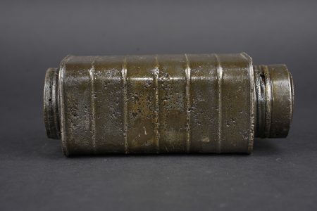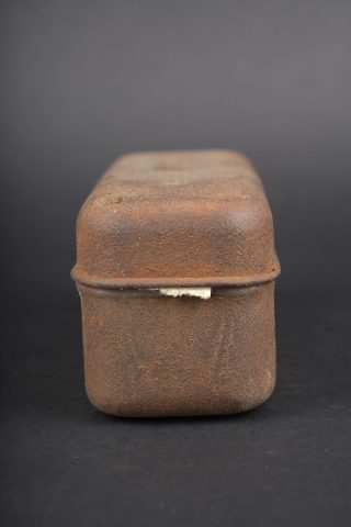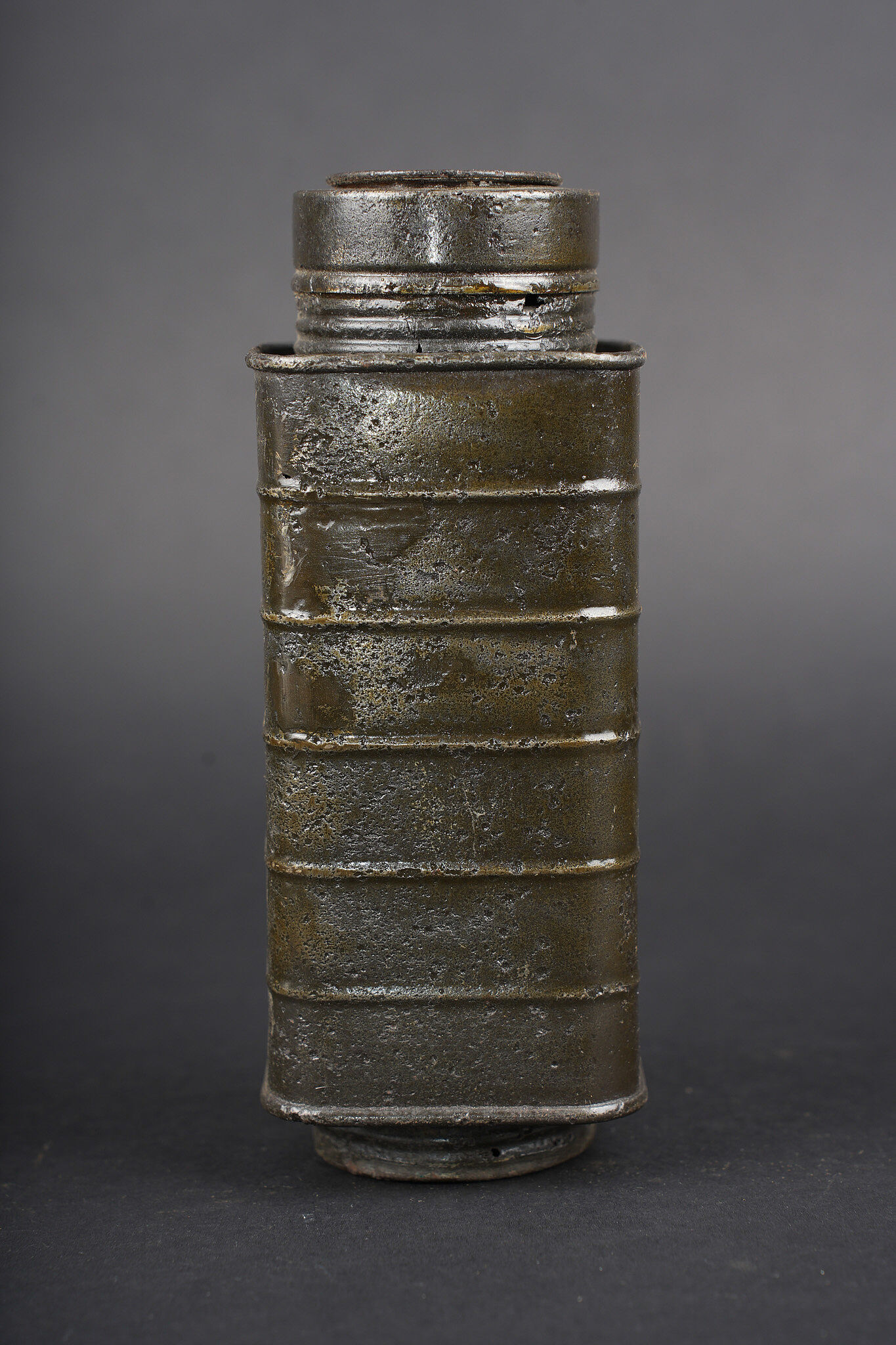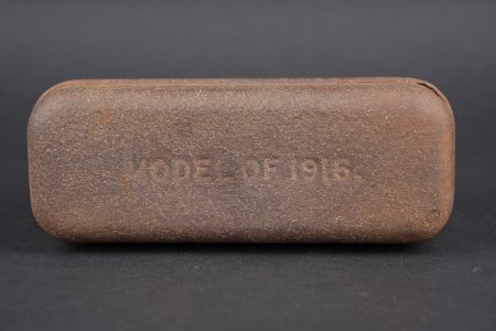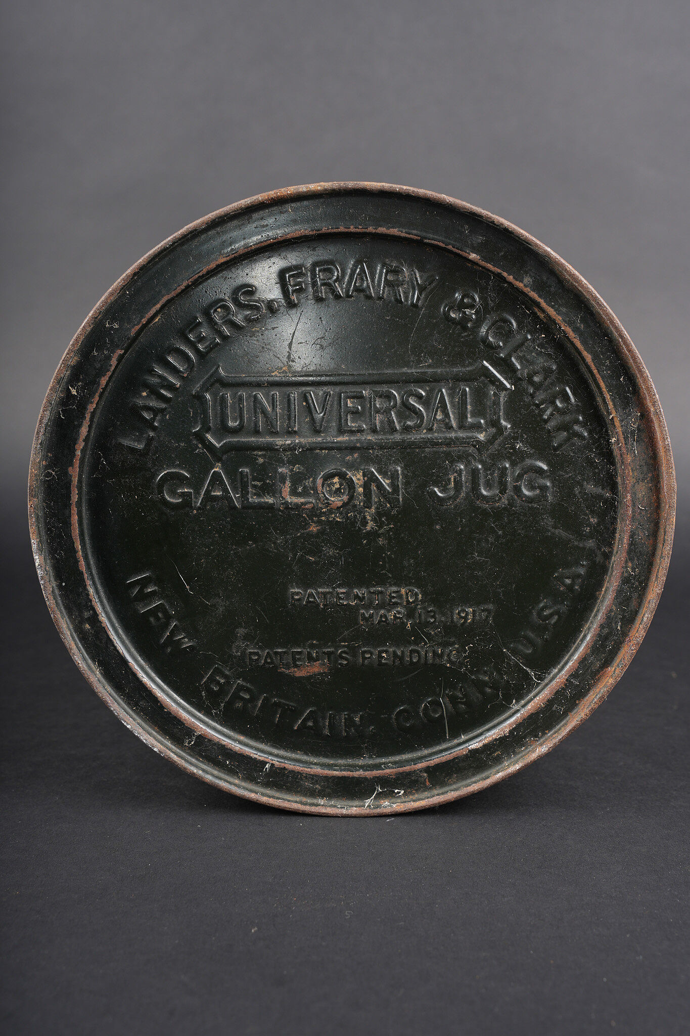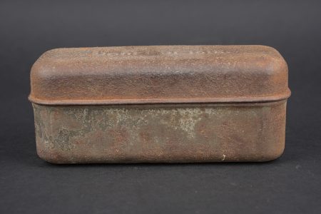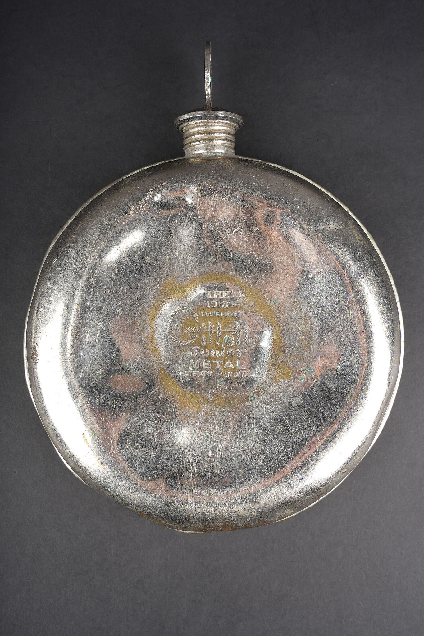 Lot de cuisine US ww1. Composé d’un thermos, intérieur en grès, enveloppe métallique marquée au dessous Universal Gallon Jug patented 1917. Une boîte à viande Model of 1916. Une boîte à condiments du terrain. Et une gourde ou bouillote marquée The 1918 Gilette Junior en métal étamé, avec son bouchon. Usure d’usage, patine. US WWI kitchen lot including one thermos with stoneware interior and metal outer body marked underneath Universal Gallon Jug patented 1917, one meat can model 1916, one field condiment tin, and one tinned metal bottle or hot-water flask marked The 1918 Gillette Junior with stopper. Wear and patina.