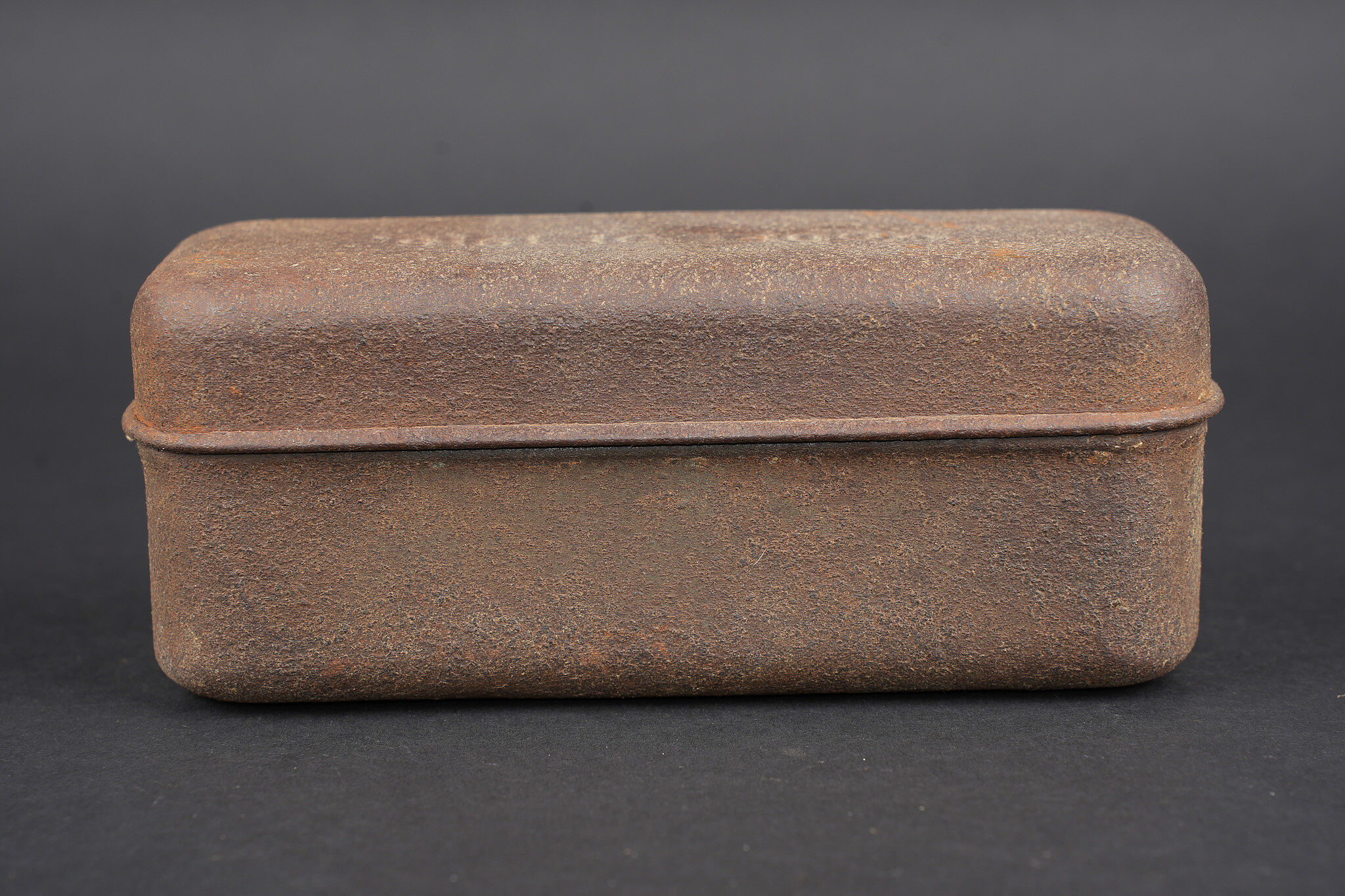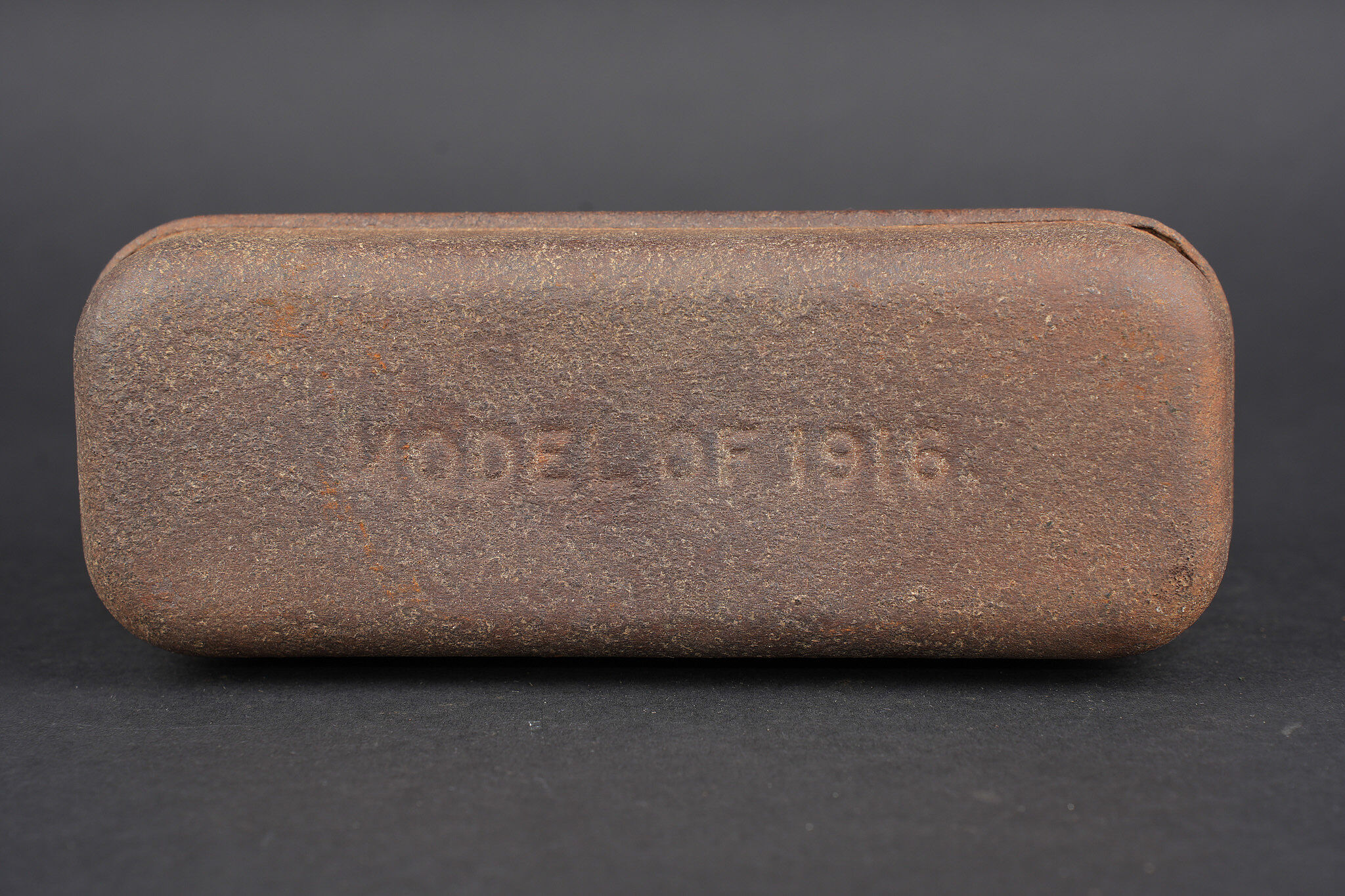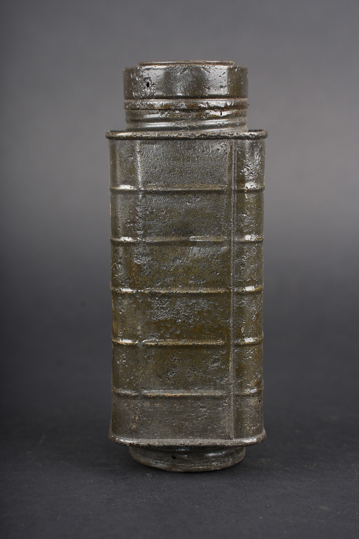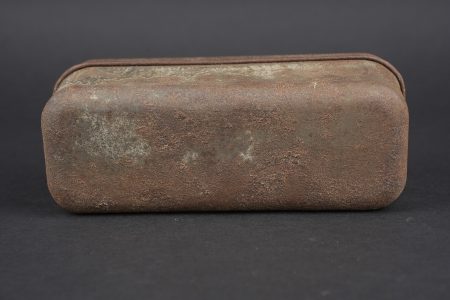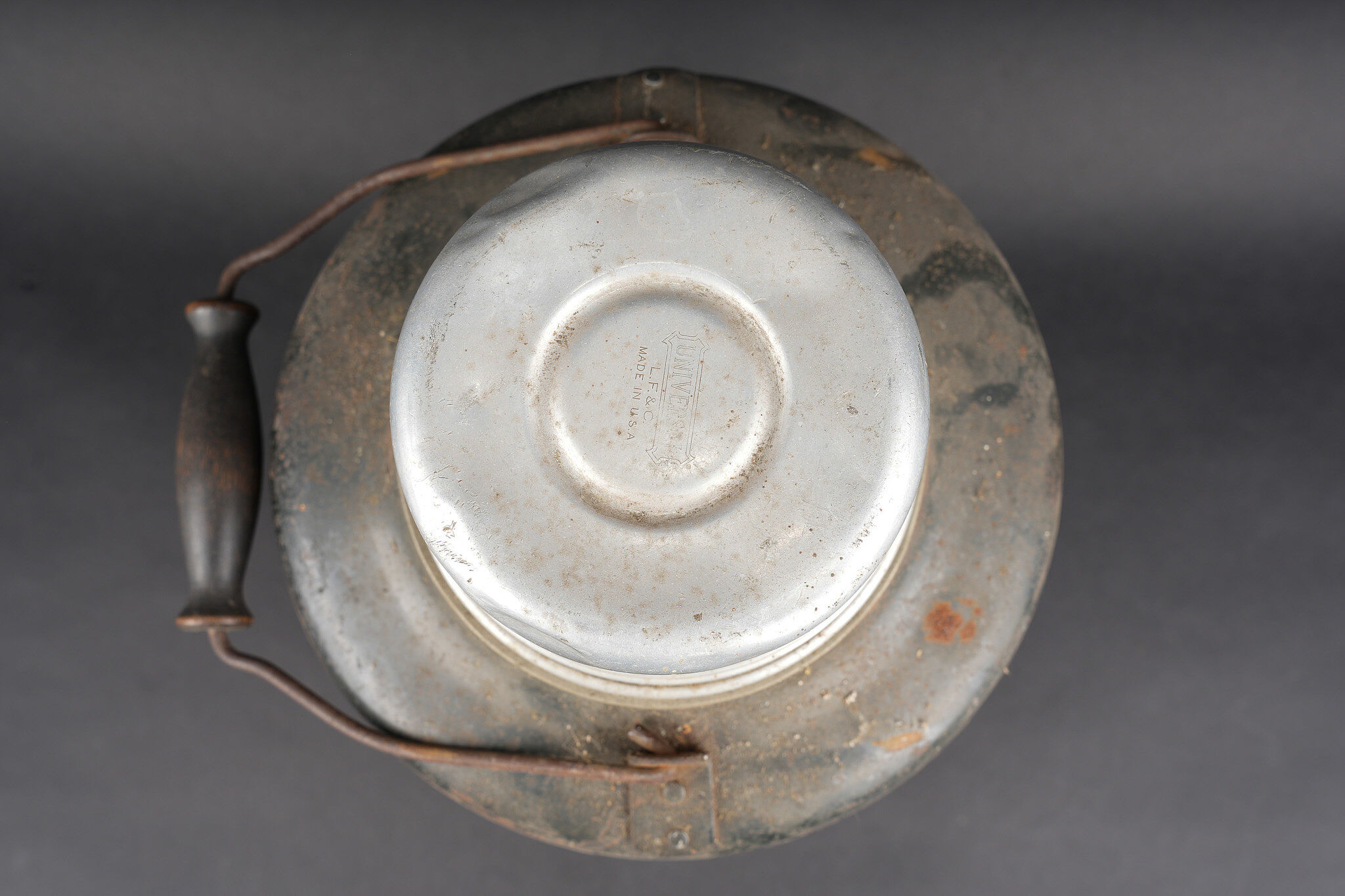 Lot de cuisine US ww1. Composé d’un thermos, intérieur en grès, enveloppe métallique marquée au dessous Universal Gallon Jug patented 1917. Une boîte à viande Model of 1916. Une boîte à condiments du terrain. Et une gourde ou bouillote marquée The 1918 Gilette Junior en métal étamé, avec son bouchon. Usure d’usage, patine. US WWI kitchen lot including one thermos with stoneware interior and metal outer body marked underneath Universal Gallon Jug patented 1917, one meat can model 1916, one field condiment tin, and one tinned metal bottle or hot-water flask marked The 1918 Gillette Junior with stopper. Wear and patina.