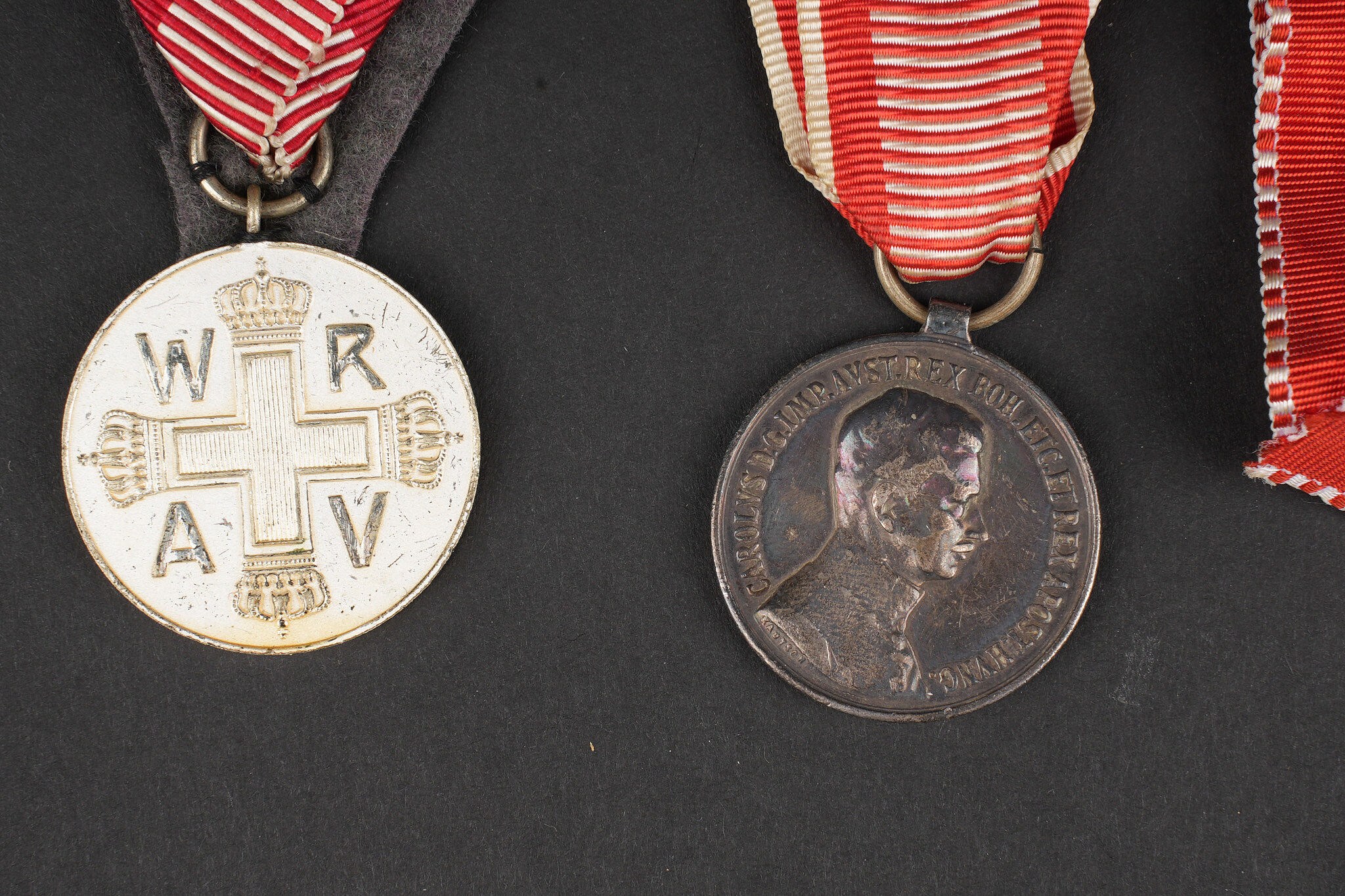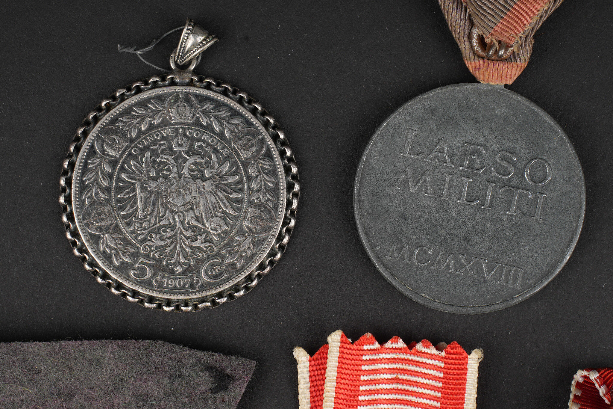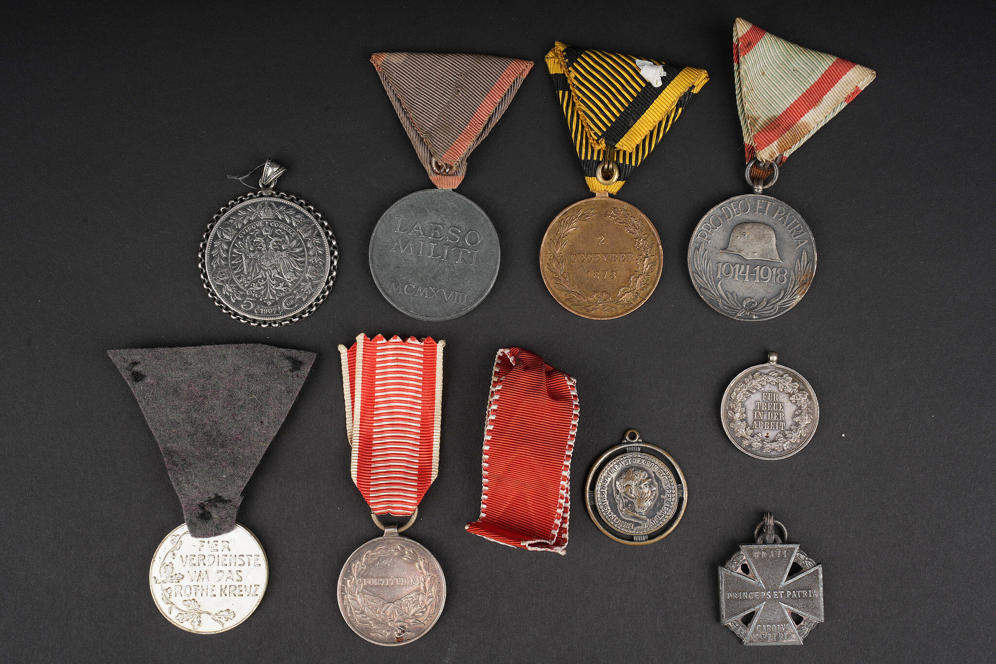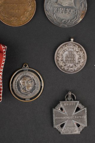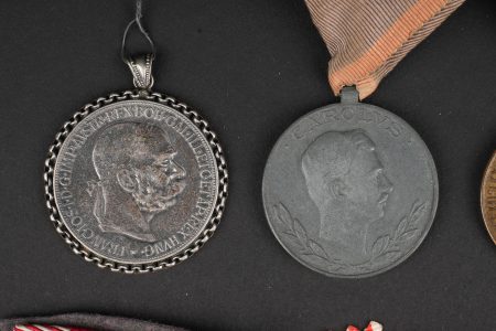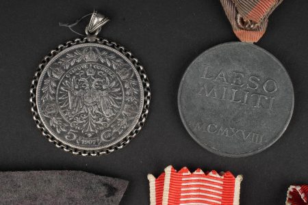 Lot de médailles Austro-Hongroises. 7 médailles dont Kriegsmedaille, médaille des blessés Laeso Militi, médaille de la Croix Rouge, médaille pour le courage Fortitudini, médaille du travail…on y joint 2 pendentifs réalisés avec des monnaies autrichiennes. Usure d’usage. Austro-Hungarian medal group of seven decorations including one Kriegsmedaille, one Laeso Militi wound medal, one Red Cross medal, one Fortitudini bravery medal, one labour medal, plus two pendants made from Austrian coins. Service wear and patina