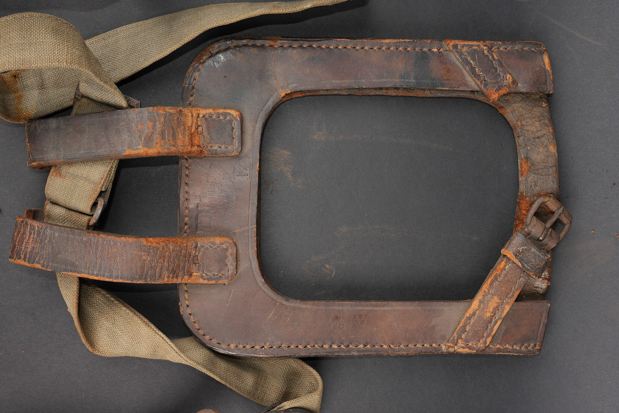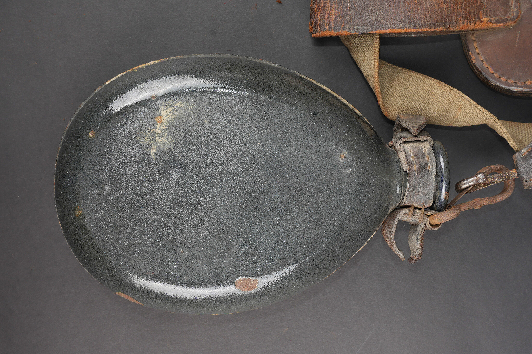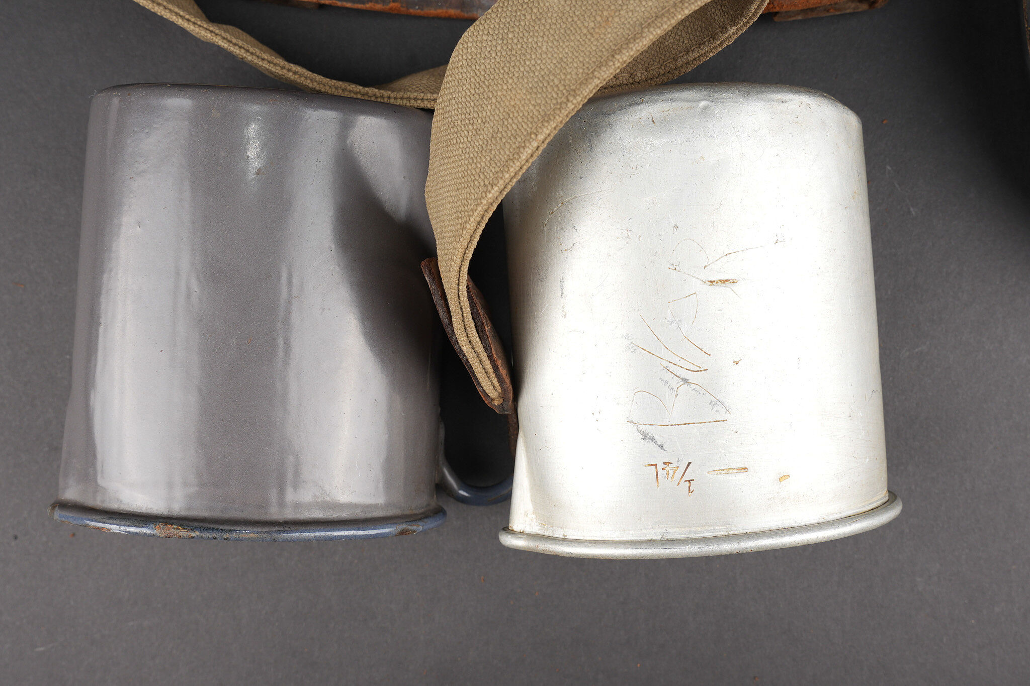 Lot d’équipements individuels allemands. Un bidon émaillé feldgrau avec son crochet, un quart émaillé FCB Fulda 1916, un quart aluminium du fabricant Schmidt de Würzen daté 1910, déformé, un porte pelle en cuir daté 1917, sangle de fermeture manquante et un passant coupé, et une sangle de sac à pain en toile. Usure d’usage. German individual equipment lot including one feldgrau enamel canteen with hook, one enamel cup marked FCB Fulda dated 1916, one aluminium cup by Schmidt dated 1910 and deformed, one leather entrenching tool carrier dated 1917 with missing closing strap and one cut loop, plus one canvas bread bag strap. Service wear and patina