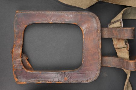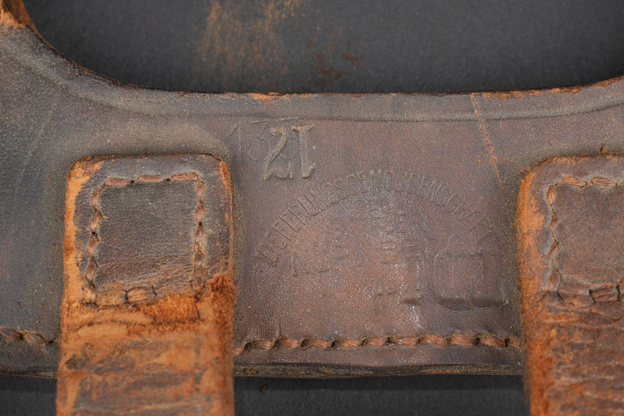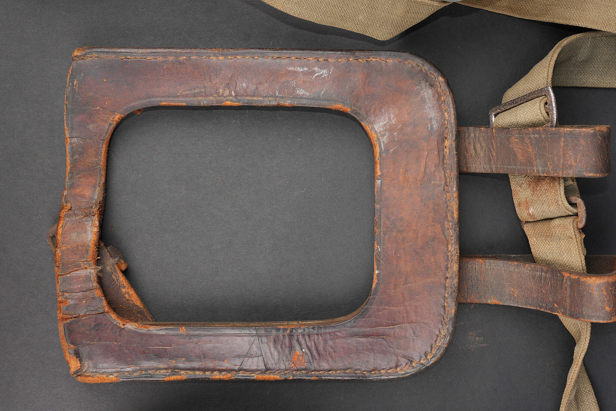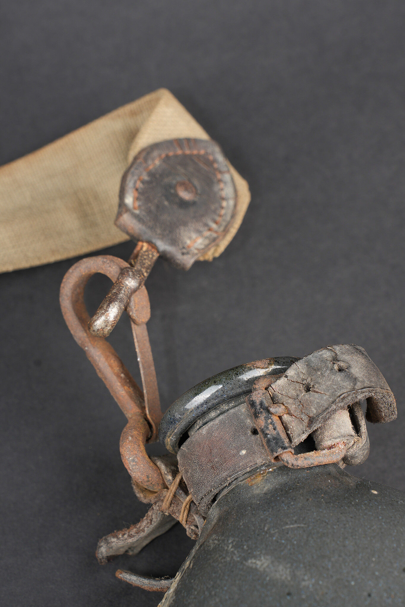 Lot d’équipements individuels allemands. Un bidon émaillé feldgrau avec son crochet, un quart émaillé FCB Fulda 1916, un quart aluminium du fabricant Schmidt de Würzen daté 1910, déformé, un porte pelle en cuir daté 1917, sangle de fermeture manquante et un passant coupé, et une sangle de sac à pain en toile. Usure d’usage. German individual equipment lot including one feldgrau enamel canteen with hook, one enamel cup marked FCB Fulda dated 1916, one aluminium cup by Schmidt dated 1910 and deformed, one leather entrenching tool carrier dated 1917 with missing closing strap and one cut loop, plus one canvas bread bag strap. Service wear and patina
