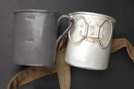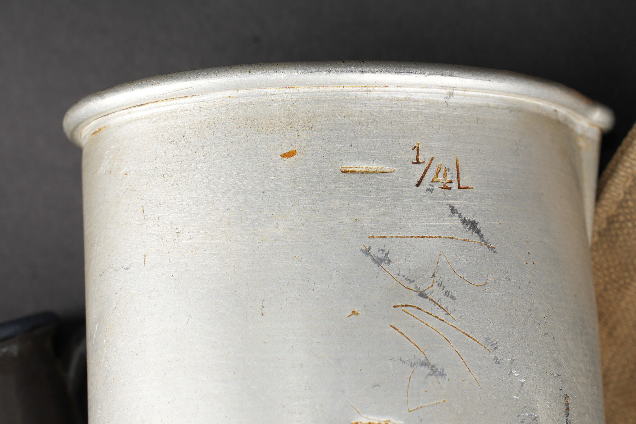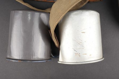 Lot d’équipements individuels allemands. Un bidon émaillé feldgrau avec son crochet, un quart émaillé FCB Fulda 1916, un quart aluminium du fabricant Schmidt de Würzen daté 1910,... en savoir plus