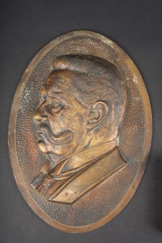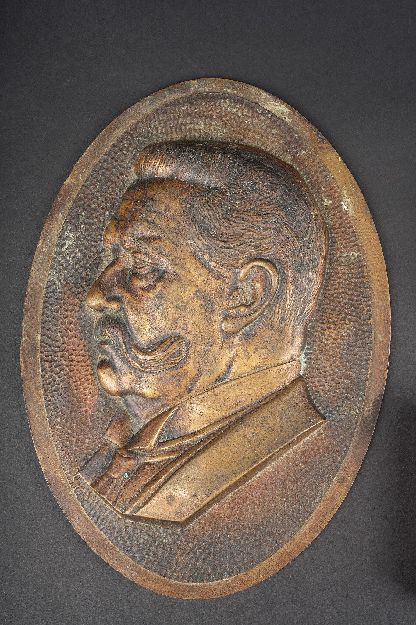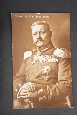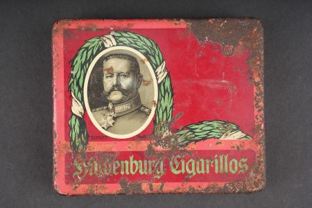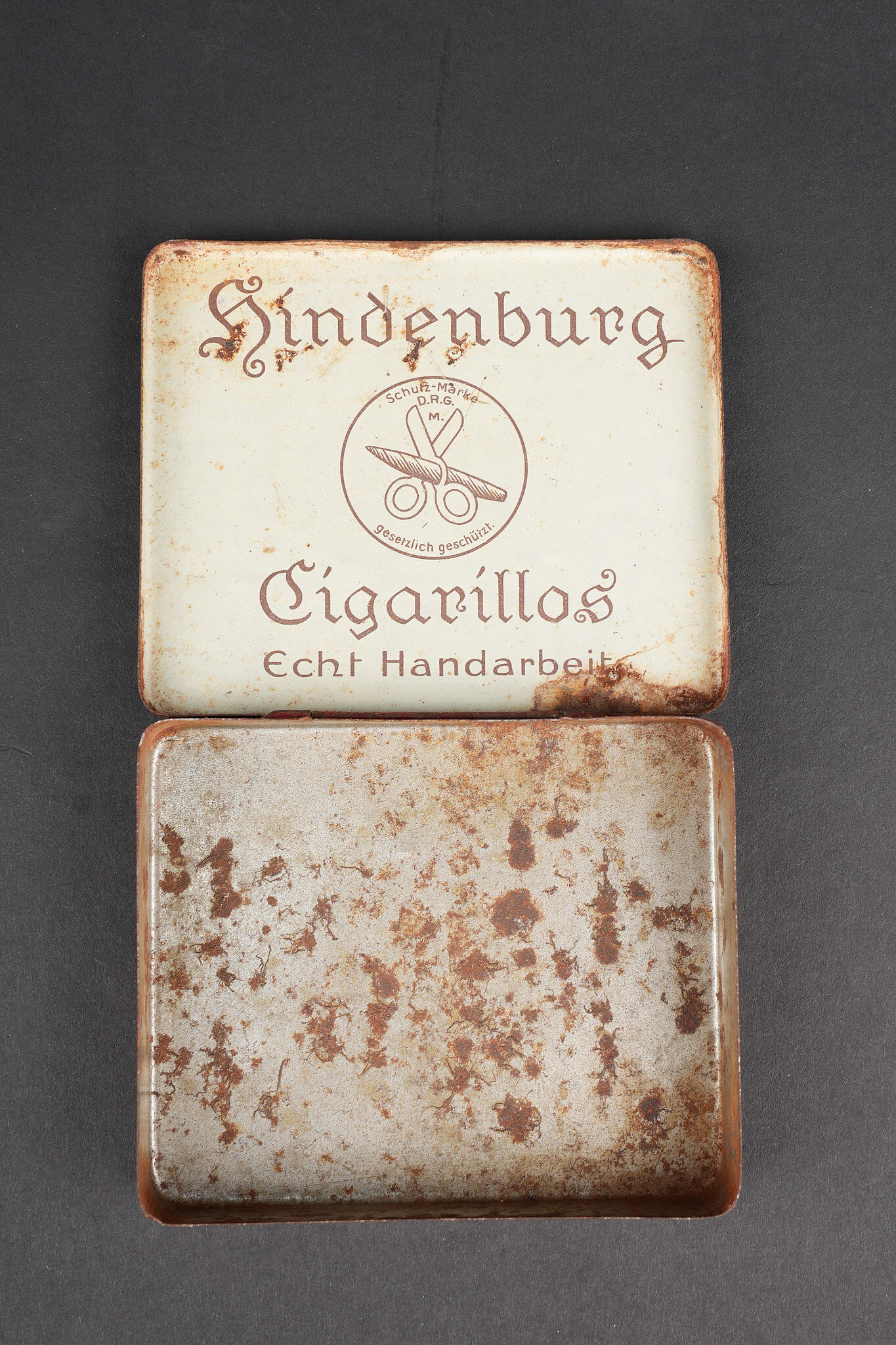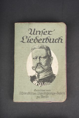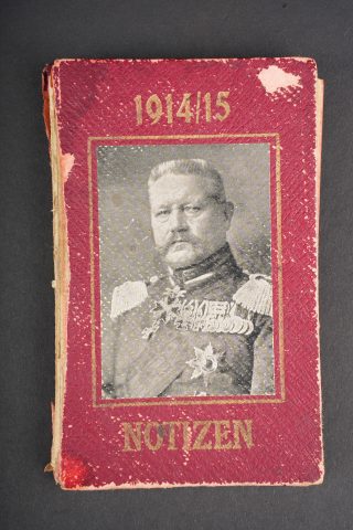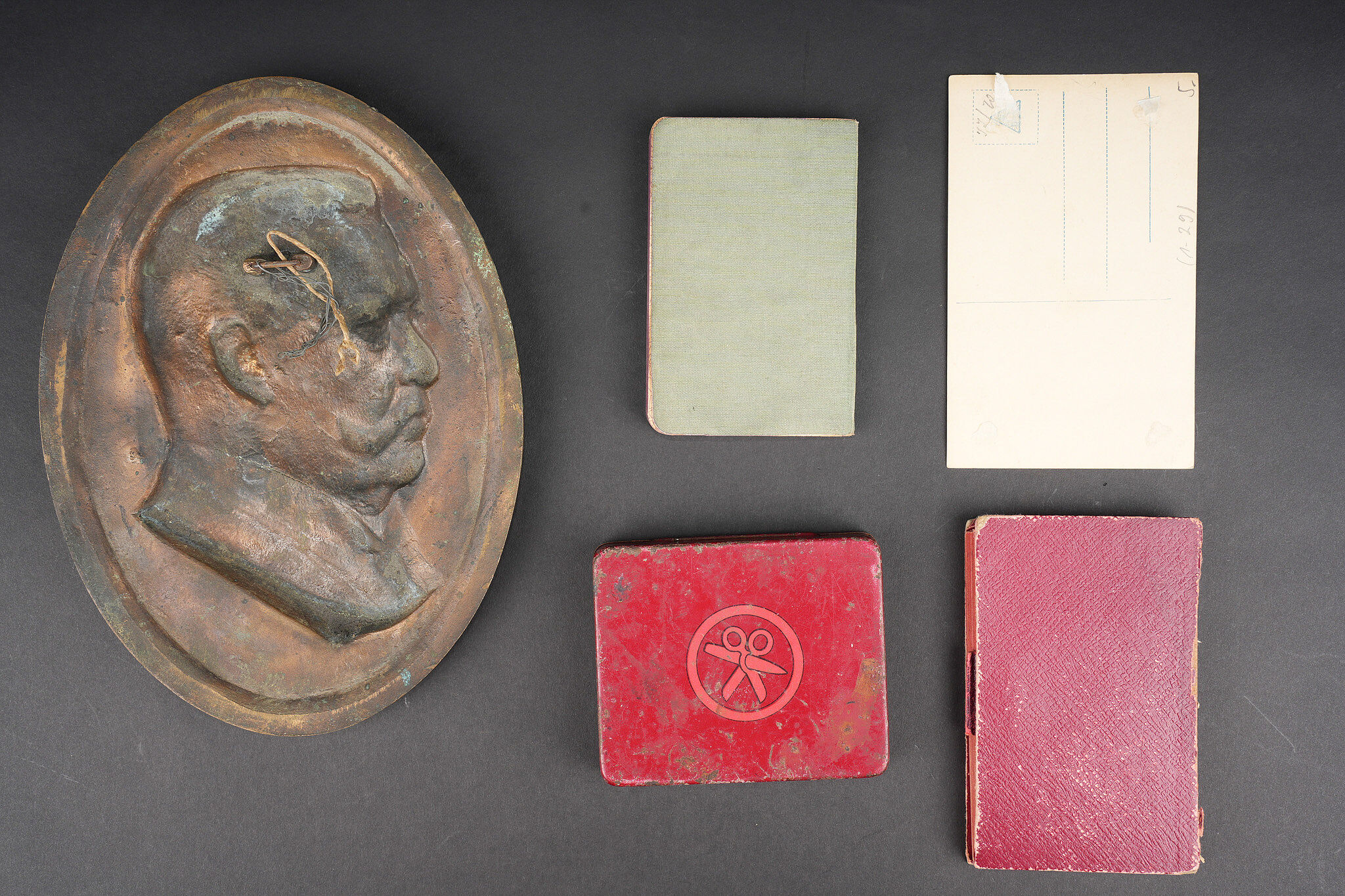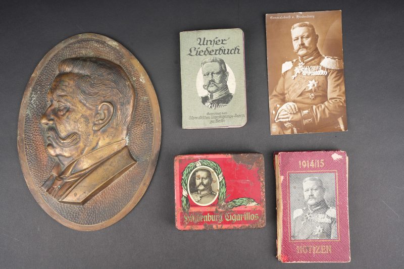 Lot d’objets patriotiques à l’effigie du Maréchal von Hindenburg. Joli lot composé d’un carnet 1914-1915, rempli d’inventaires de nourriture et objets avec prix, couverture arrière détachée. Un livret de chants, une carte postale, une boîte de cigarillos, et un grand médaillon ovale en bronze, d’une hauteur de 22,5 cm. Usure d’usage, patine. Patriotic lot dedicated to Paul von Hindenburg including one 1914–1915 notebook filled with food and object inventories with prices, rear cover detached, one song booklet, one postcard, one cigarillo tin and one large oval bronze medallion approximately 22.5 cm high. Service wear and patina