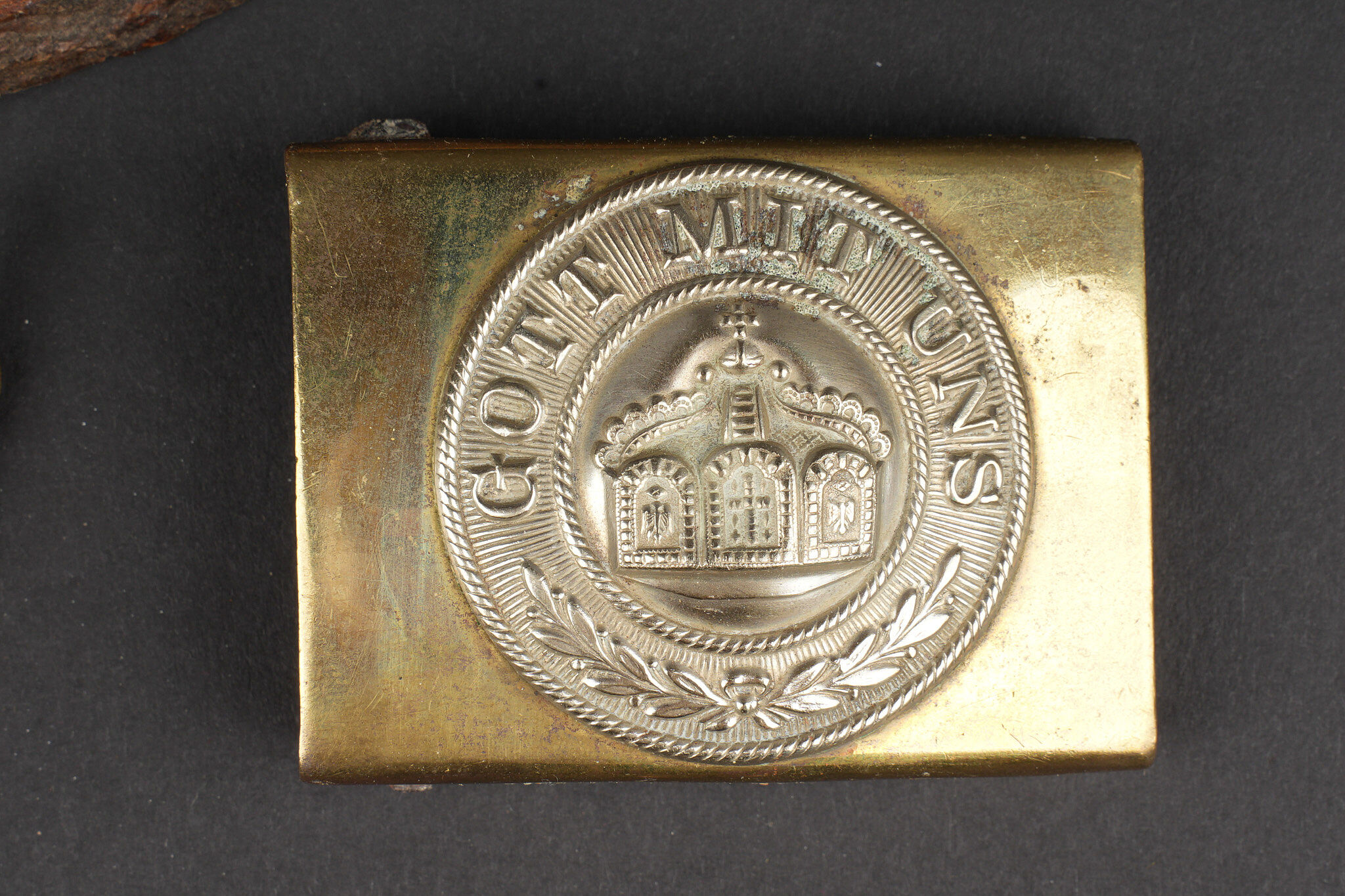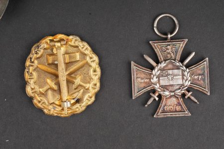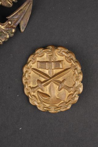 Détails de la vente >Marine allemande en Flandres 1914-1918. Une boucle Marine M1895 laiton, ardillons manquants, une plaque de Tschako SeeBataillon en laiton sans attaches, un insigne des blessés Marine or, un... en savoir plus