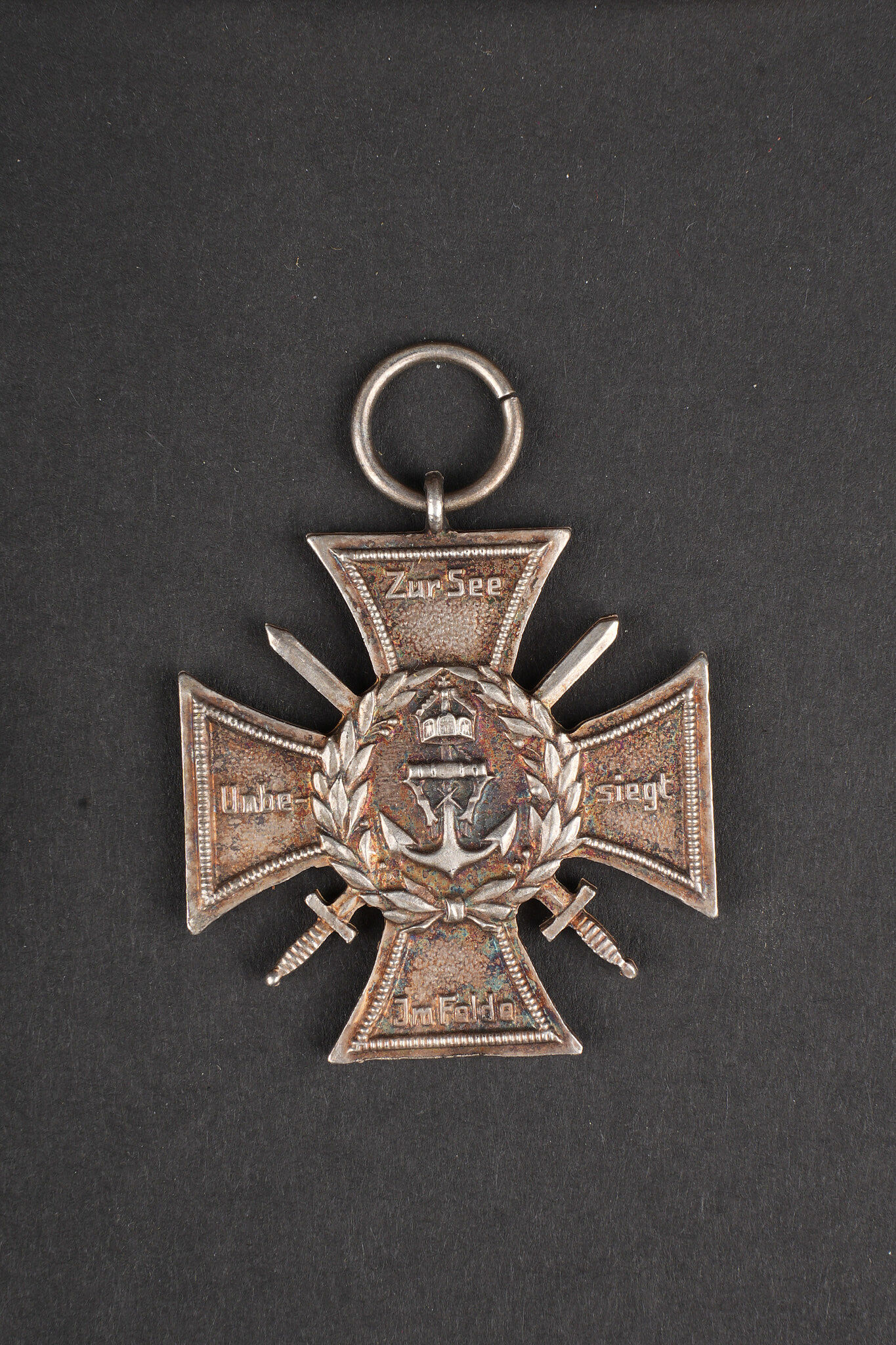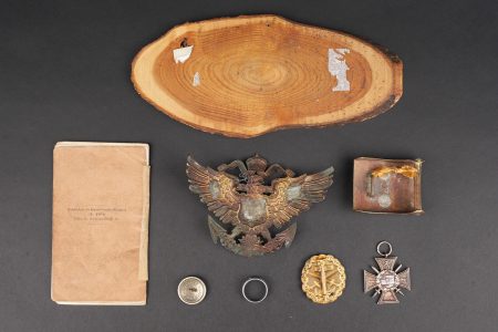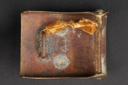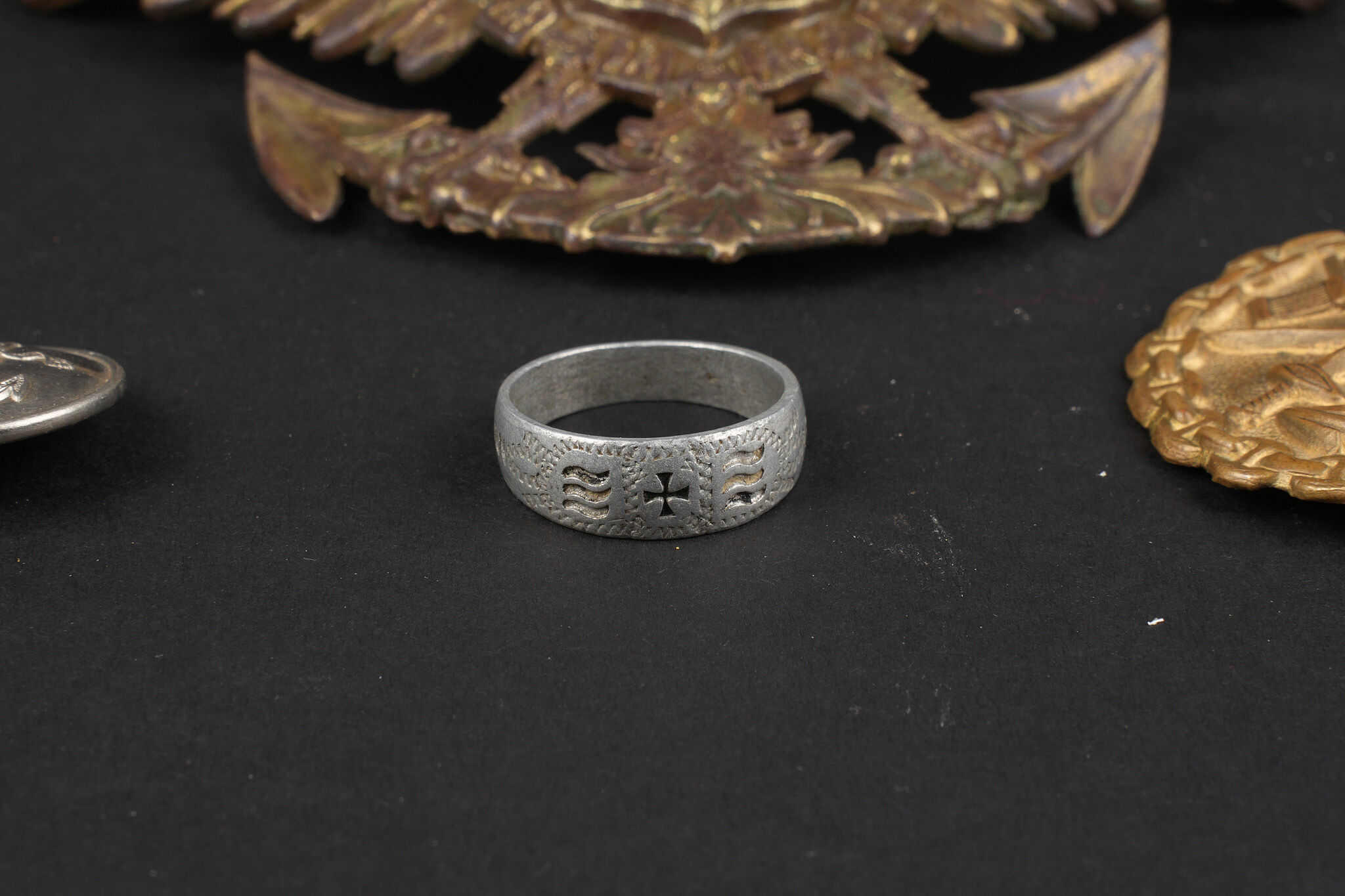 Marine allemande en Flandres 1914-1918. Une boucle Marine M1895 laiton, ardillons manquants, une plaque de Tschako SeeBataillon en laiton sans attaches, un insigne des blessés Marine or, un livret d’un soldat de la 2 Matrosen Division, une section de bois gravée de la Marine Flieger Abteilung 2, une médaille Marine Korps sans ruban, un disque de col de grade, et une bague artisanale gravée Feldzug Flandern 14-18. Usure d’usage. Imperial German Navy in Flanders 1914 to 1918 lot including one brass Marine M1895 buckle missing prongs, one brass See Bataillon shako plate without fittings, one gold grade naval wound badge, one booklet of a soldier from the 2nd Matrosen Division, one carved wooden section marked Marine Flieger Abteilung 2, one naval corps medal without ribbon, one naval rank collar disk, and one trench made ring engraved Feldzug Flandern 14–18. Service wear and patina