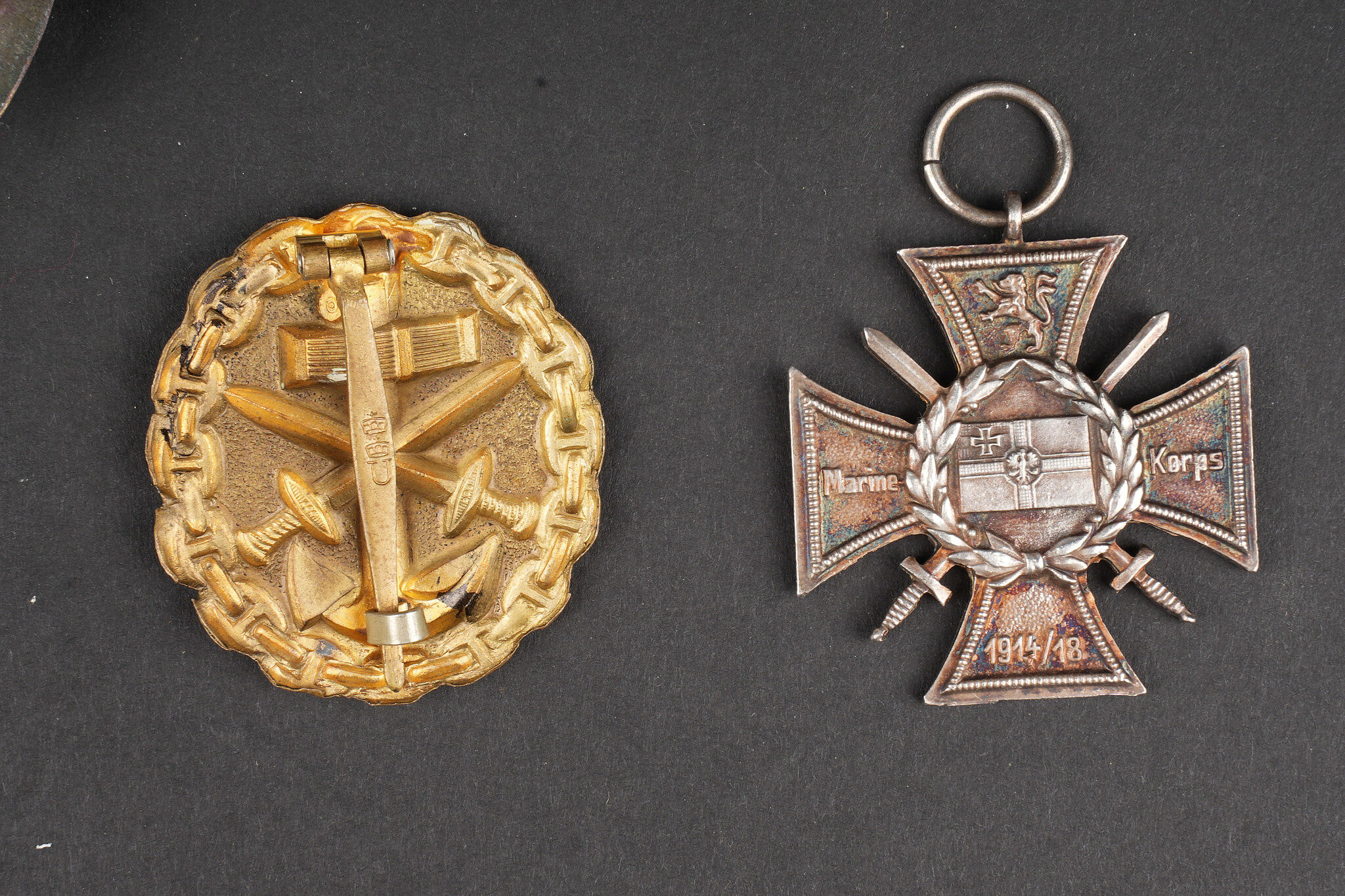 Marine allemande en Flandres 1914-1918. Une boucle Marine M1895 laiton, ardillons manquants, une plaque de Tschako SeeBataillon en laiton sans attaches, un insigne des blessés Marine or, un... en savoir plus