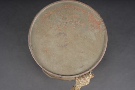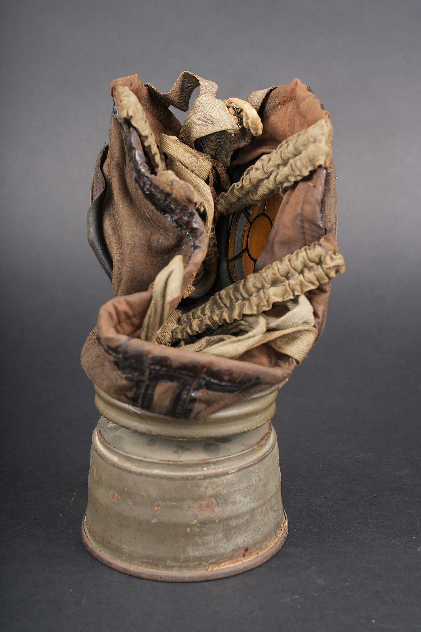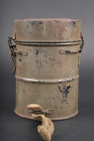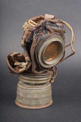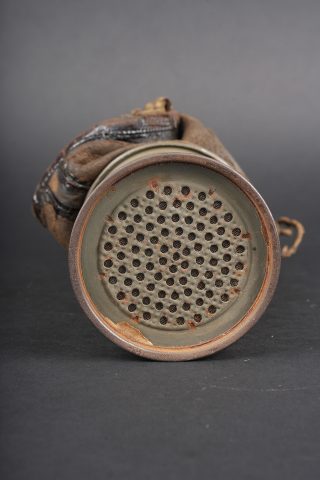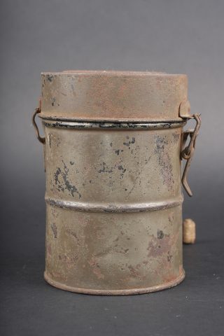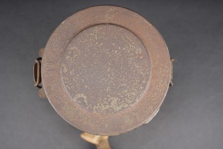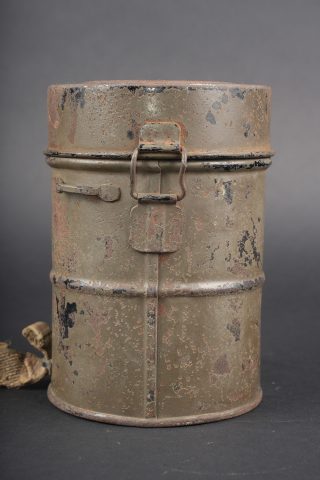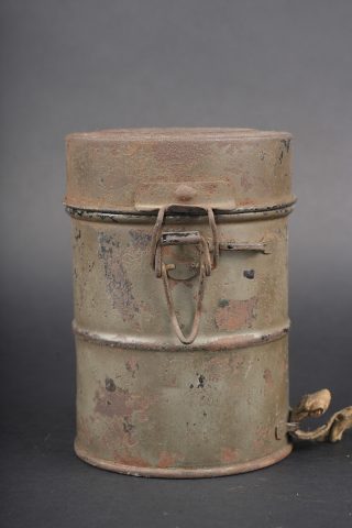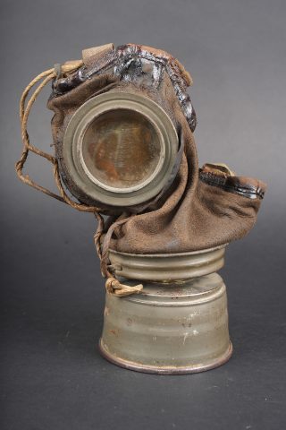Masque anti-gaz allemand Lederschutzmaske. Masque en cuir, souple, oculaires renforcés, complet de ses sangles et de sa cordelette. Cartouche filtrante feldgrau, datée Feb. 18, en bon état et facilement dévissable. Boîtier peint feldgrau, oculaires de rechange dans le couvercle, petite sangle avec boutonnière présente. Usure d’usage, patine. Lederschutzmaske leather gas mask in supple leather with reinforced eyepieces, complete with straps and draw cord. Feldgrau filter canister dated February 1918, in good condition and easily removable. Feldgrau painted carrying tin with spare eyepieces in the lid, small strap with buttonhole present. Service wear and patina