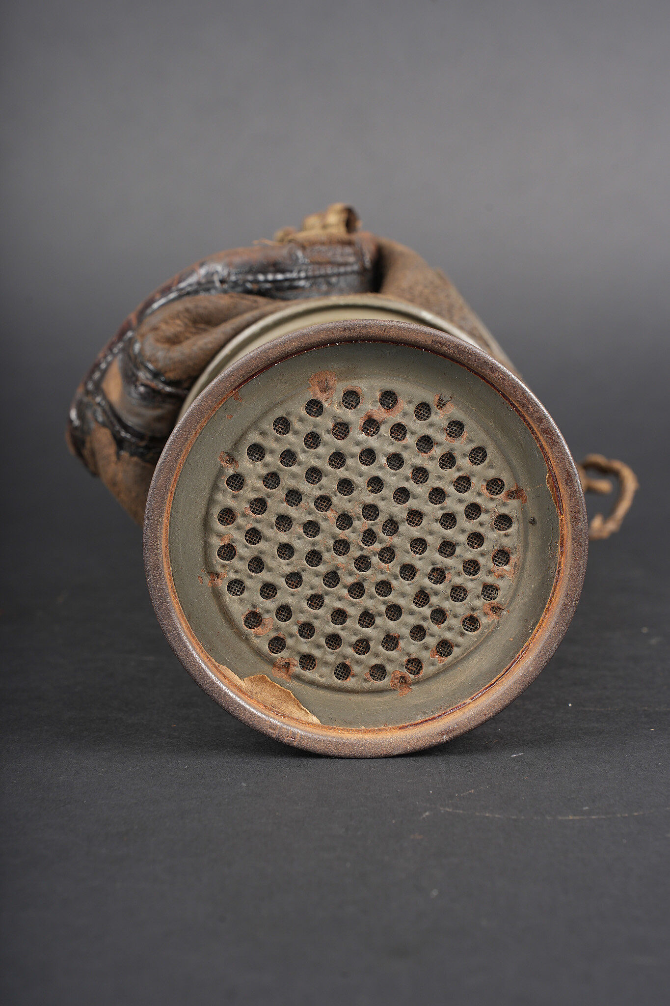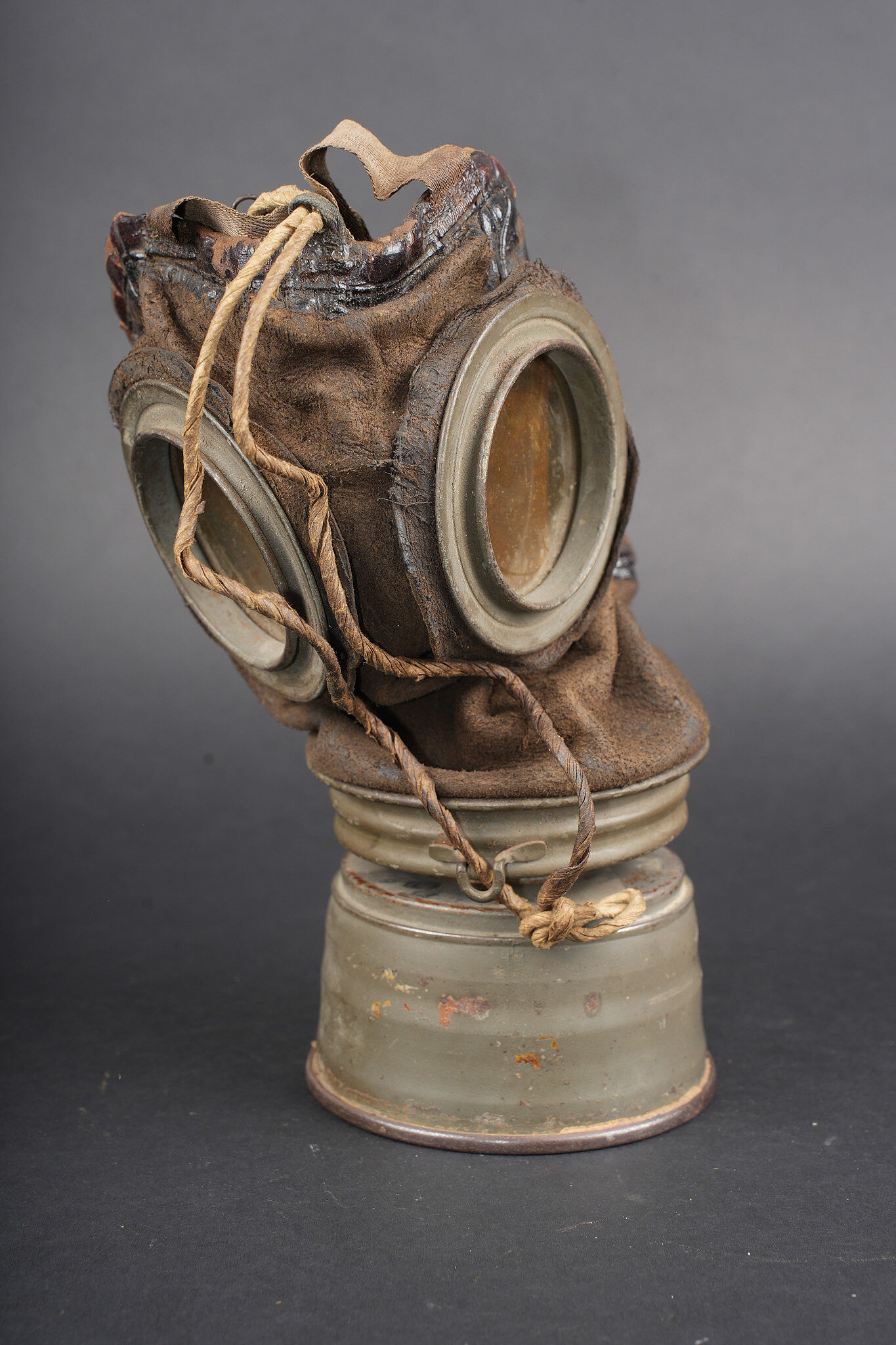 Détails de la vente >Masque anti-gaz allemand Lederschutzmaske. Masque en cuir, souple, oculaires renforcés, complet de ses sangles et de sa cordelette. Cartouche filtrante feldgrau, datée Feb. 18, en bon état et... en savoir plus