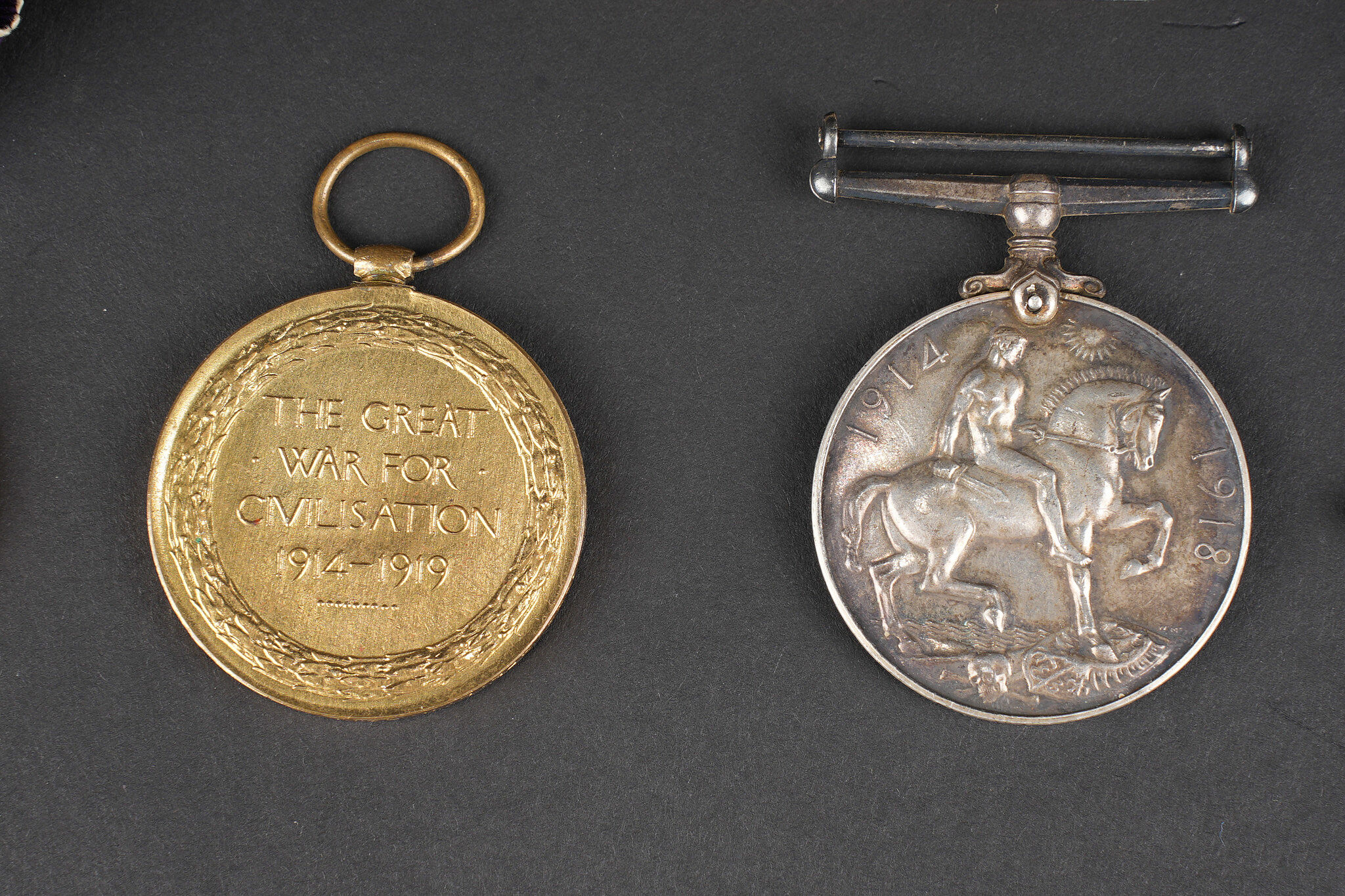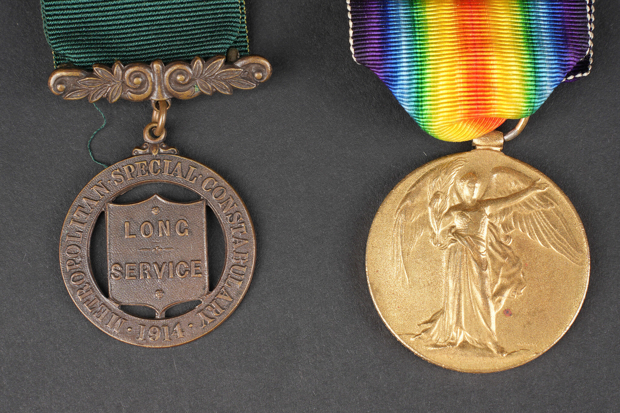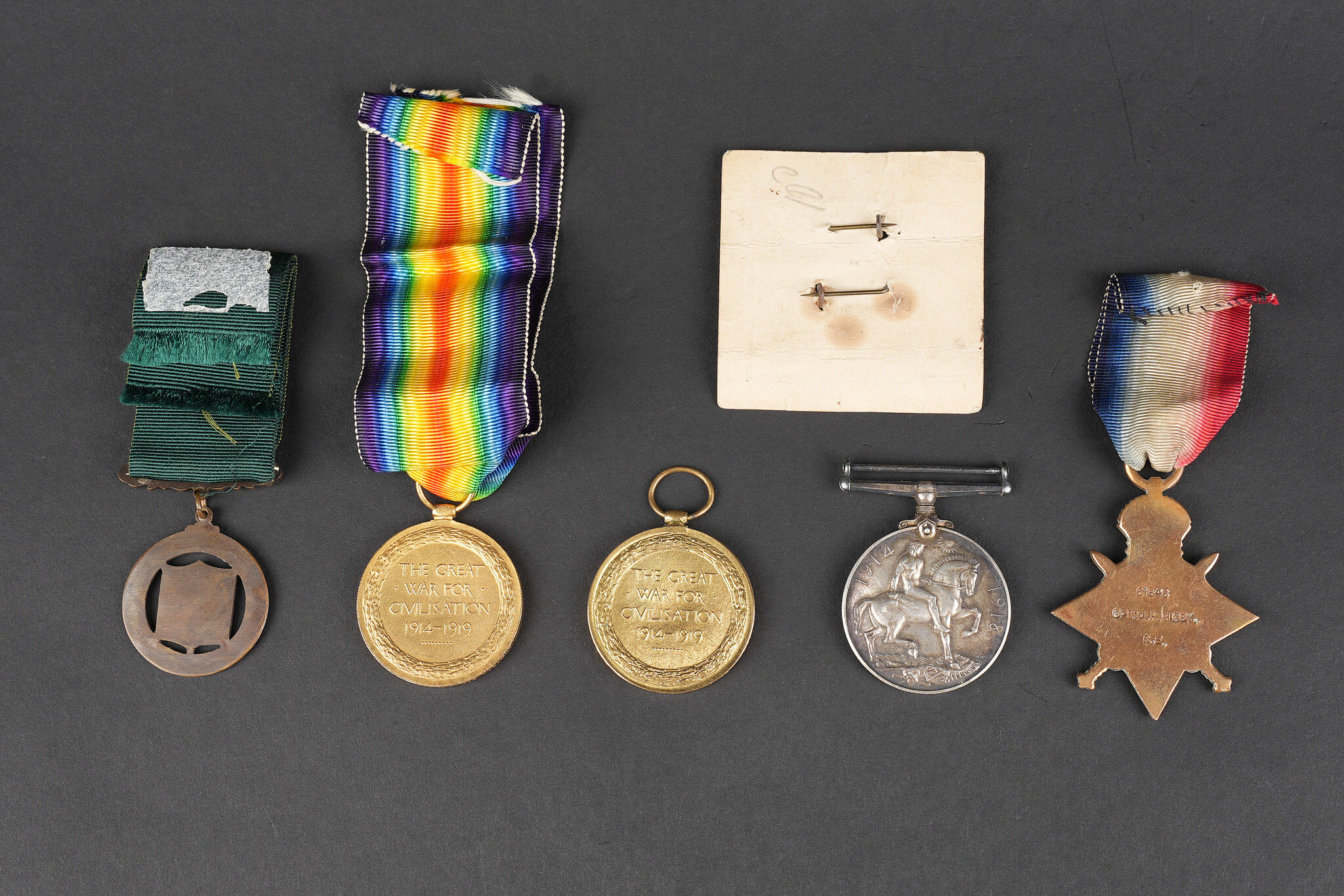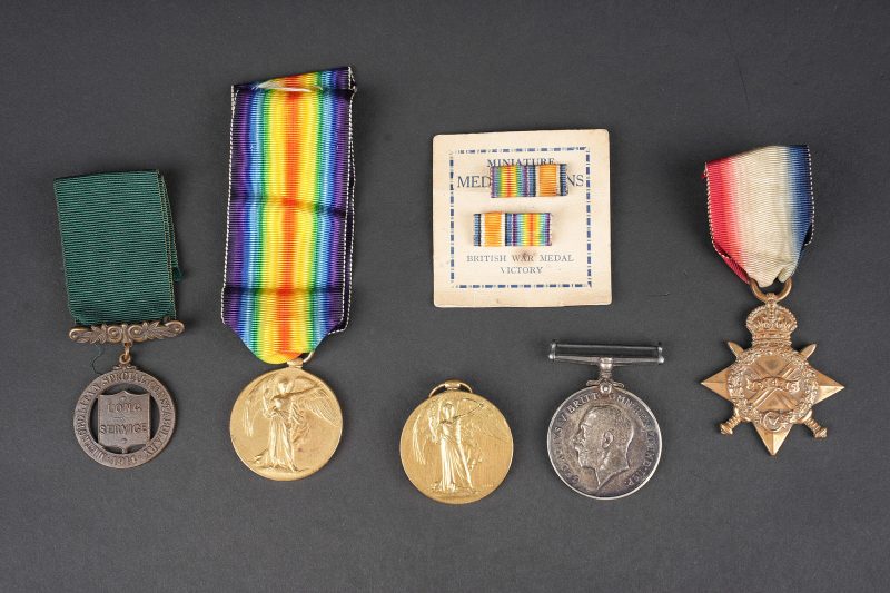 Lot de médailles anglaises 1914-1918. Comprenant une 1914-1915 Star attribuée à un Sapper des Royal Engineers, une 1914-1918 British War Medal attribuée sur tranche, probablement un civil belge M.M.J. ROUARD, sans ruban, une médaille Long Service 1914 des Metropolitan Special Constabulary, une Victory Medal attribuée à SD-2312 Private W. O. Fry du Royal Sussex Regiment, avec son ruban, une Victory Medal attribuée sur tranche à 1266 Corporal L. R. Barnes du North Somerset Yeomanry, sans ruban. On joint un carton avec 2 rappels. Usure d’usage, patine. Lot of British medals from 1914 to 1918 including a 1914–15 Star awarded to a sapper of the Royal Engineers, one British War Medal officially named on the rim, probably to Belgian civilian M. M. J. Rouard and without ribbon, one Metropolitan Special Constabulary Long Service medal dated 1914, one Victory Medal named to SD-2312 Private W. O. Fry of the Royal Sussex Regiment with ribbon, and one Victory Medal named to 1266 Corporal L. R. Barnes of the North Somerset Yeomanry without ribbon. Included is a card with two ribbon bars. Wear and patina.