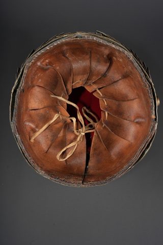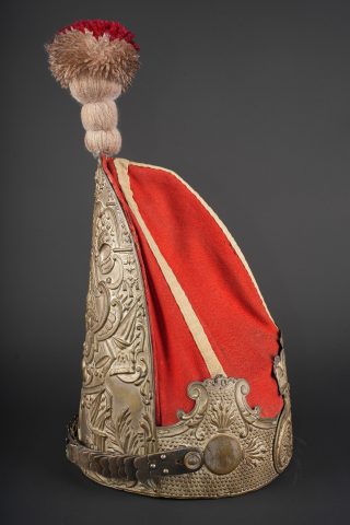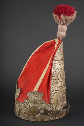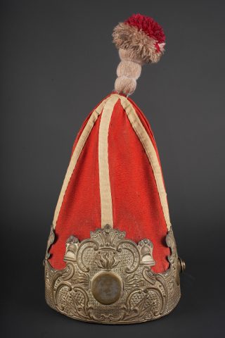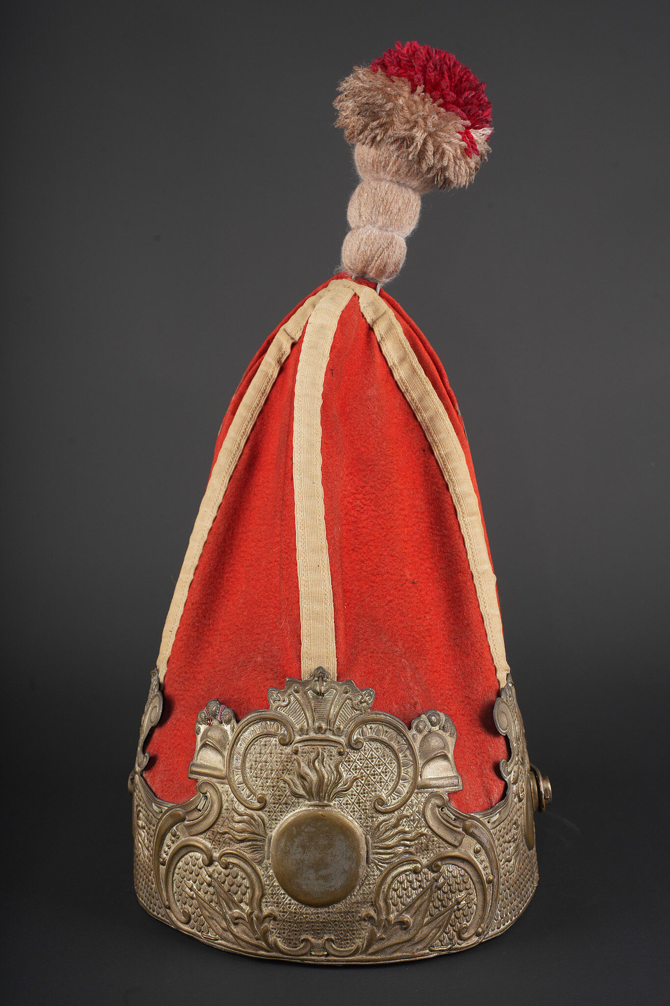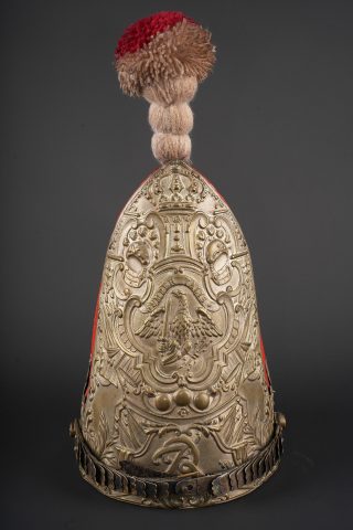 Mitre de Grenadier du Ie ou IIe bataillon du 1e Régiment de la Garde à pied prussien – Modèle 1894-96 de troupe. Offerte au 1er Régiment de la Garde à pied par l’empereur Guillaume II en 1894 pour fêter son premier jour de service militaire, cette mitre est en fait une copie de l’ancienne coiffure portée de 1753 à 1786 par le « Königlich-preussische-Regiment-Garde, n°15 ». Le fronton très ouvragé est en métal argenté, comme la pièce qui fait le tour de la base de la mitre également décorée de grenades et de drapeaux. Ces deux pièces métalliques sont fixées à une armature de cuir et de bois qui soutient le bonnet en drap rouge lui-même garni de trois galons blancs réunis au sommet de la coiffure. Le drap et les galons sont en bon état, seuls deux petits trous discrets et situés sur le bord du galon dorsal, en haut, attestent de l’ancienneté de cette coiffure. La fixation des pièces en métal argent se fait par coutures sur le bonnet en drap et par agrafes sur la coiffe intérieure en cuir. Celle-ci et bien munie de toute ses dents de loup dans lesquelles passe un lacet de réglage. La taille 58 apparait sur l’une des dents de loup, ainsi qu’un nom écrit à l’encre, probablement celui de son propriétaire de l’époque. Cette coiffure est modifiée en 1896 par l’ajout de tourillons à index modèle 1891 destinés à retenir une paire de jugulaires à écailles plates en maillechort bien présente sur cette mitre et sans manque. Le fronton est surmonté d’un pompon de laine blanche à centre rouge. Une belle patine d’ensemble confère à cette rare coiffure de l’époque wilhelmienne une belle présentation. Grenadier mitre for the I or II Battalion of the 1st Regiment of Foot Guards, other ranks model 1894 to 1896, presented by Wilhelm II in 1894 to commemorate his first day of military service. This mitre reproduces the historic headgear worn from 1753 to 1786 by the Königlich Preussische Regiment Garde Nr 15. Highly ornate silvered metal front plate and matching lower band decorated with grenades and flags, mounted on a leather and wooden frame supporting the red cloth cap with three white braids joined at the top. Cloth and braids remain in good condition with only two discreet small holes near the rear braid. Silver metal elements sewn and clipped to the inner leather liner. Complete wolf tooth liner with adjustment lace, size 58 marked together with an inked name probably of the original wearer. Modified in 1896 with M1891 side posts retaining a complete pair of nickel silver flat scale chinstraps. White wool pompon with red centre. Fine overall patina and strong presentation.