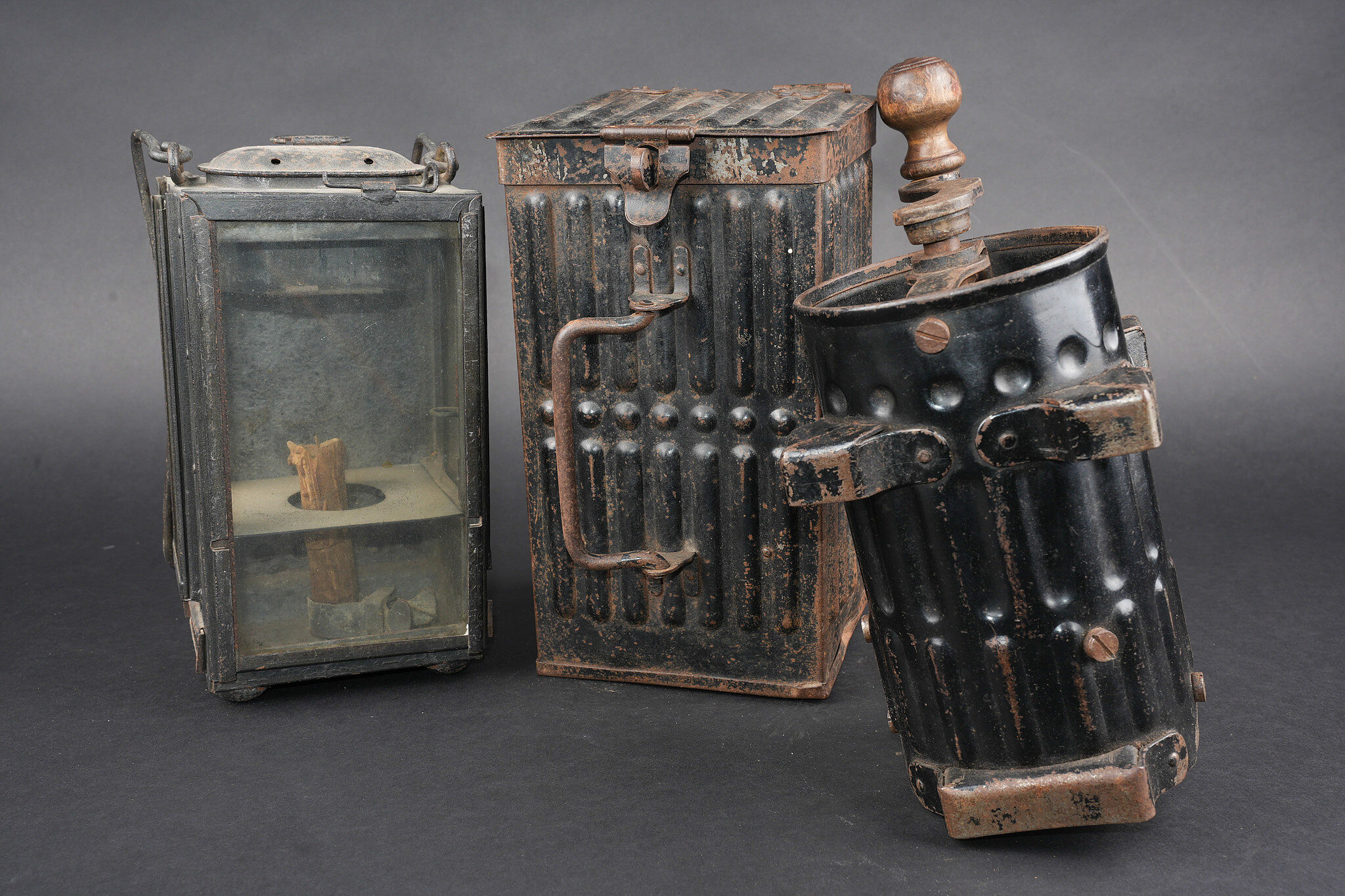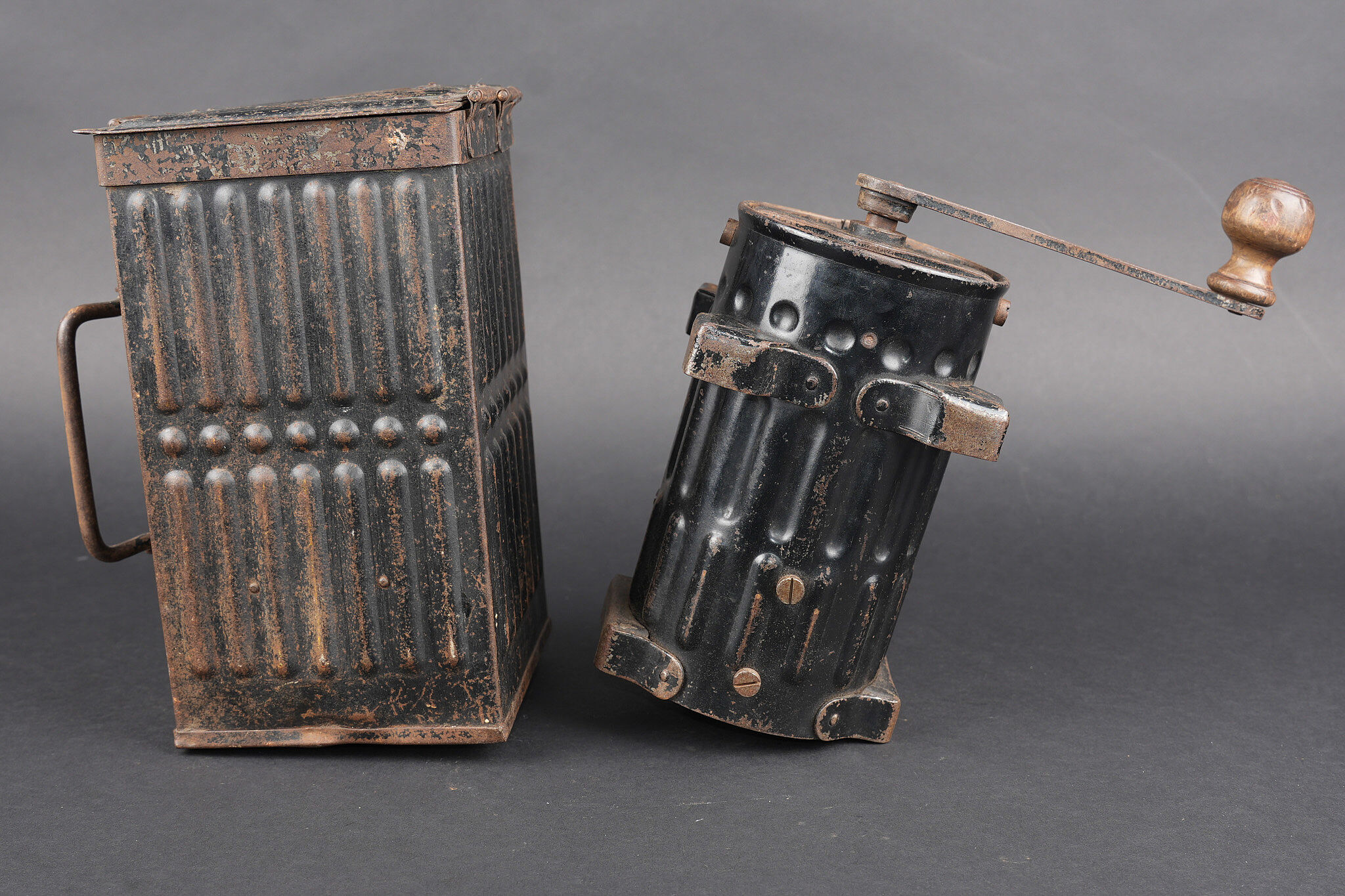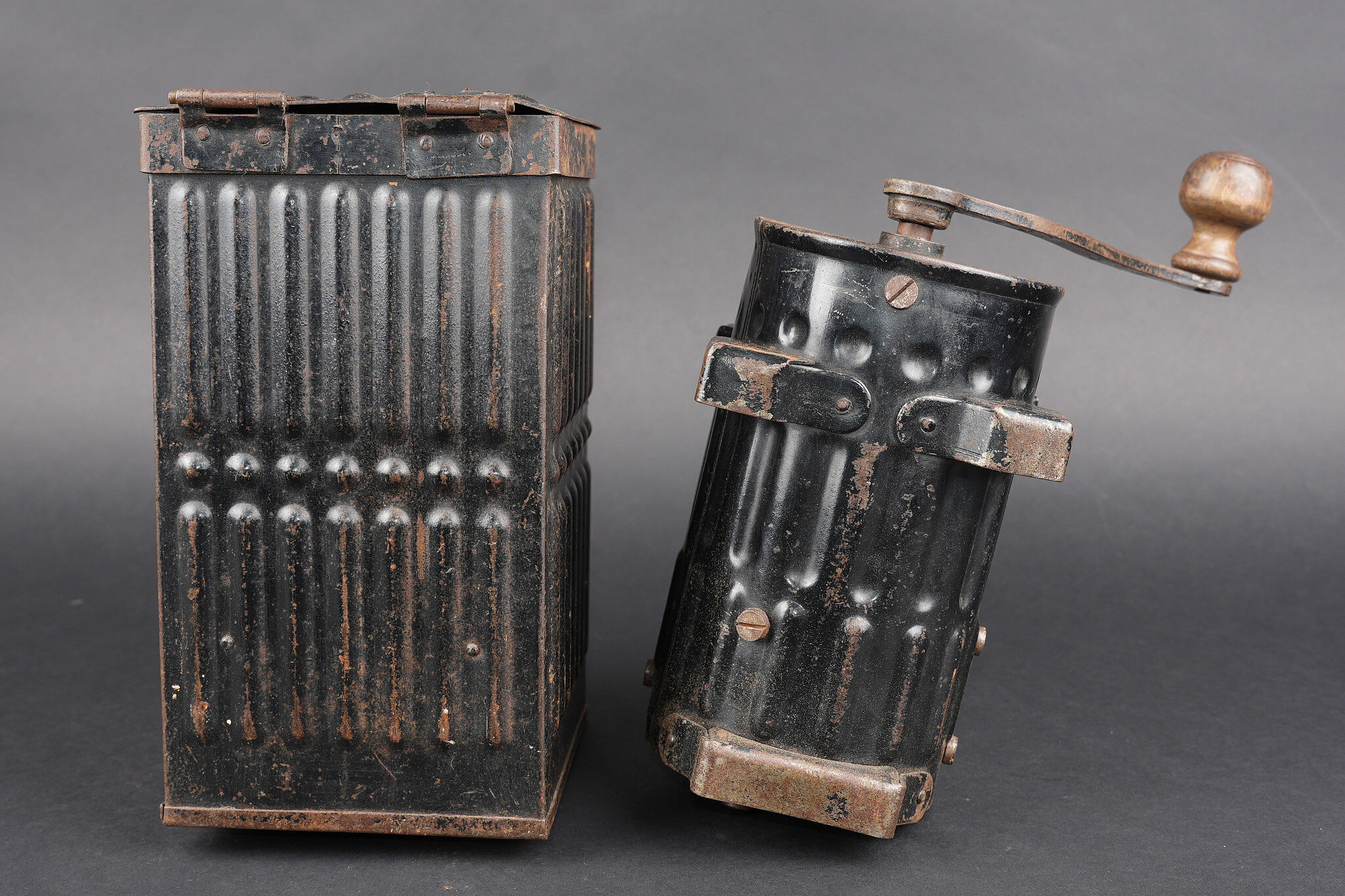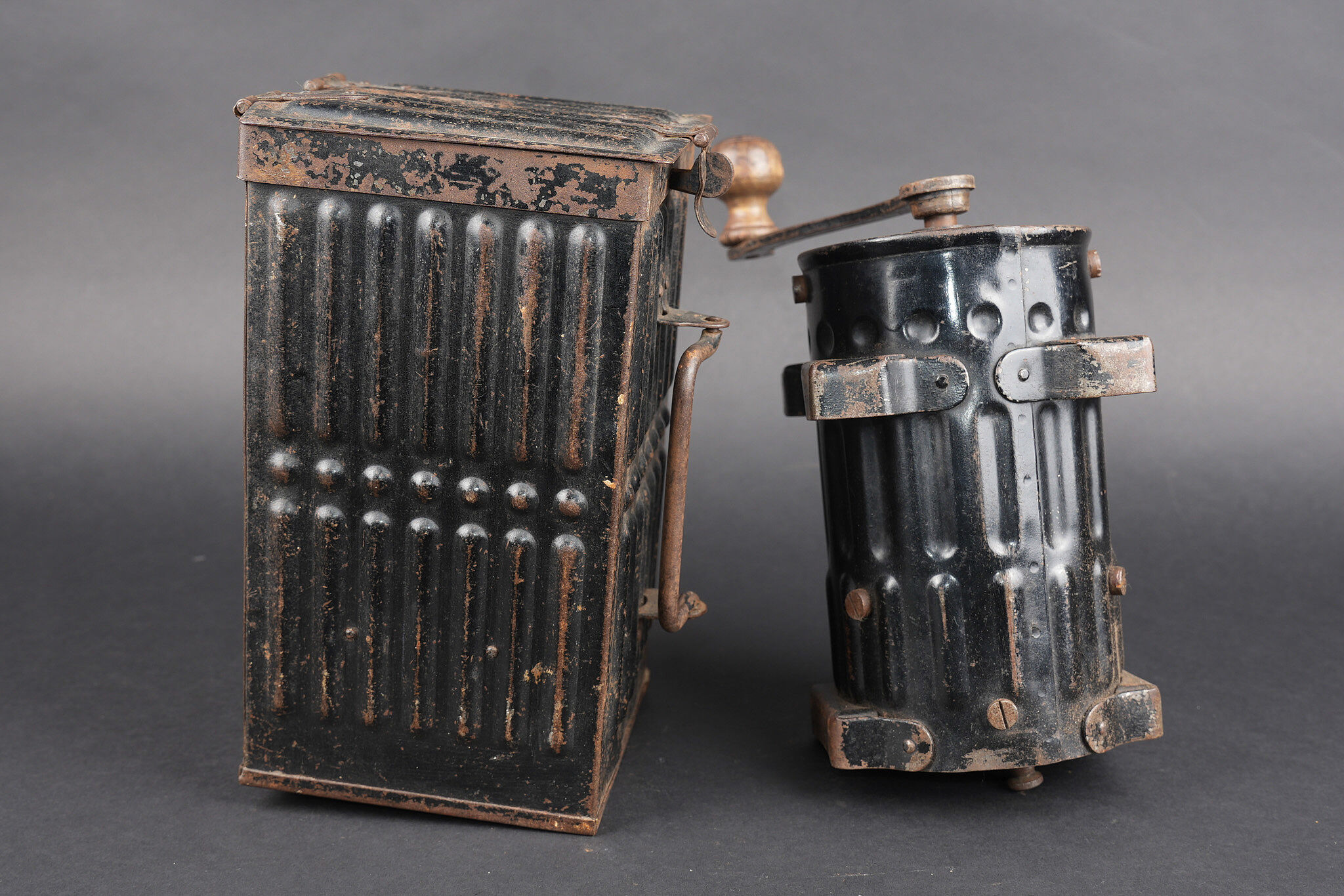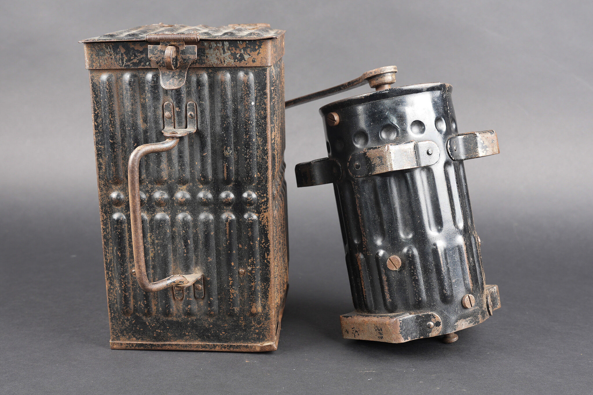 Moulin à café et lanterne allemande. Moulin à café de campagne, fabrication italienne, utilisé par l’armée allemande, boîte, moulin et manivelle. Usure d’usage, quelques coups. Accompagné d’une lanterne du fabricant Gerhardt, repeinte anciennement en noir. Pas de bruleur ni de volets de dissimulation. Usure d’usage. Field coffee grinder and German lantern. Campaign coffee grinder of Italian manufacture used by the German army, complete with box, grinder and crank, with some dents and service wear. Accompanied by one lantern by Gerhardt, formerly repainted black, without burner or blackout shutters.