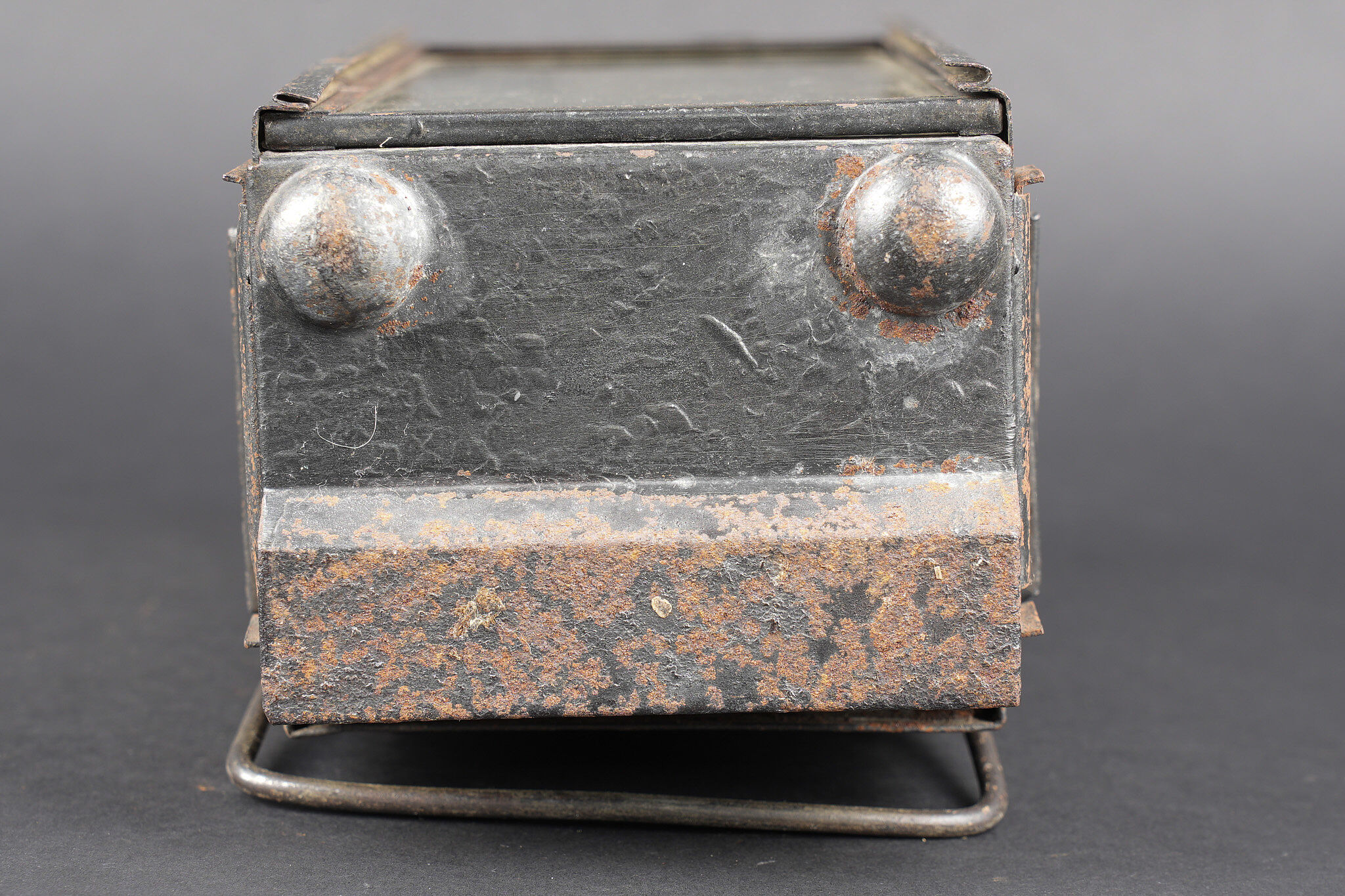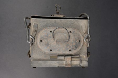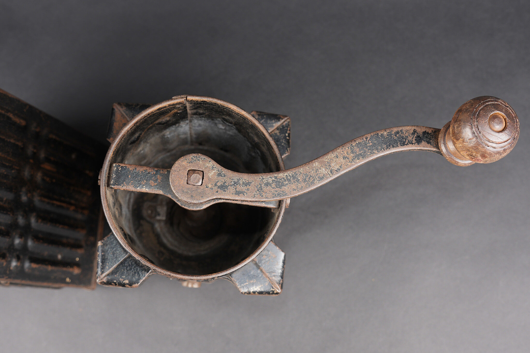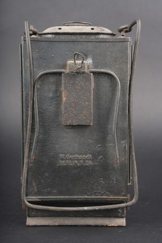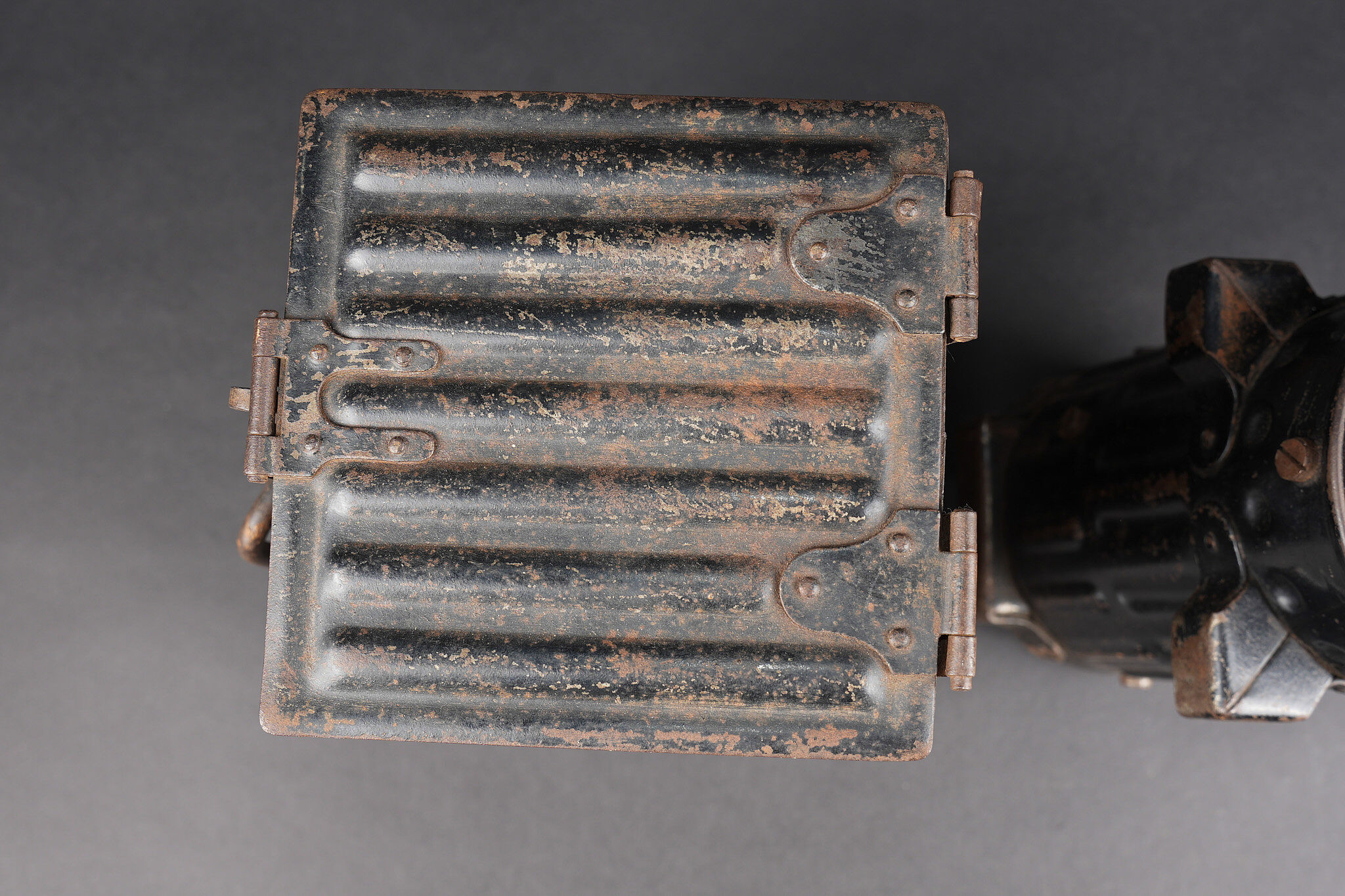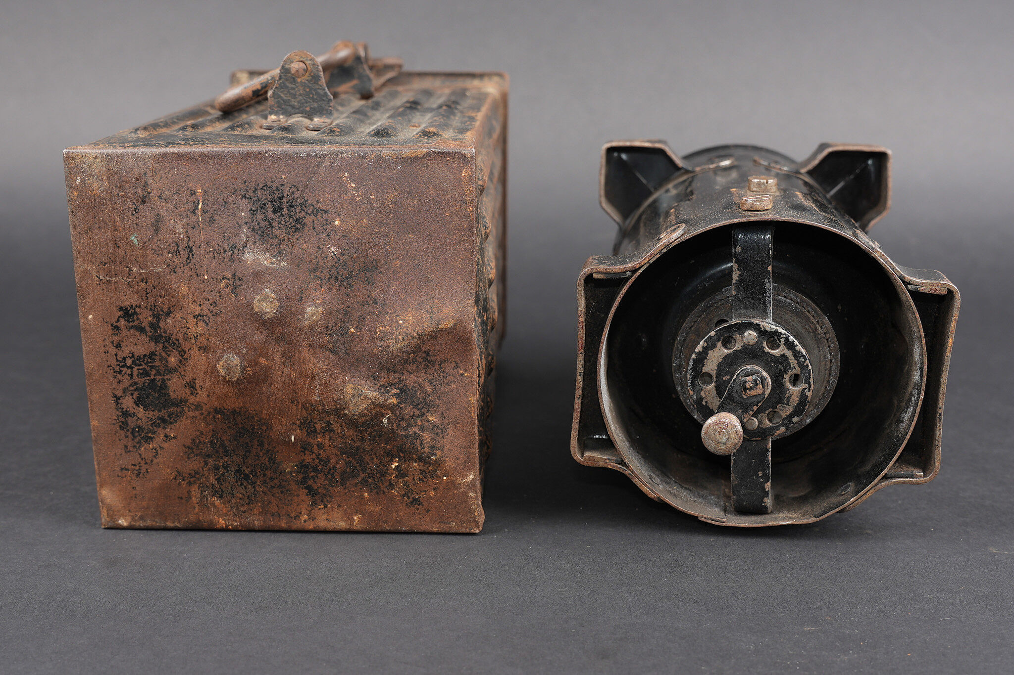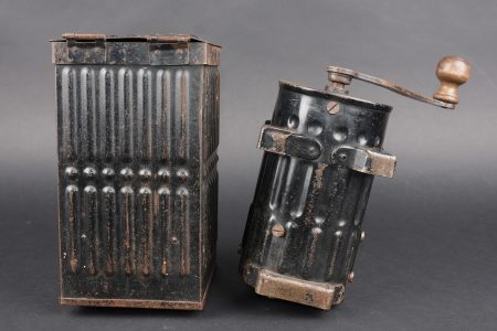 Moulin à café et lanterne allemande. Moulin à café de campagne, fabrication italienne, utilisé par l’armée allemande, boîte, moulin et manivelle. Usure d’usage, quelques coups. Accompagné d’une lanterne du fabricant Gerhardt, repeinte anciennement en noir. Pas de bruleur ni de volets de dissimulation. Usure d’usage. Field coffee grinder and German lantern. Campaign coffee grinder of Italian manufacture used by the German army, complete with box, grinder and crank, with some dents and service wear. Accompanied by one lantern by Gerhardt, formerly repainted black, without burner or blackout shutters.