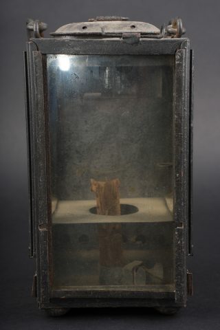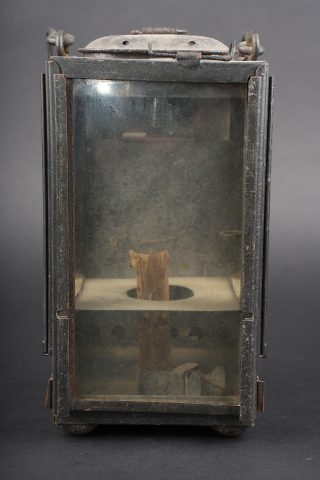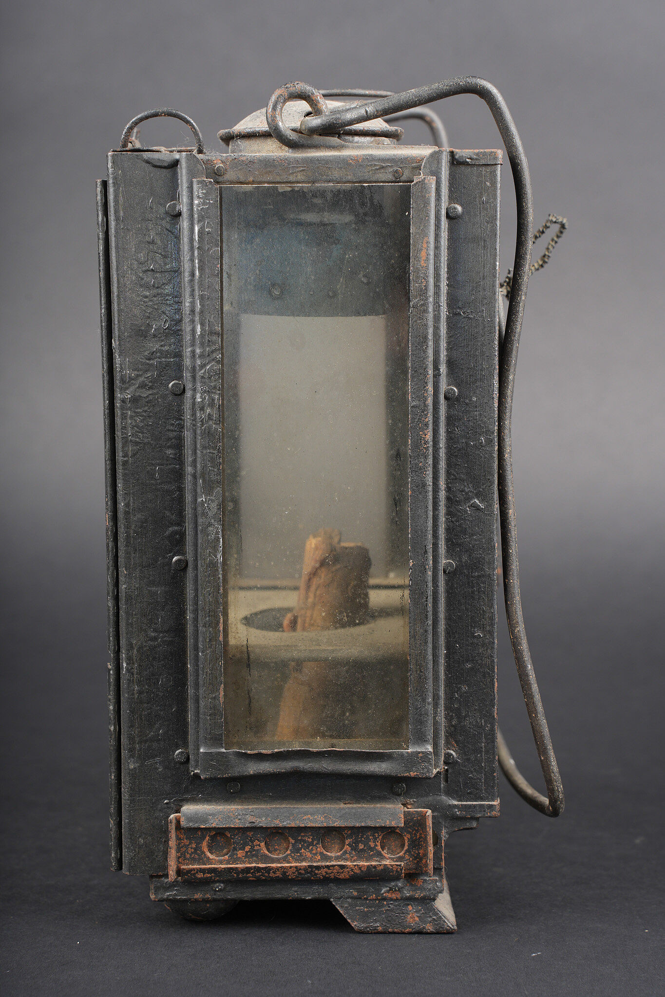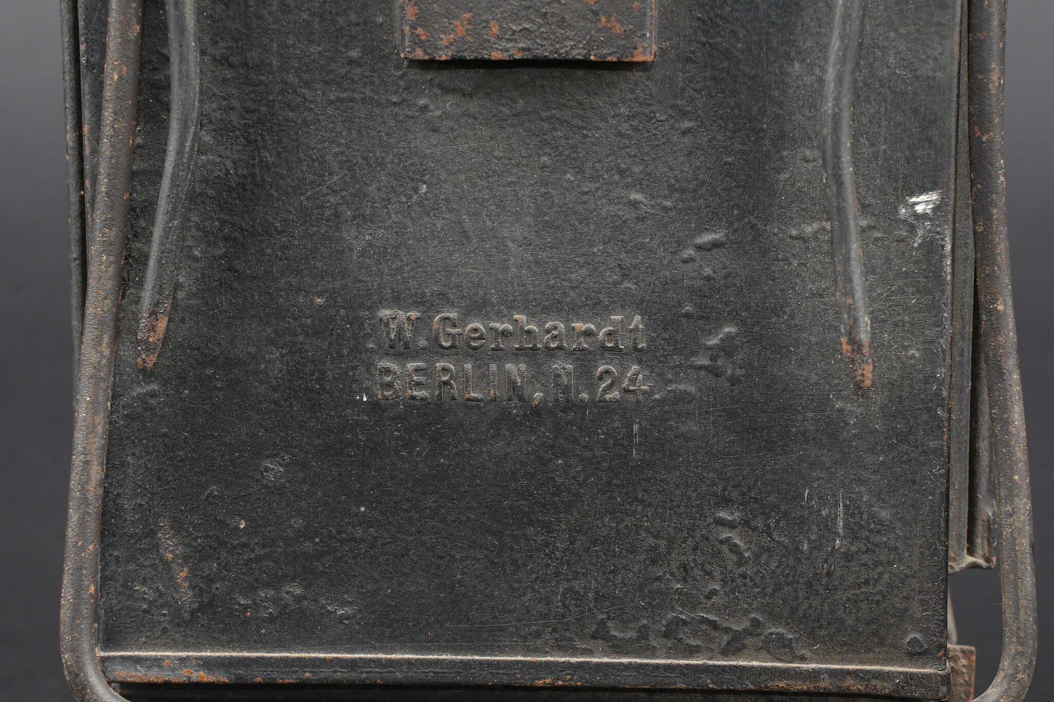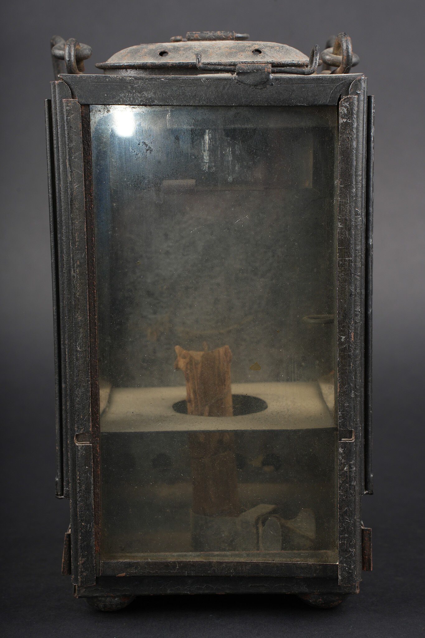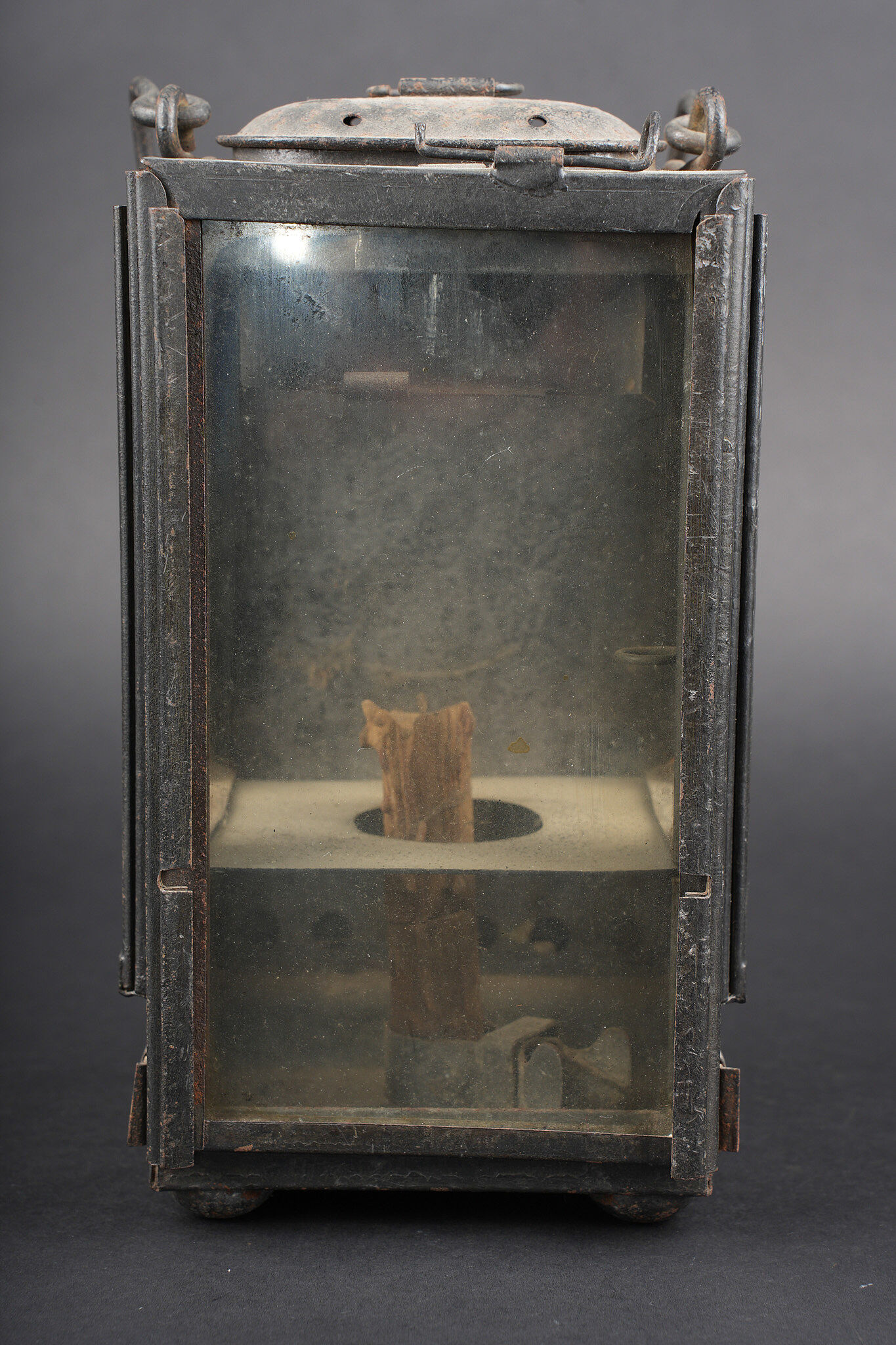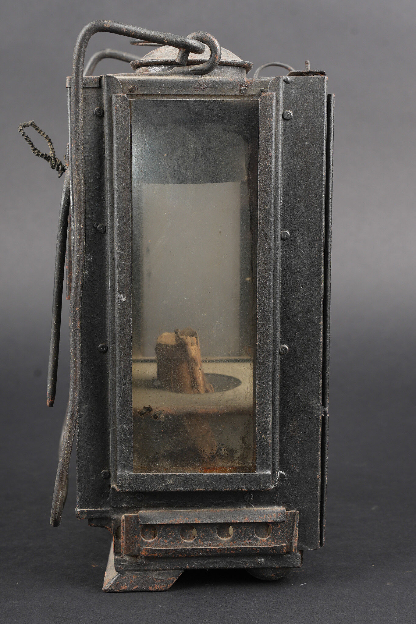 Moulin à café et lanterne allemande. Moulin à café de campagne, fabrication italienne, utilisé par l’armée allemande, boîte, moulin et manivelle. Usure d’usage, quelques coups. Accompagné d’une lanterne du fabricant Gerhardt, repeinte anciennement en noir. Pas de bruleur ni de volets de dissimulation. Usure d’usage. Field coffee grinder and German lantern. Campaign coffee grinder of Italian manufacture used by the German army, complete with box, grinder and crank, with some dents and service wear. Accompanied by one lantern by Gerhardt, formerly repainted black, without burner or blackout shutters.
