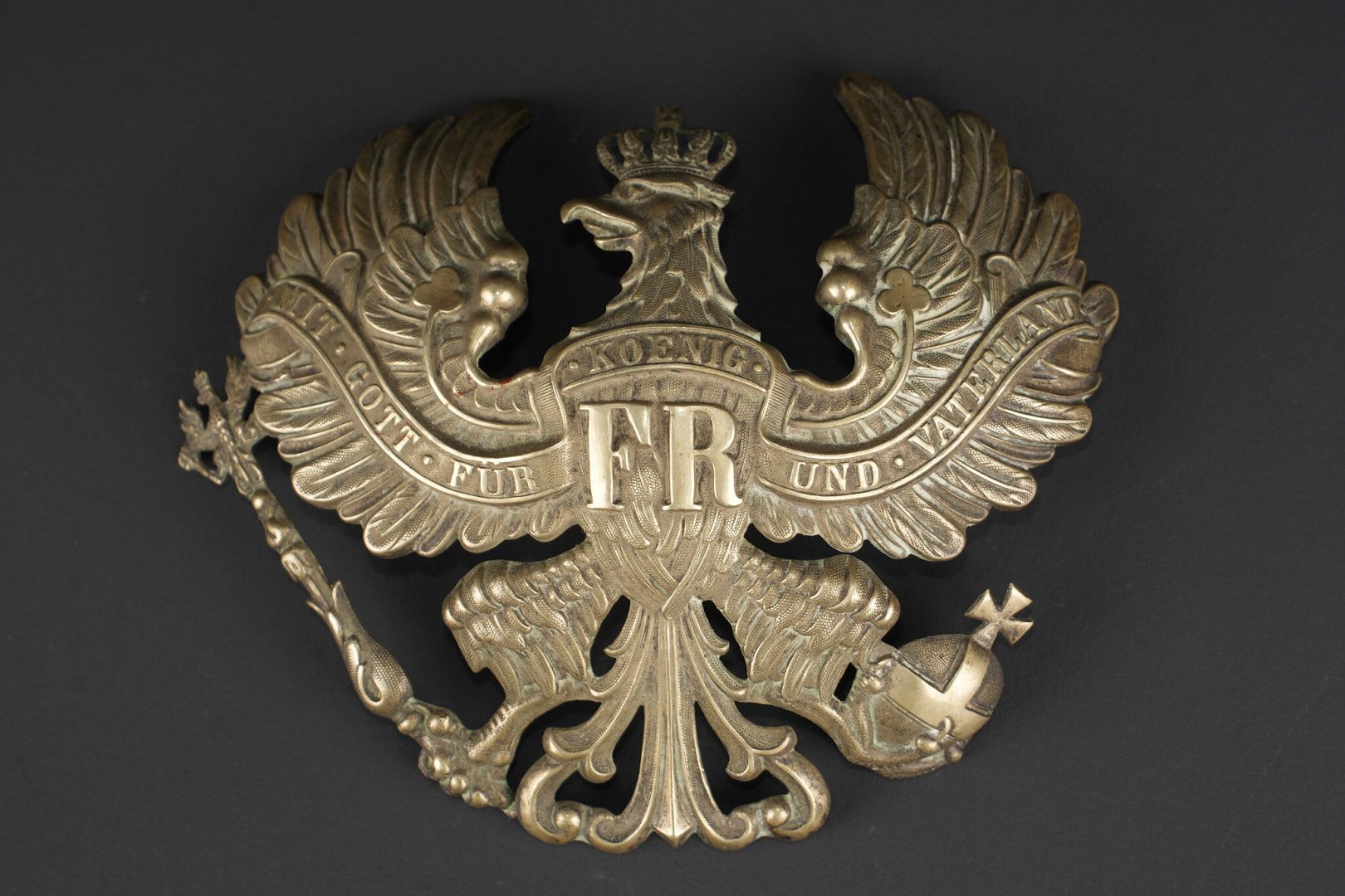 Plaque de casque à pointe d’officier prussien en maillechort. Belle plaque à l’aigle prussien, couronne ajourée, fixation par tiges filetée, soudées d’origine, écrous... en savoir plus