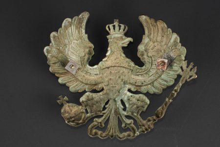 Détails de la vente >Plaque de casque à pointe d’officier prussien en maillechort. Belle plaque à l’aigle prussien, couronne ajourée, fixation par tiges filetée, soudées d’origine, écrous... en savoir plus