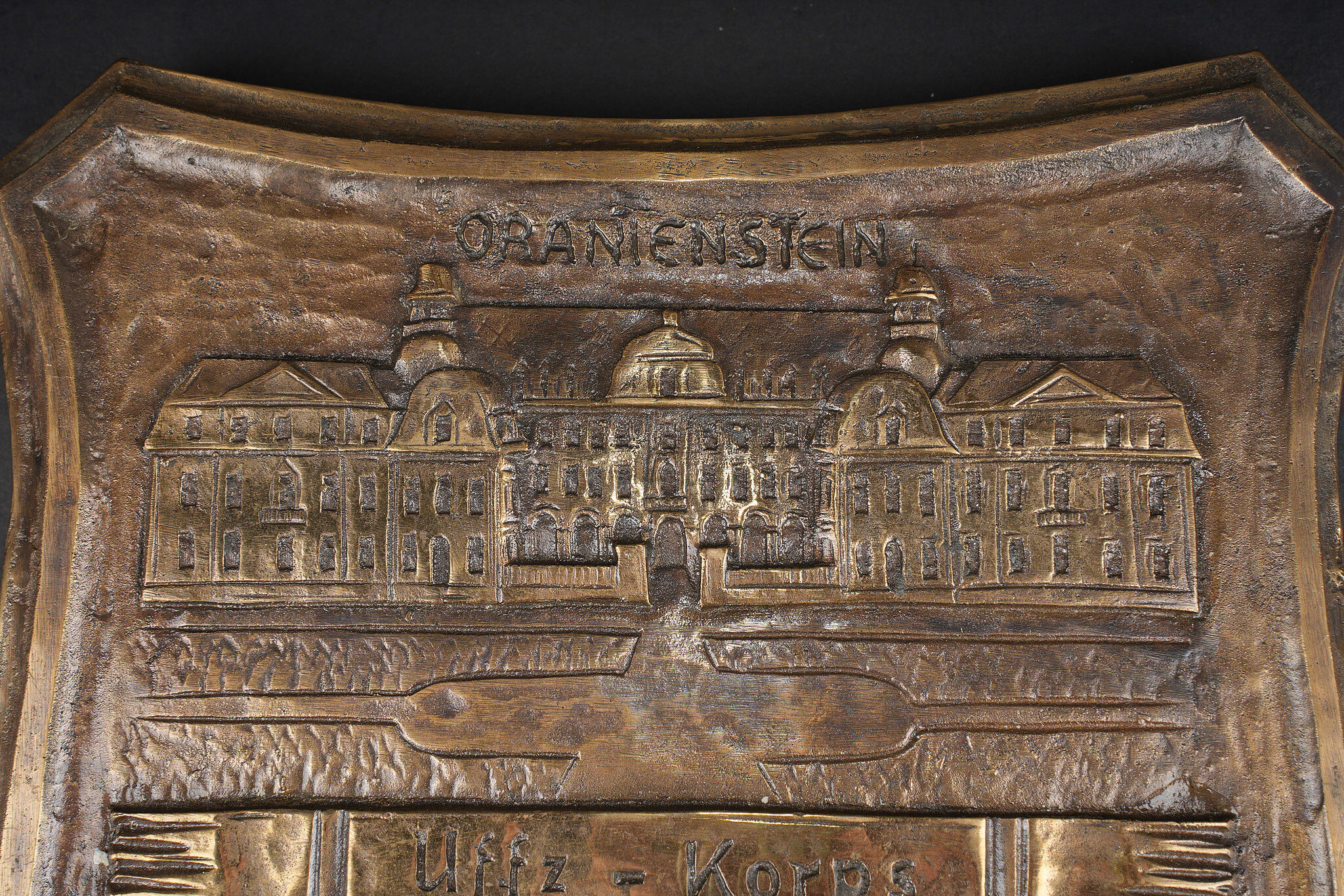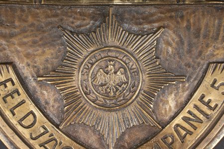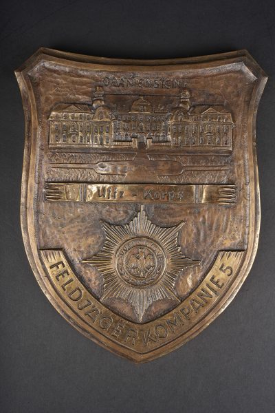 Détails de la vente >Plaque en bronze Feldjagerkorps Oranienstein. Forte plaque en forme de blason, marquée Oranienstein, UnteroffiziersKorps Feldjägerkompanie 5, et figurant le château d’Oranienstein ainsi... en savoir plus