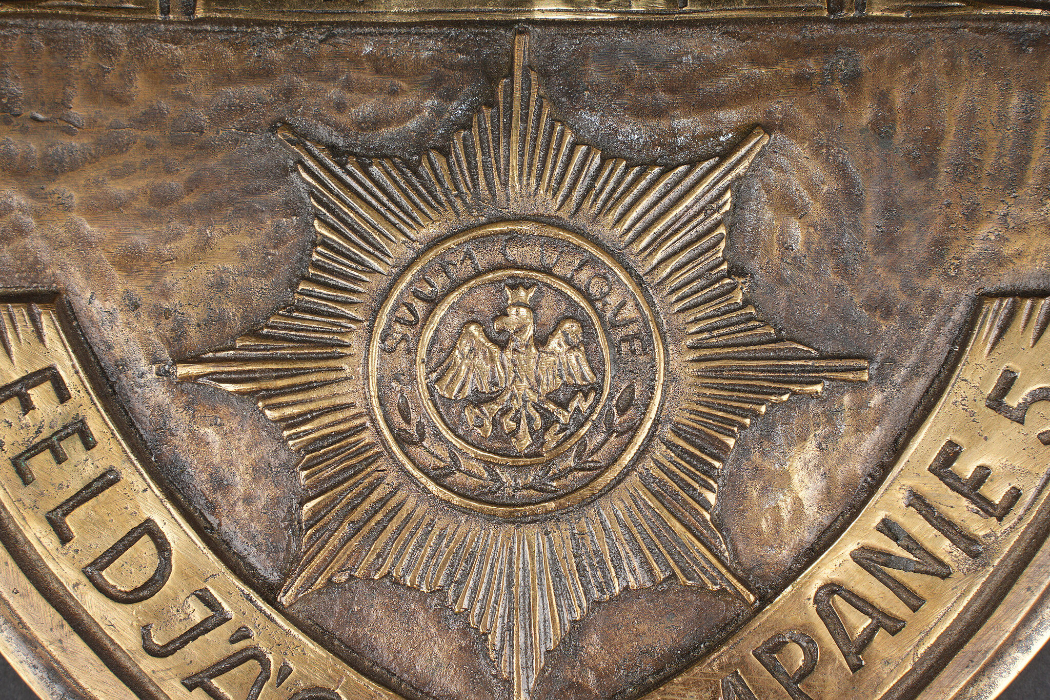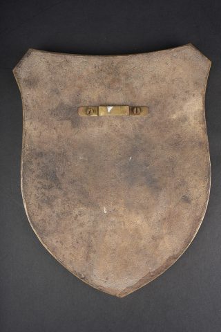 Plaque en bronze Feldjagerkorps Oranienstein. Forte plaque en forme de blason, marquée Oranienstein, UnteroffiziersKorps Feldjägerkompanie 5, et figurant le château d’Oranienstein ainsi que l’étoile de la garde Suum Cuique. Pontet de suspension au dos. Dimensions environ 26 x 21 cm, poids environ 4,92 kg. Bronze plaque of the Feldjägerkorps from Oranienstein in heraldic shield form, inscribed Oranienstein, UnteroffiziersKorps Feldjägerkompanie 5, depicting Schloss Oranienstein together with the Guard star bearing the motto Suum Cuique. Suspension loop on the reverse. Approximate dimensions 26 by 21 cm and weight about 4.92 kg.