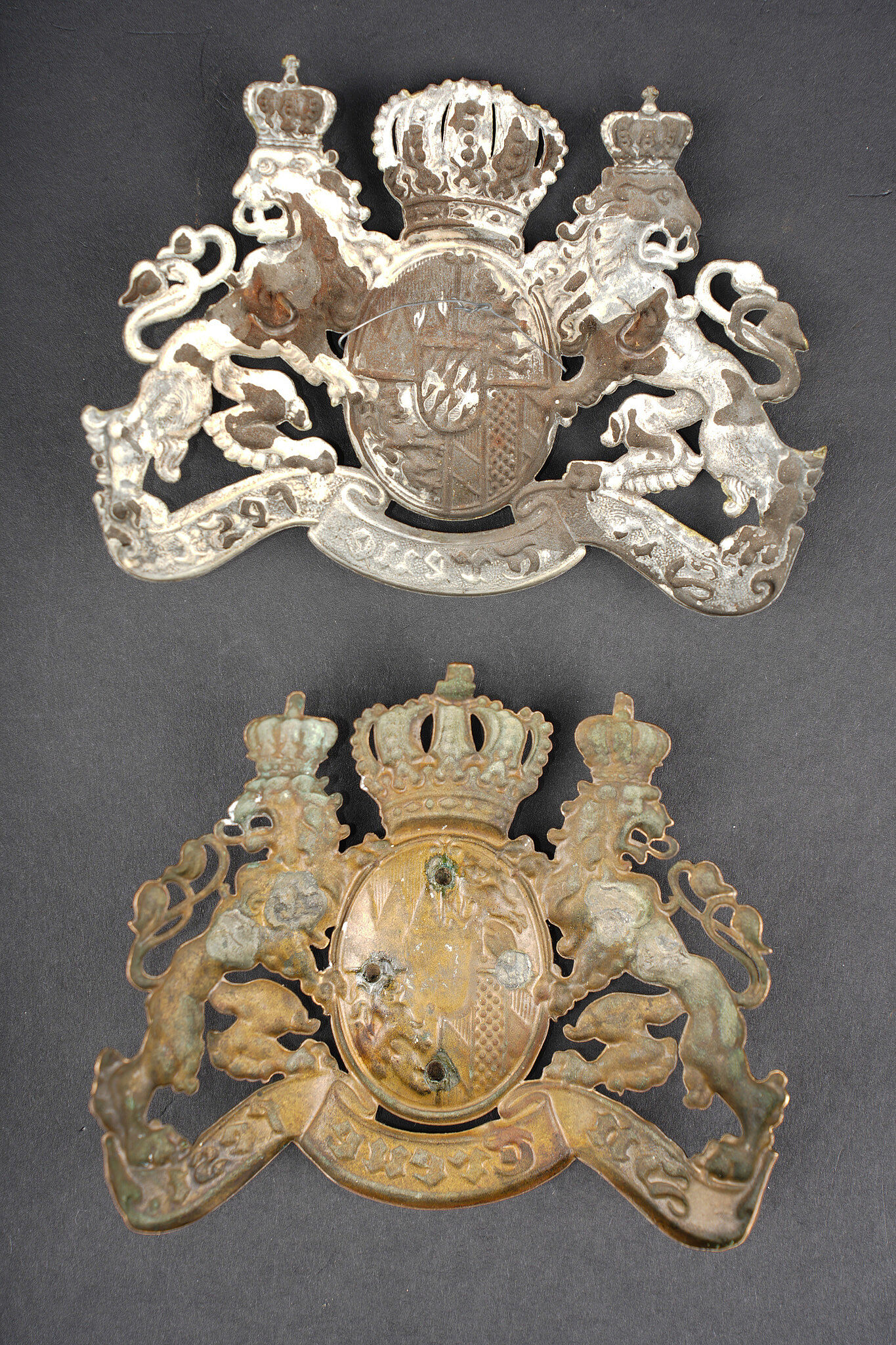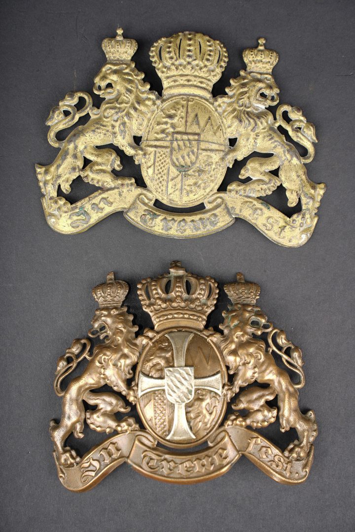 Plaques de casques à pointe bavarois. Une plaque M1896 en laiton pour un réserviste bavarois, pontets absents. Une plaque M1915 en fer dont l’avers a été repeint en doré, pontets présents, légèrement pliés. Usure d’usage, patine. Bavarian helmet plates including one brass M1896 plate for a Bavarian reservist with missing loops, and one M1915 steel plate whose obverse has been repainted in gilt finish, loops present and slightly bent. Service wear and patina.