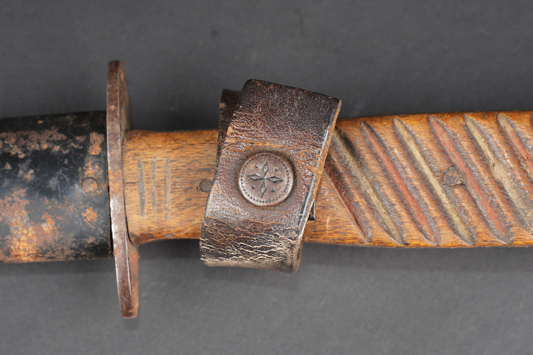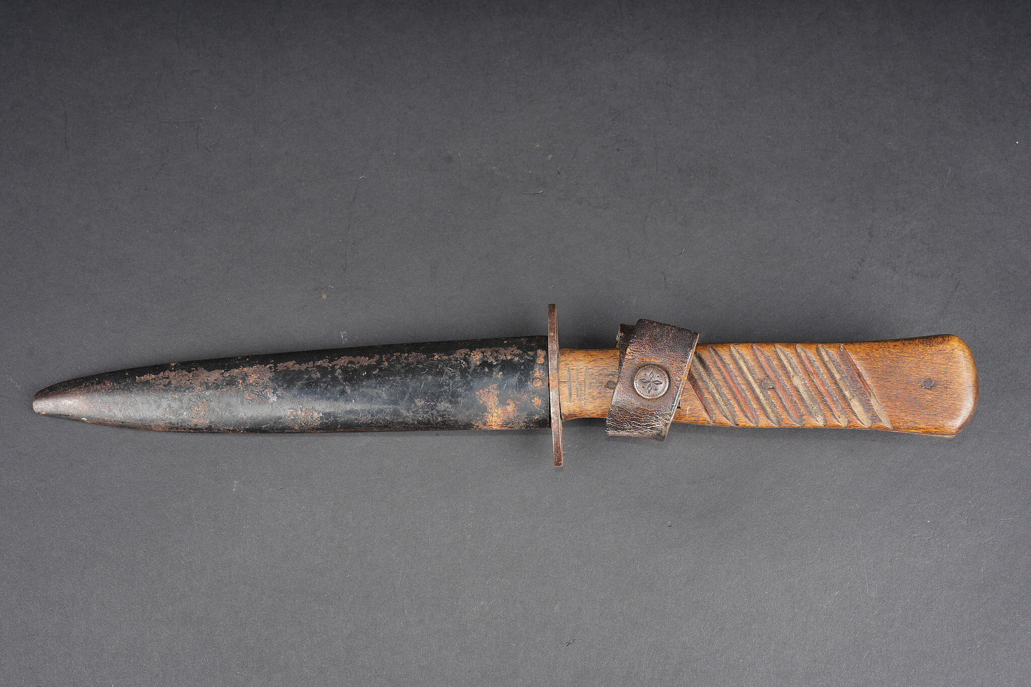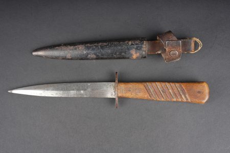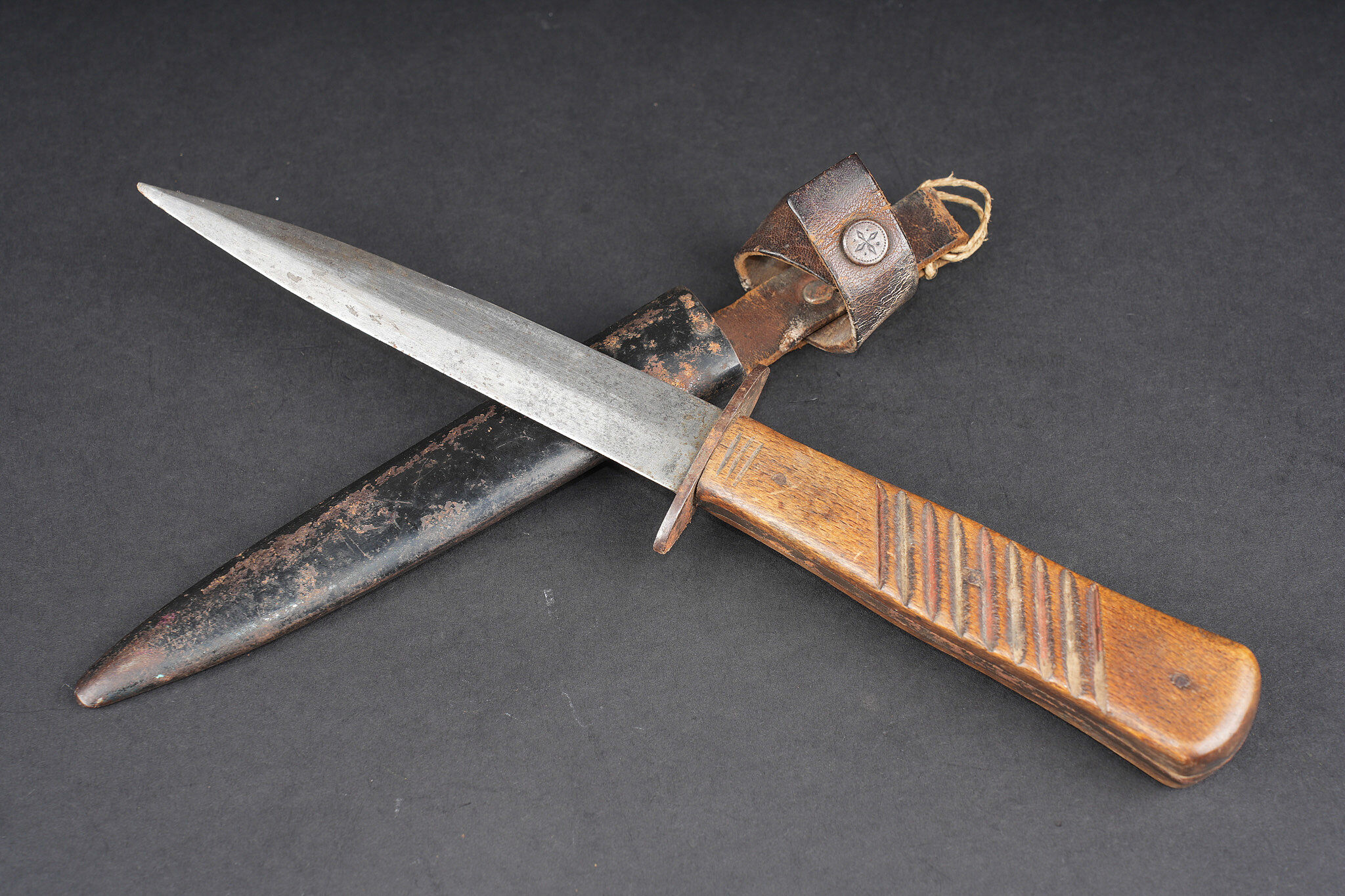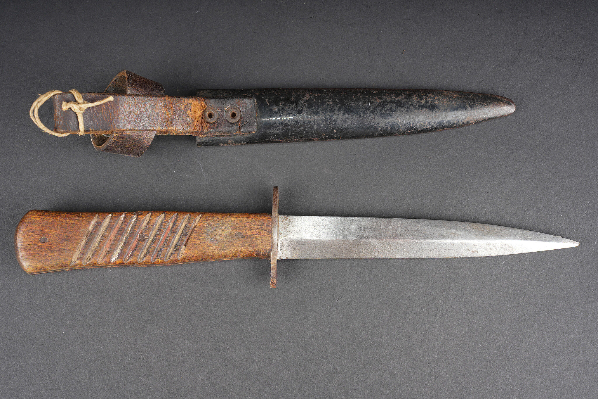 Poignard de combat allemand. Couteau poignée à plaquettes bois striées, lame à double tranchant, non marquée, pointe légèrement tordue. Fourreau fer avec son passant cuir riveté et sa sangle de maintien. Usure d’usage, bon état. German combat dagger with ribbed wooden grip plates, double edged blade unmarked, point slightly bent. Steel scabbard with riveted leather frog and retaining strap. Good overall condition with normal service wear