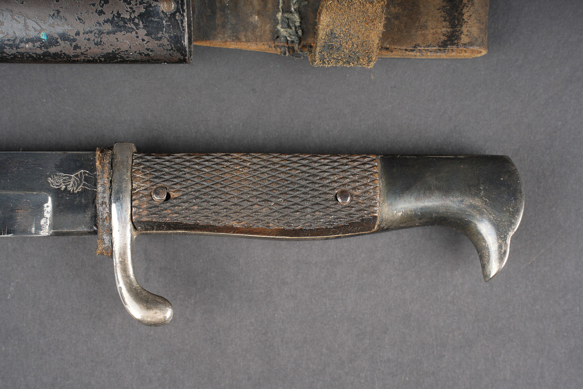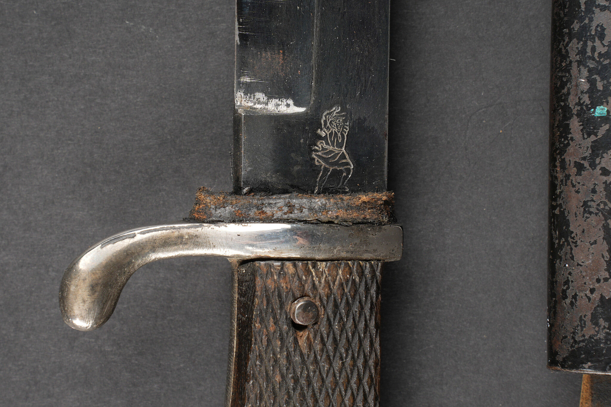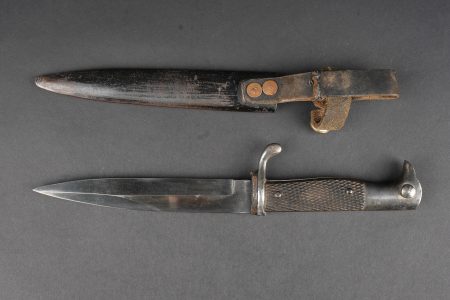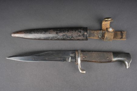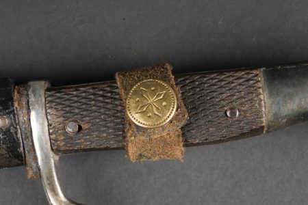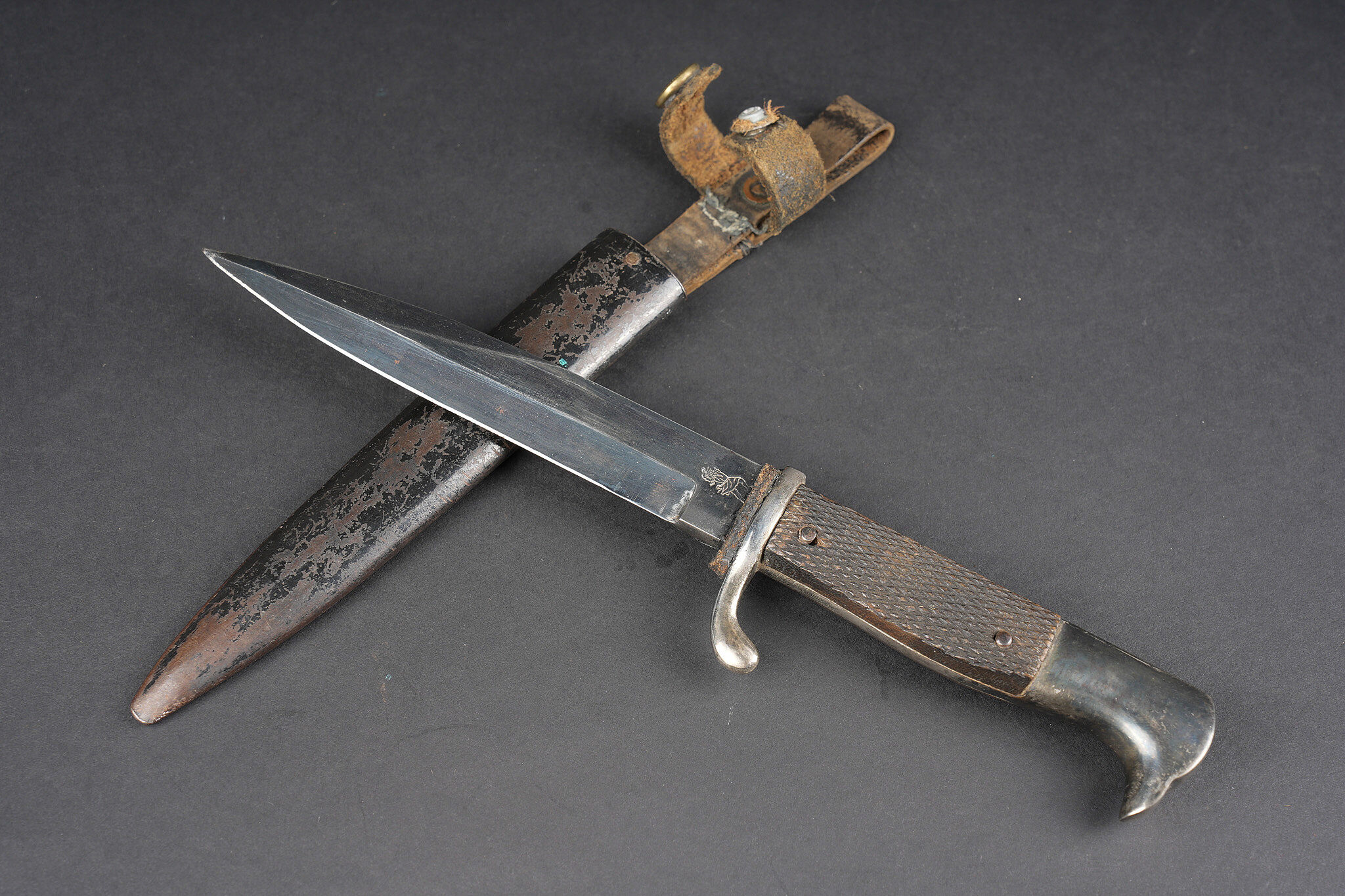 Poignard d’officier allemand ww1. Joli poignard, belle lame avec logo fabricant, personnage probablement Vulcain. Plaquettes quadrillées. Pommeau en tête d’aigle. Fourreau laqué noir, usure, patine, le passant et la patte de maintien ont été réparés. German officer dagger from the First World War with attractive blade bearing maker logo, probably depicting Vulcan. Chequered grip plates. Eagle head pommel. Black lacquered scabbard with wear and patina, suspension loop and retaining strap repaired.