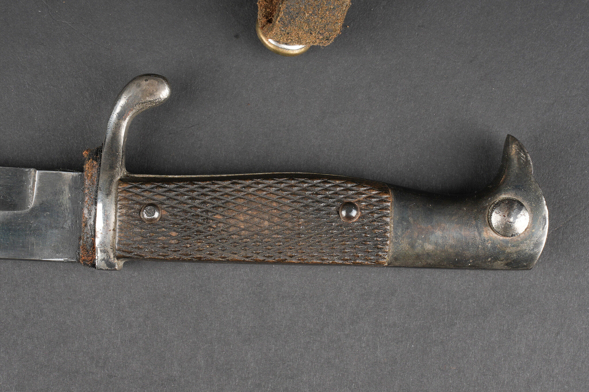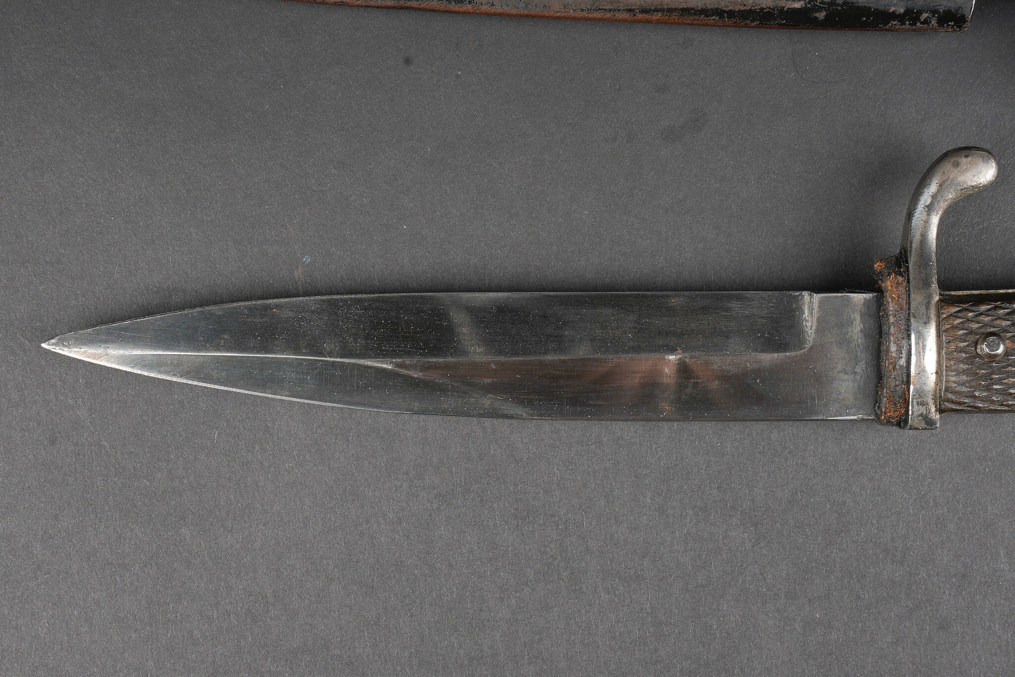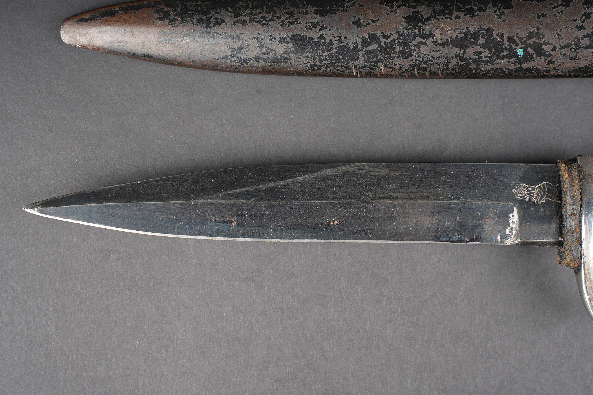 Poignard d’officier allemand ww1. Joli poignard, belle lame avec logo fabricant, personnage probablement Vulcain. Plaquettes quadrillées. Pommeau en tête d’aigle. Fourreau laqué noir, usure, patine, le passant et la patte de maintien ont été réparés. German officer dagger from the First World War with attractive blade bearing maker logo, probably depicting Vulcan. Chequered grip plates. Eagle head pommel. Black lacquered scabbard with wear and patina, suspension loop and retaining strap repaired.