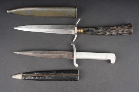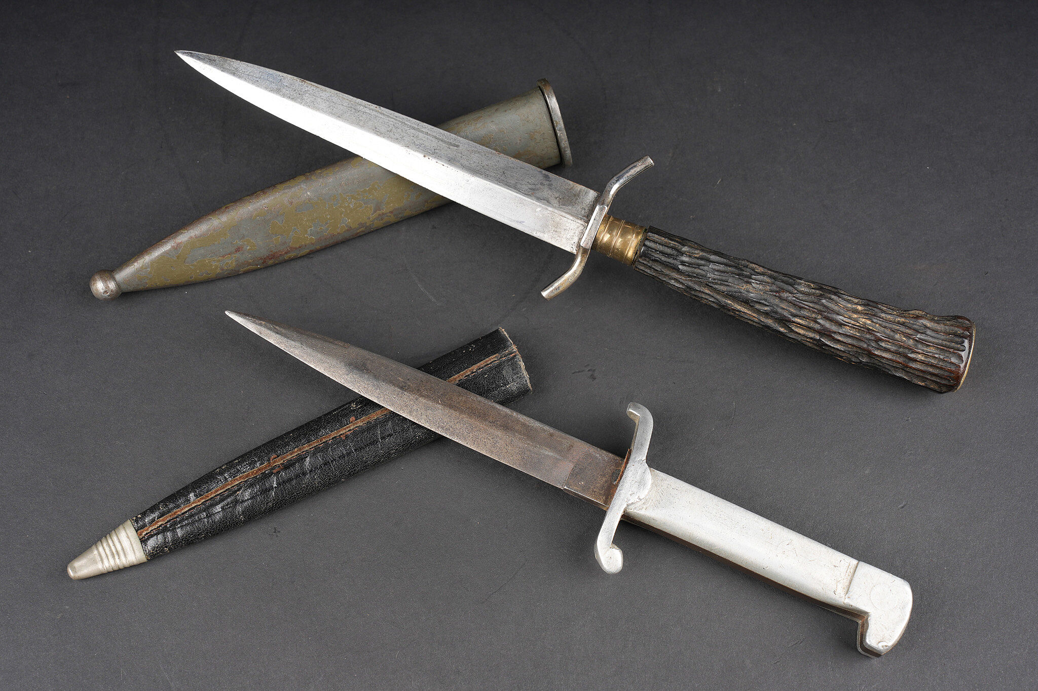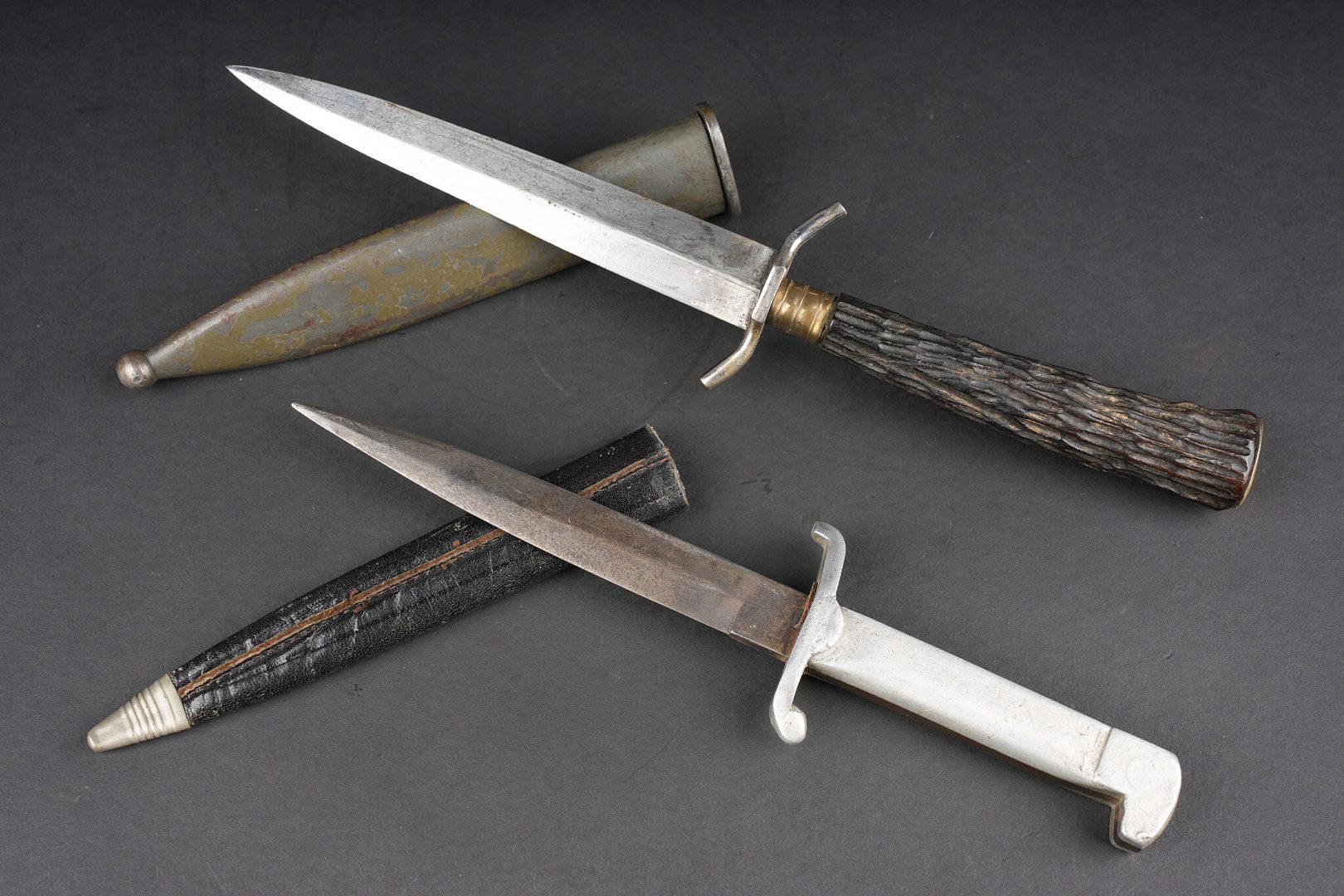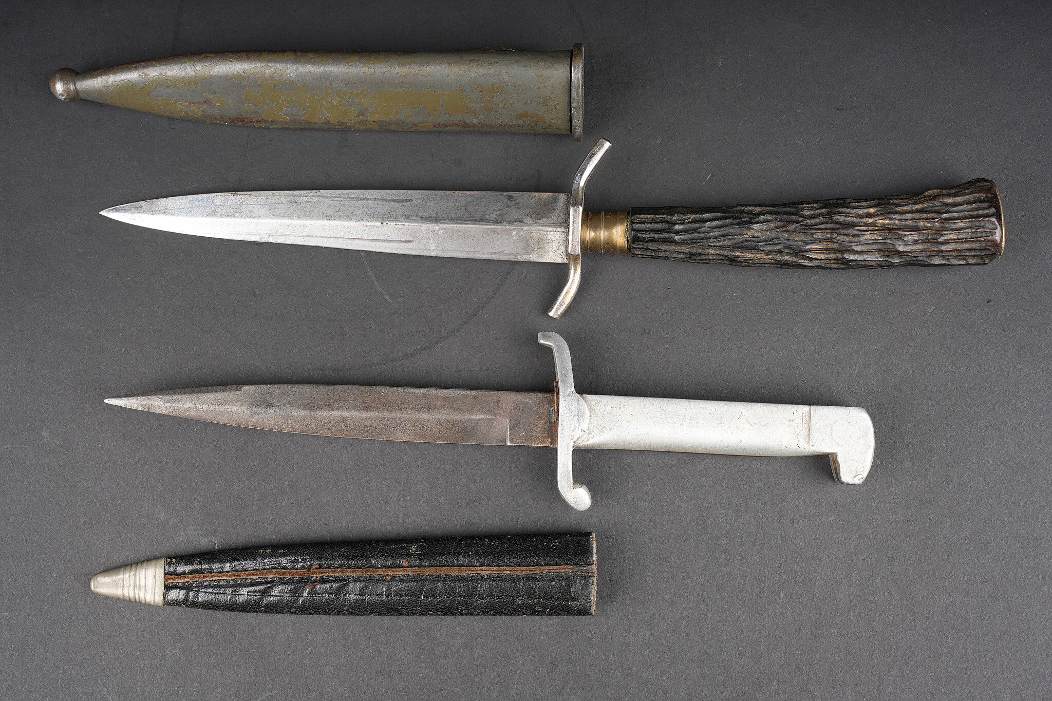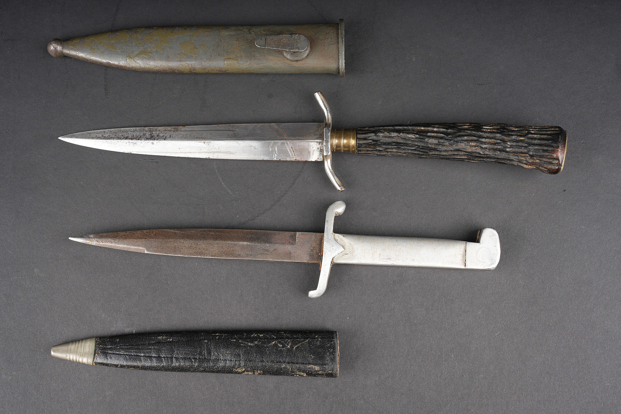 Détails de la vente >Poignard stylet et poignard artisanal. Poignard à double tranchant, poignée corne dans un fourreau métallique avec bouton de suspension. Un poignard à poignée aluminium, lame à dos plat avec... en savoir plus
