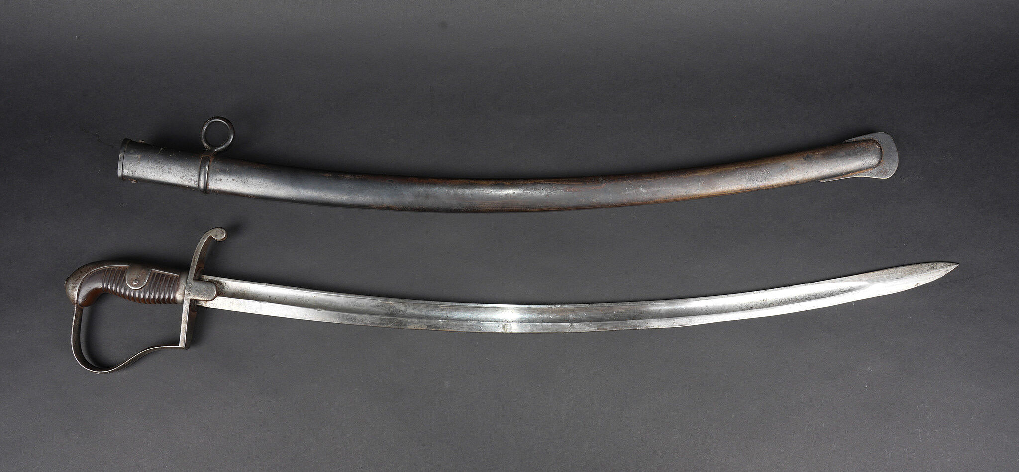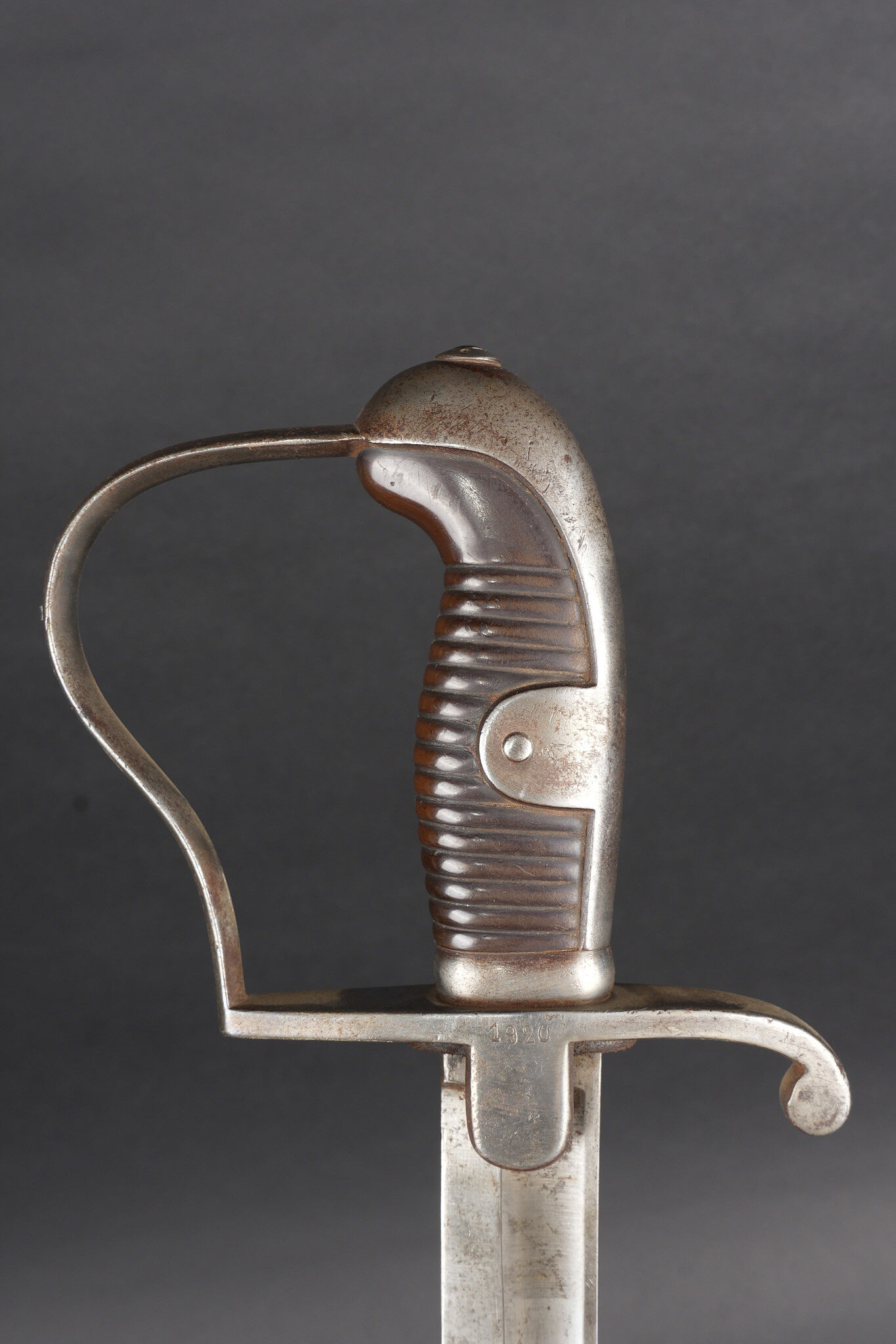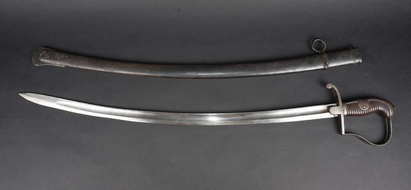 Sabre allemand de cavalerie Blucher neue Art de 1915. Beau et fort sabre allemand type Blucher dernière génération 1914, fabrication 1915 avec poinçons impériaux. Demi oreillon marqué 1920 pour réutilisation Reichswehr dans l’artillerie. Forte et belle lame courbe à pan creux et dos plat. Fourreau fer au même numéro que l’arme, un anneau de suspension. Bel état. German cavalry sabre, Blücher Neue Art type, late wartime production dated 1915 with imperial proofs. Demi-guard marked 1920 for postwar reuse in the Reichswehr artillery. Strong curved blade with fuller and flat back, matching numbered steel scabbard with single suspension ring. Very good preserved example