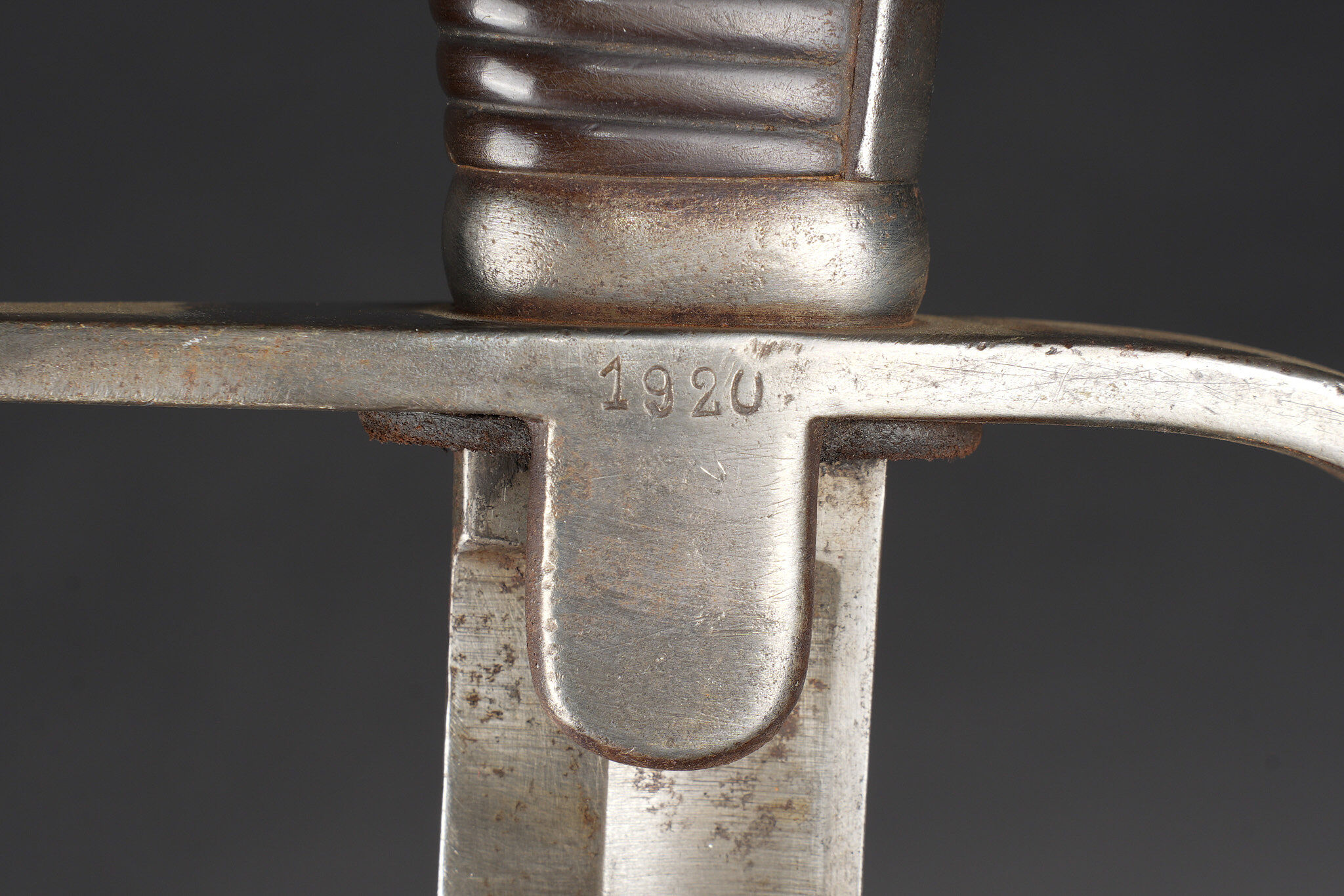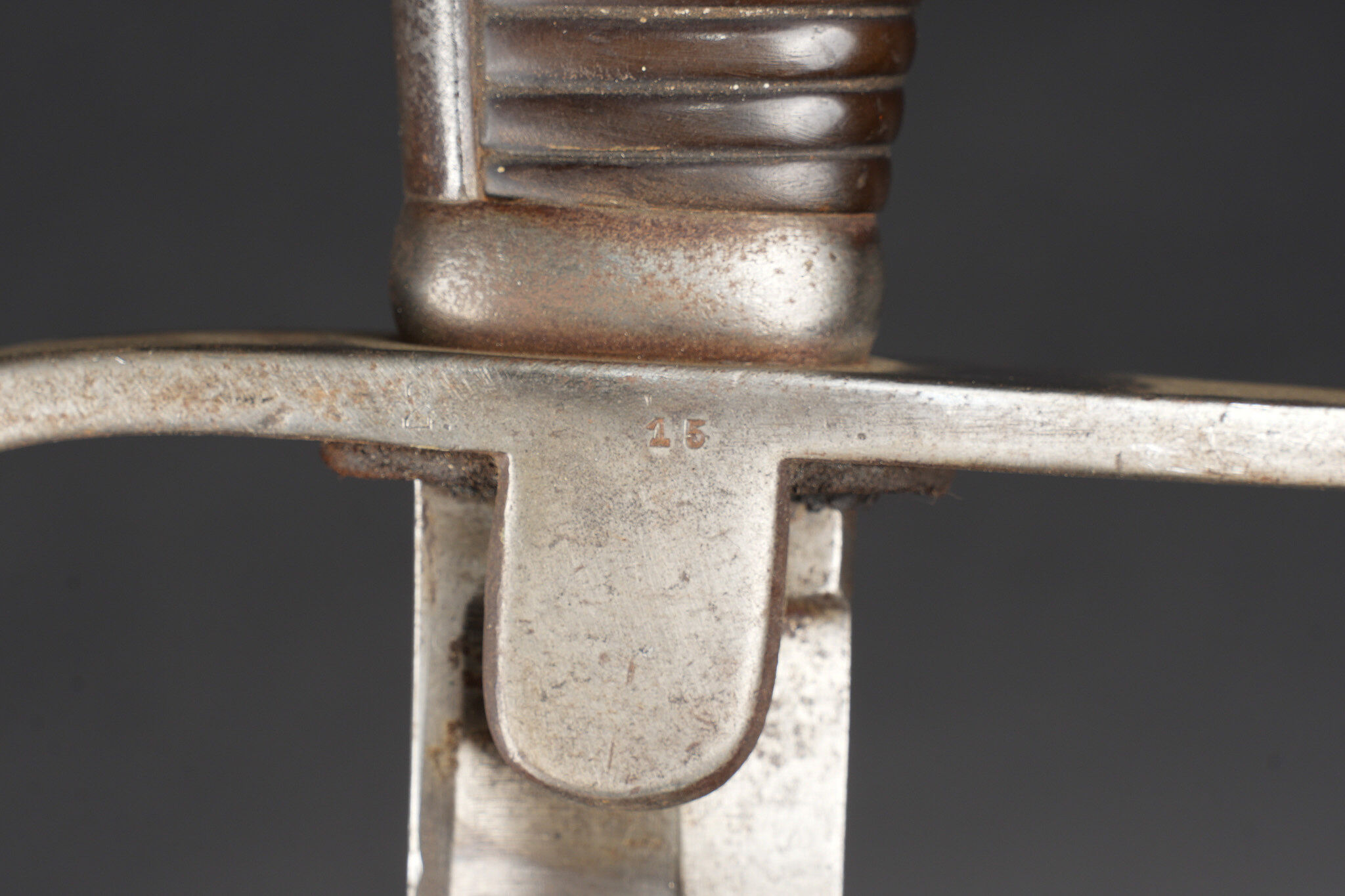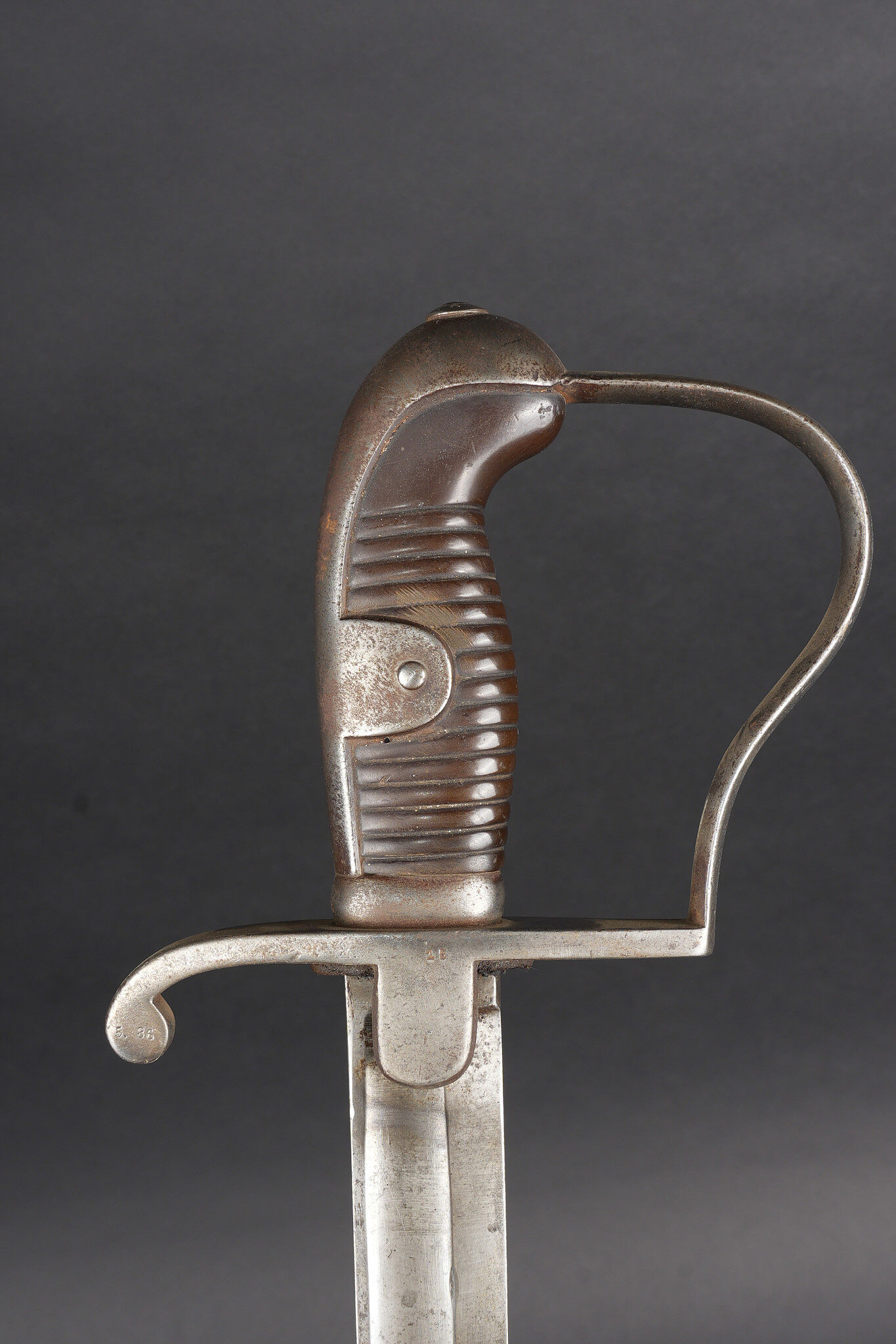 Sabre allemand de cavalerie Blucher neue Art de 1915. Beau et fort sabre allemand type Blucher dernière génération 1914, fabrication 1915 avec poinçons impériaux. Demi oreillon marqué 1920 pour réutilisation Reichswehr dans l’artillerie. Forte et belle lame courbe à pan creux et dos plat. Fourreau fer au même numéro que l’arme, un anneau de suspension. Bel état. German cavalry sabre, Blücher Neue Art type, late wartime production dated 1915 with imperial proofs. Demi-guard marked 1920 for postwar reuse in the Reichswehr artillery. Strong curved blade with fuller and flat back, matching numbered steel scabbard with single suspension ring. Very good preserved example