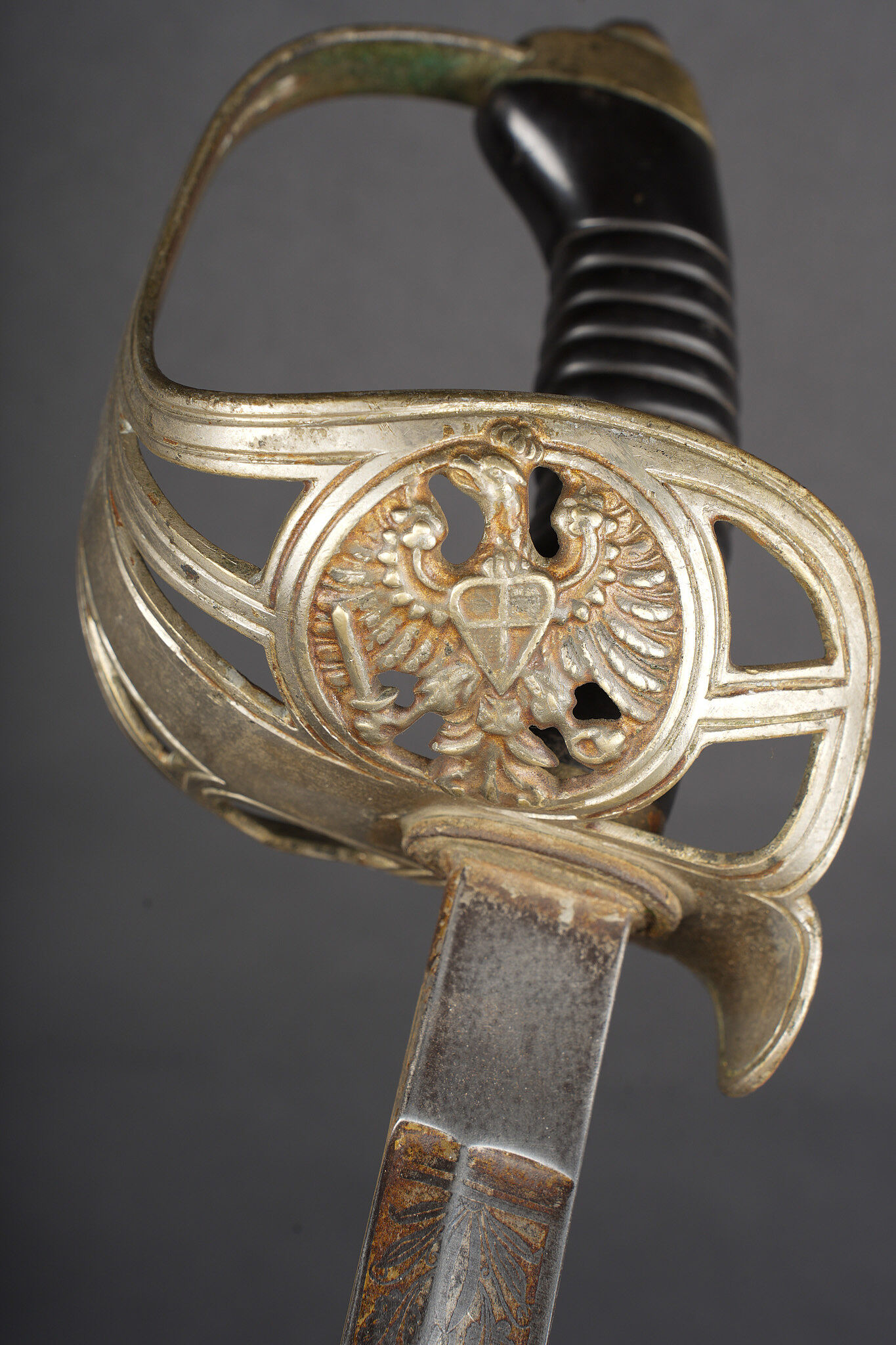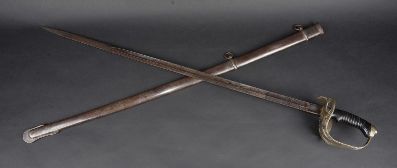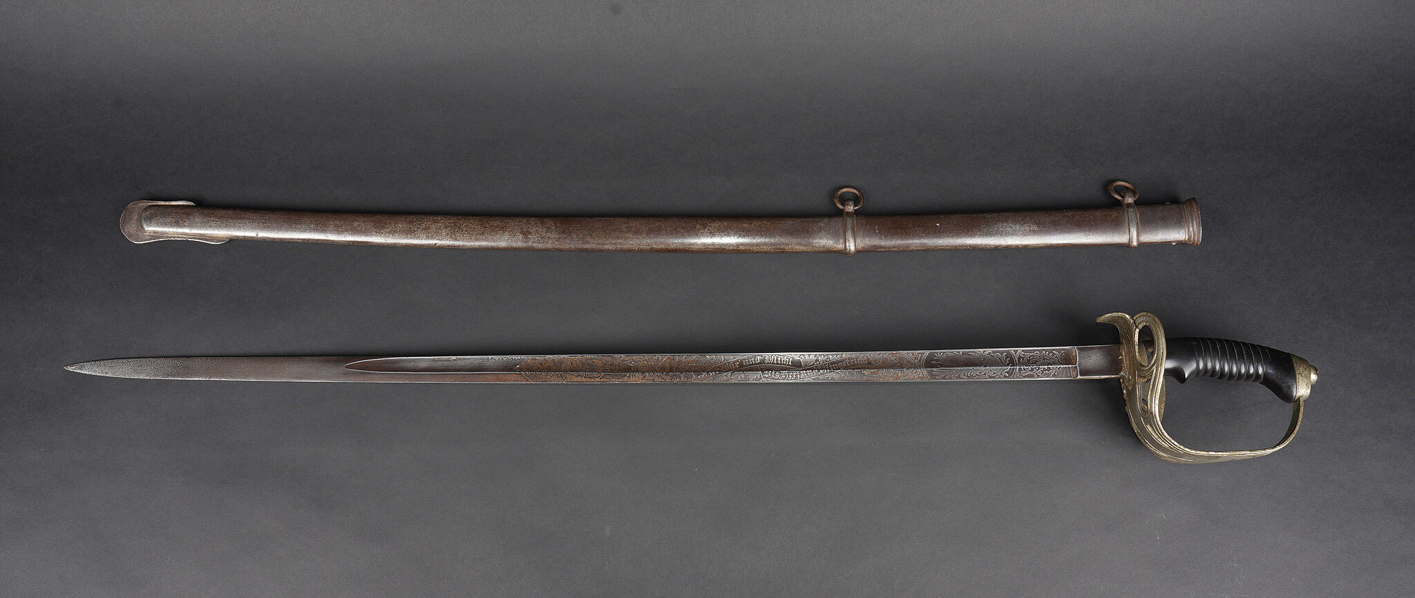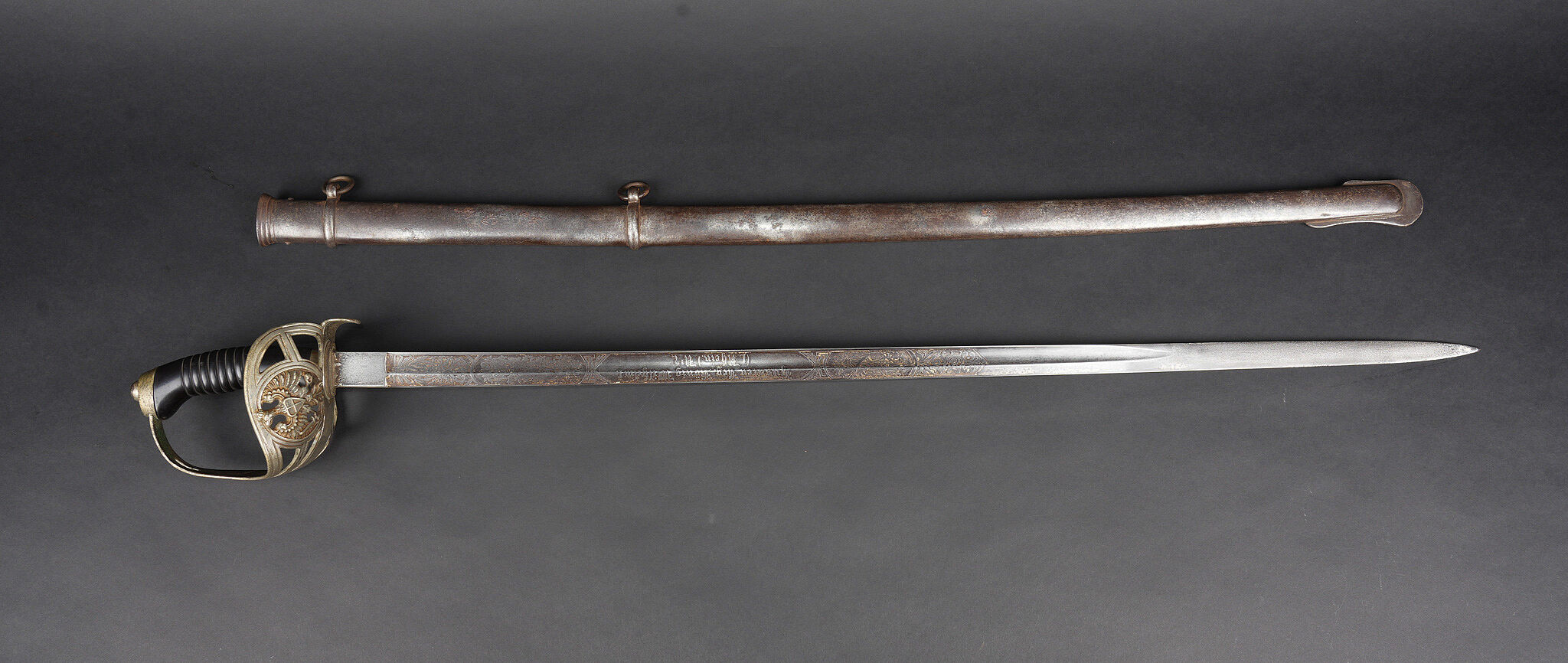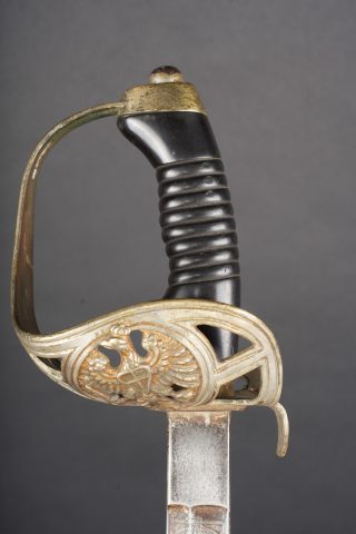 Sabre allemand de cavalerie M1889 troupe du 7e Hussards. Kavalleriedegen M1889 d’achat privé à lame gravée au Husaren Regiment Nr 7 König Wilhelm I de Bonn. Poignée ergonomique, garde ajourée, ciselée de l’aigle allemand, une branche secondaire cassée à la jonction supérieure. Lame à pan creux, dos plat, gravée de motifs végétaux et trophées, gravée au nom du régiment d’un côté et de l’autre la devise Für Ehr und Pflicht bis Herz und Klinge bricht. Un peu de jeu de la lame. Fourreau fer à deux anneaux de suspension, non au modèle. Kavallerie Degen M1889 private purchase enlisted cavalry sword engraved to Husaren Regiment Nr 7 König Wilhelm I. Ergonomic grip, pierced guard with German eagle, one secondary branch broken at upper junction. Blade with fuller and flat back, engraved with vegetal motifs, trophies, regiment name and the same regimental motto. Slight blade play. Iron scabbard with two suspension rings, not matching regulation model.