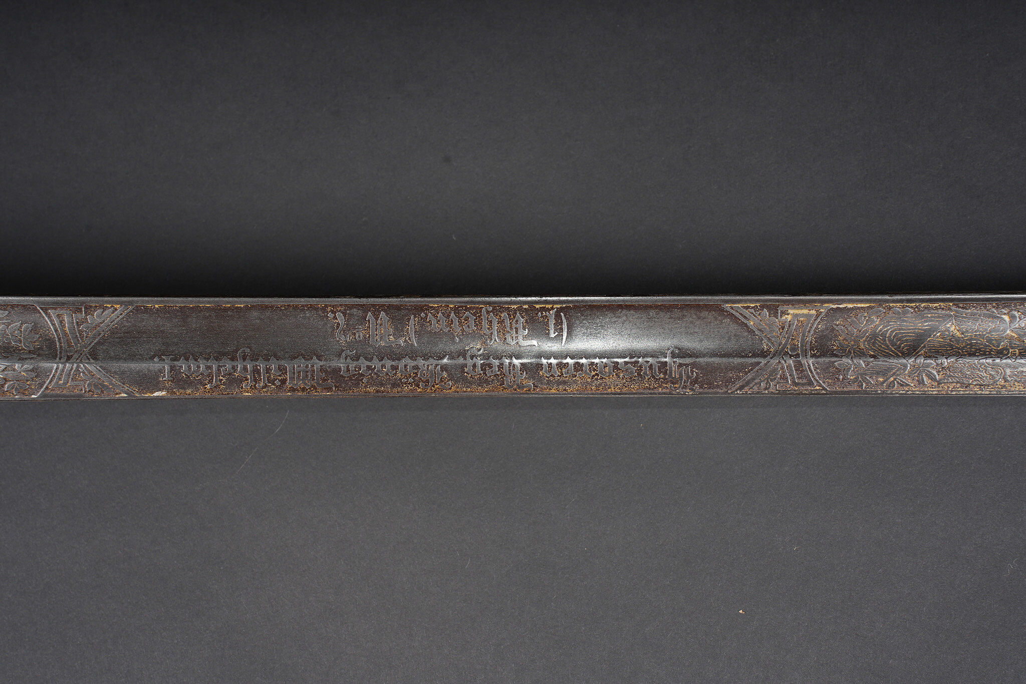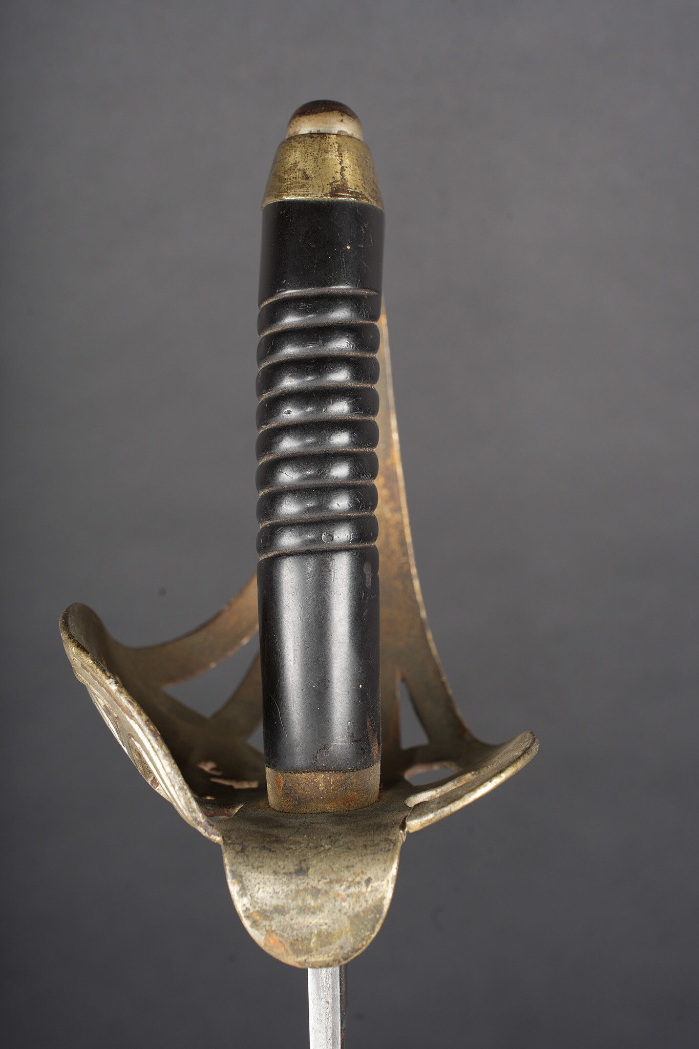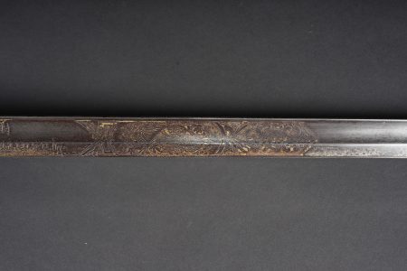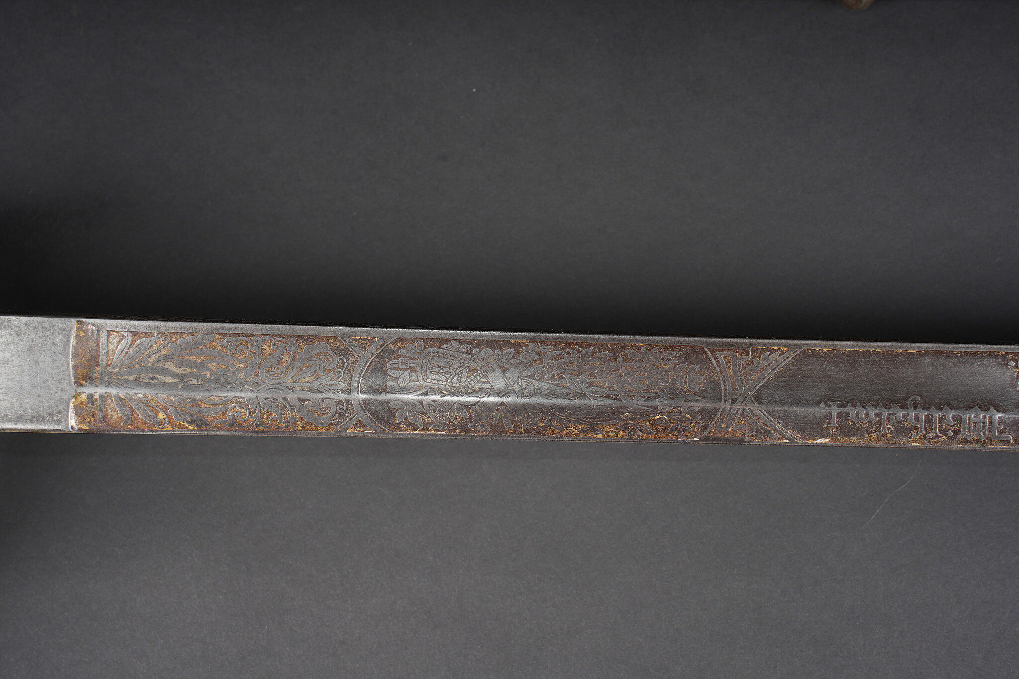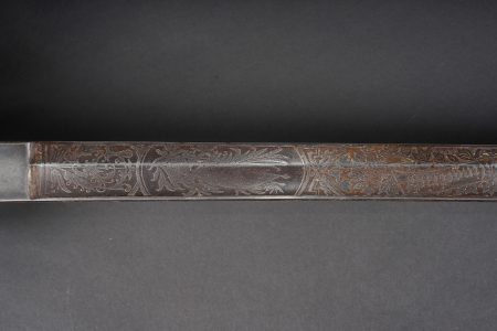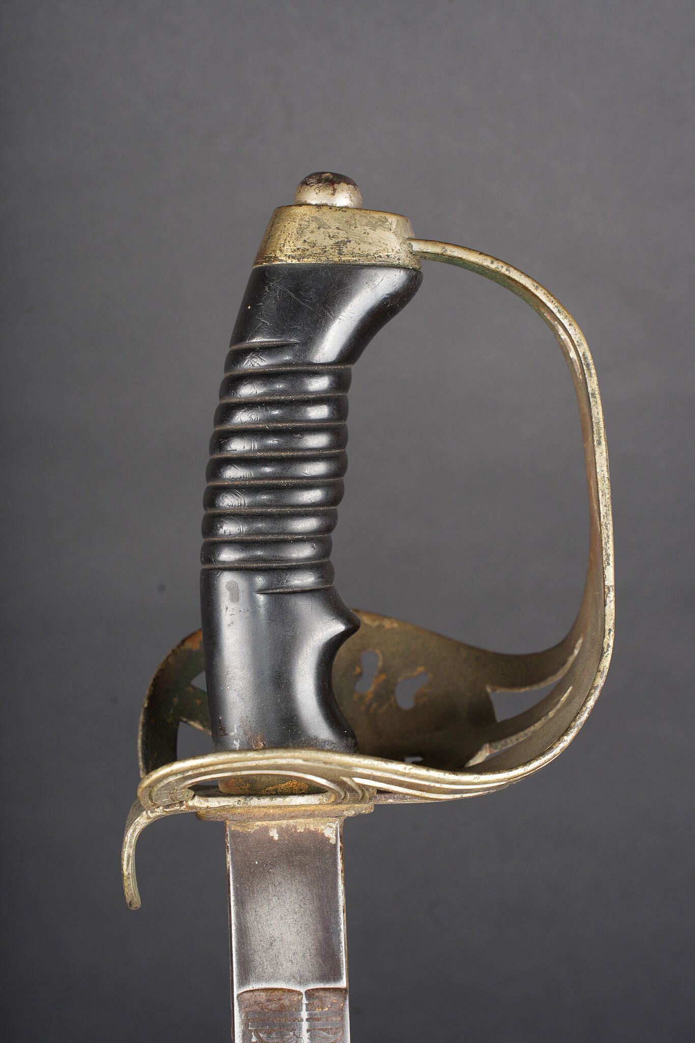 Sabre allemand de cavalerie M1889 troupe du 7e Hussards. Kavalleriedegen M1889 d’achat privé à lame gravée au Husaren Regiment Nr 7 König Wilhelm I de Bonn. Poignée ergonomique, garde ajourée, ciselée de l’aigle allemand, une branche secondaire cassée à la jonction supérieure. Lame à pan creux, dos plat, gravée de motifs végétaux et trophées, gravée au nom du régiment d’un côté et de l’autre la devise Für Ehr und Pflicht bis Herz und Klinge bricht. Un peu de jeu de la lame. Fourreau fer à deux anneaux de suspension, non au modèle. Kavallerie Degen M1889 private purchase enlisted cavalry sword engraved to Husaren Regiment Nr 7 König Wilhelm I. Ergonomic grip, pierced guard with German eagle, one secondary branch broken at upper junction. Blade with fuller and flat back, engraved with vegetal motifs, trophies, regiment name and the same regimental motto. Slight blade play. Iron scabbard with two suspension rings, not matching regulation model.