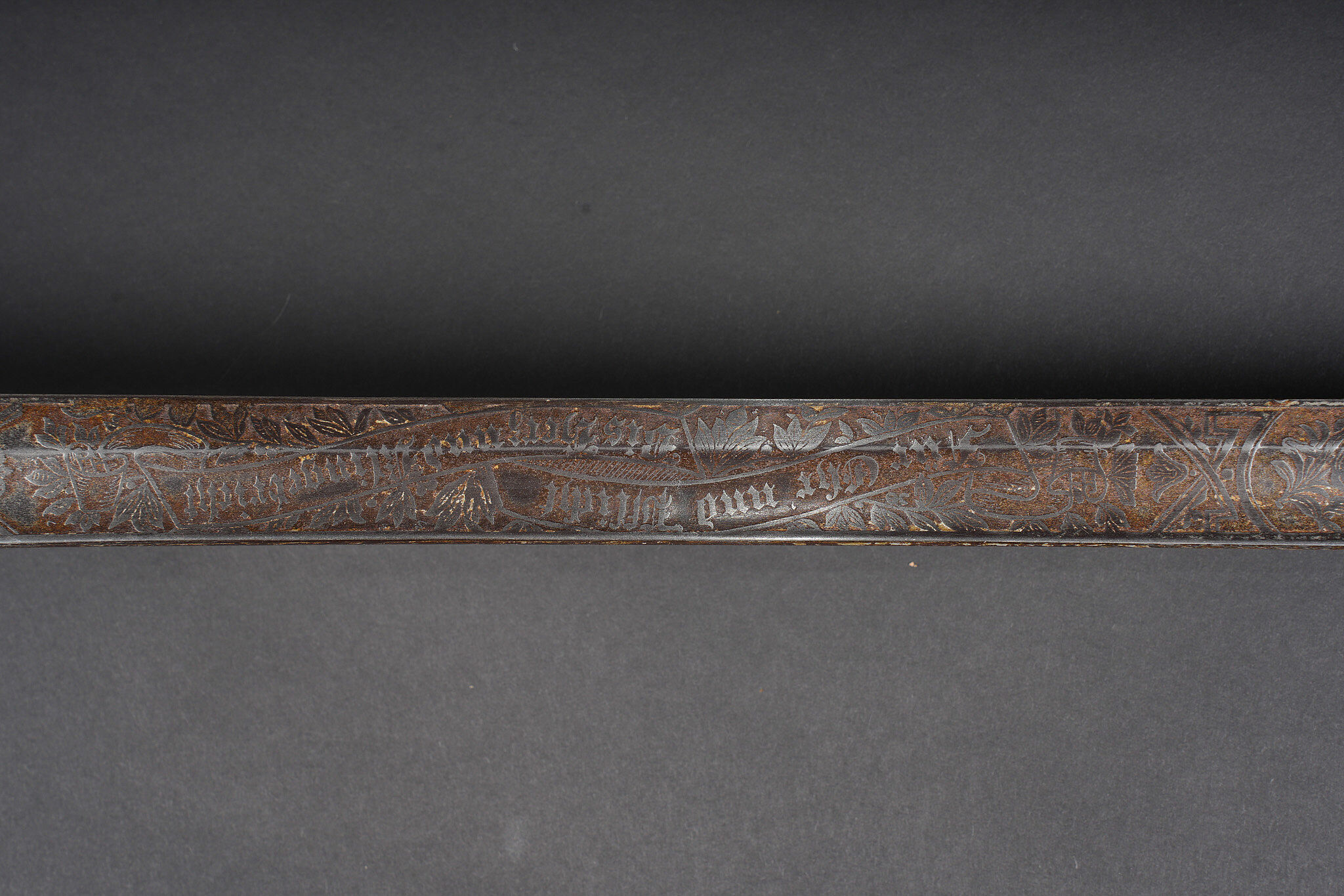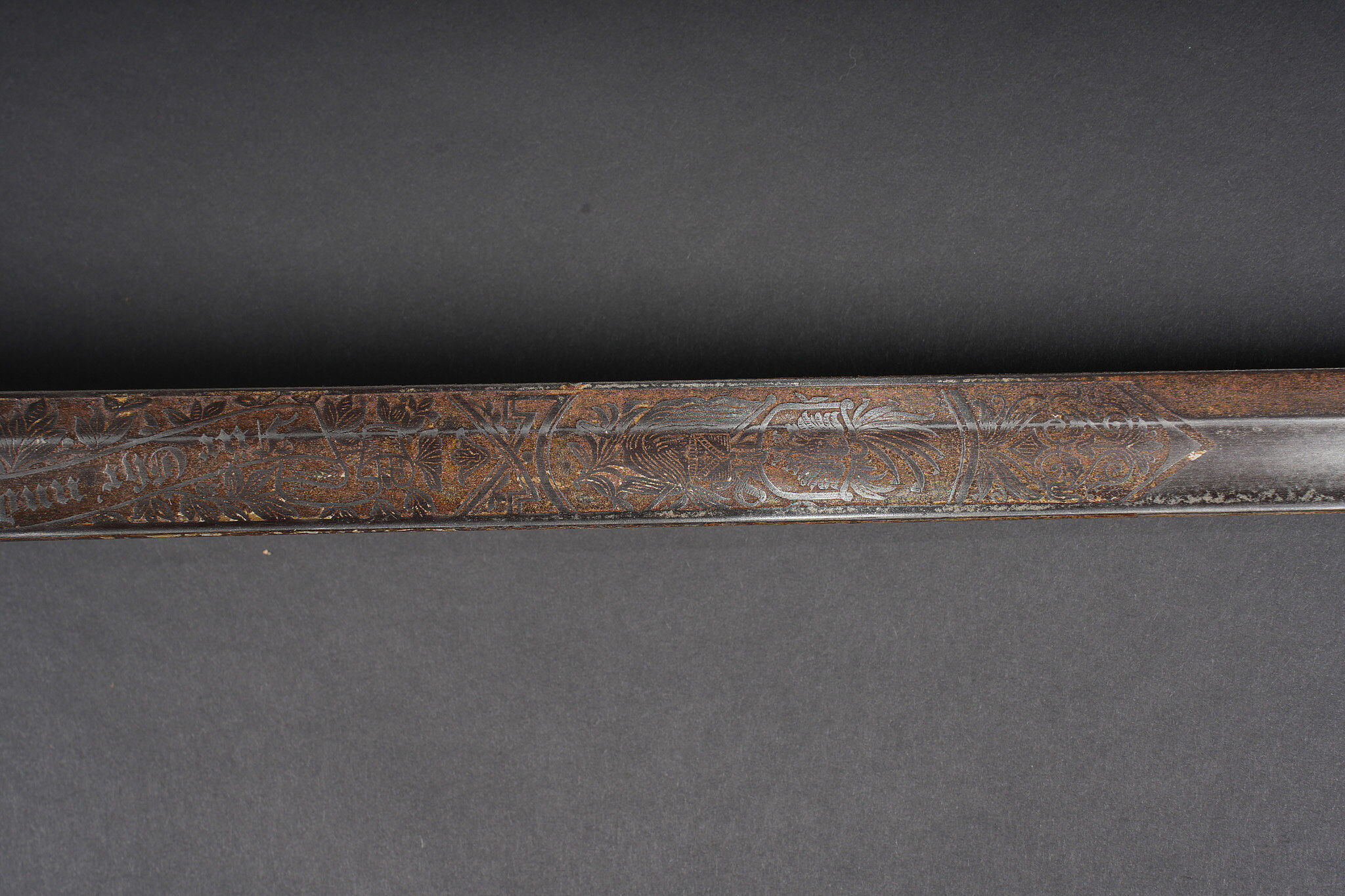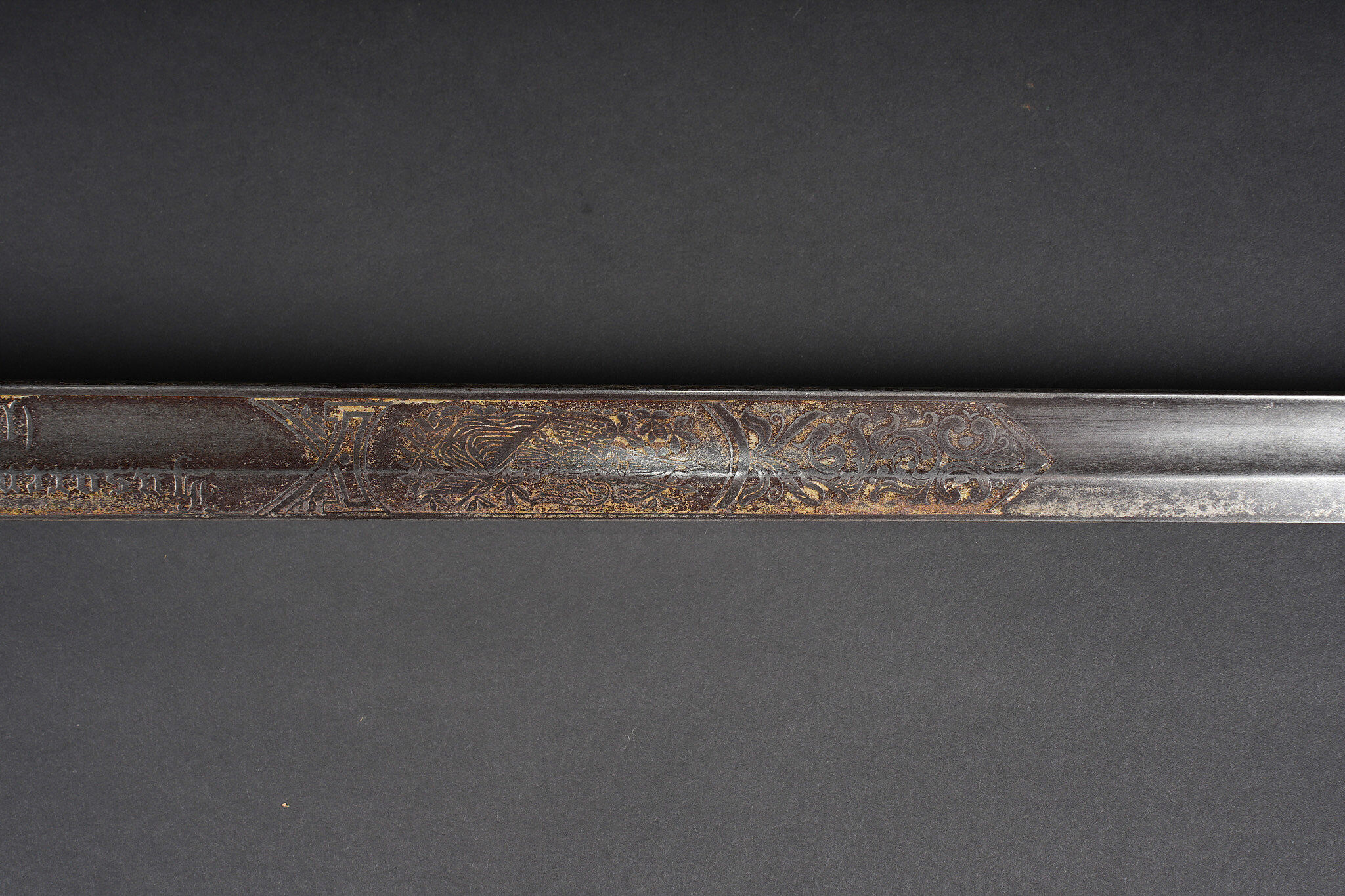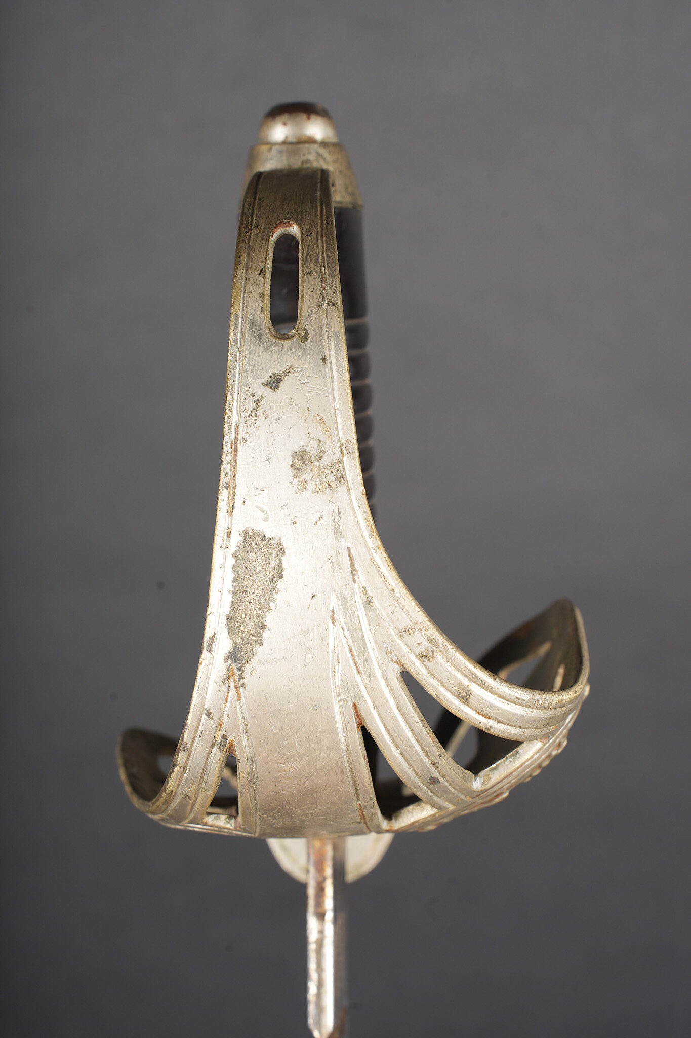 Sabre allemand de cavalerie M1889 troupe du 7e Hussards. Kavalleriedegen M1889 d’achat privé à lame gravée au Husaren Regiment Nr 7 König Wilhelm I de Bonn. Poignée ergonomique, garde ajourée, ciselée de l’aigle allemand, une branche secondaire cassée à la jonction supérieure. Lame à pan creux, dos plat, gravée de motifs végétaux et trophées, gravée au nom du régiment d’un côté et de l’autre la devise Für Ehr und Pflicht bis Herz und Klinge bricht. Un peu de jeu de la lame. Fourreau fer à deux anneaux de suspension, non au modèle. Kavallerie Degen M1889 private purchase enlisted cavalry sword engraved to Husaren Regiment Nr 7 König Wilhelm I. Ergonomic grip, pierced guard with German eagle, one secondary branch broken at upper junction. Blade with fuller and flat back, engraved with vegetal motifs, trophies, regiment name and the same regimental motto. Slight blade play. Iron scabbard with two suspension rings, not matching regulation model.