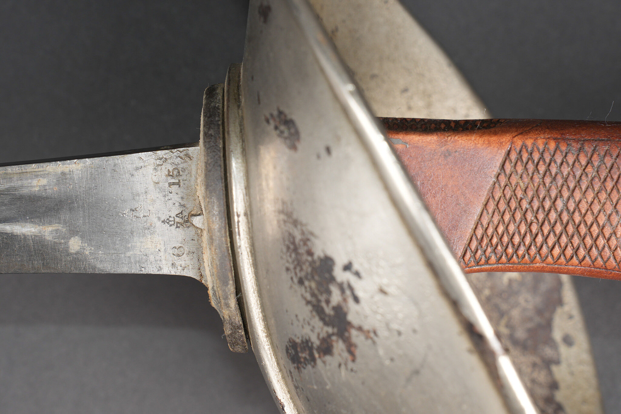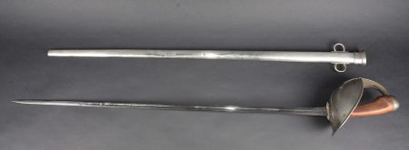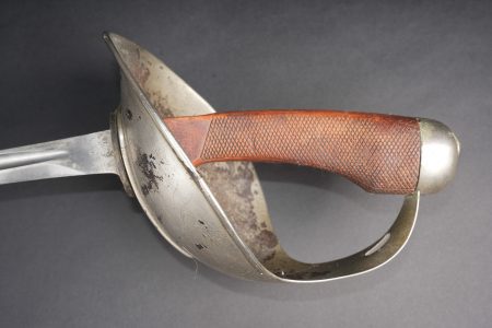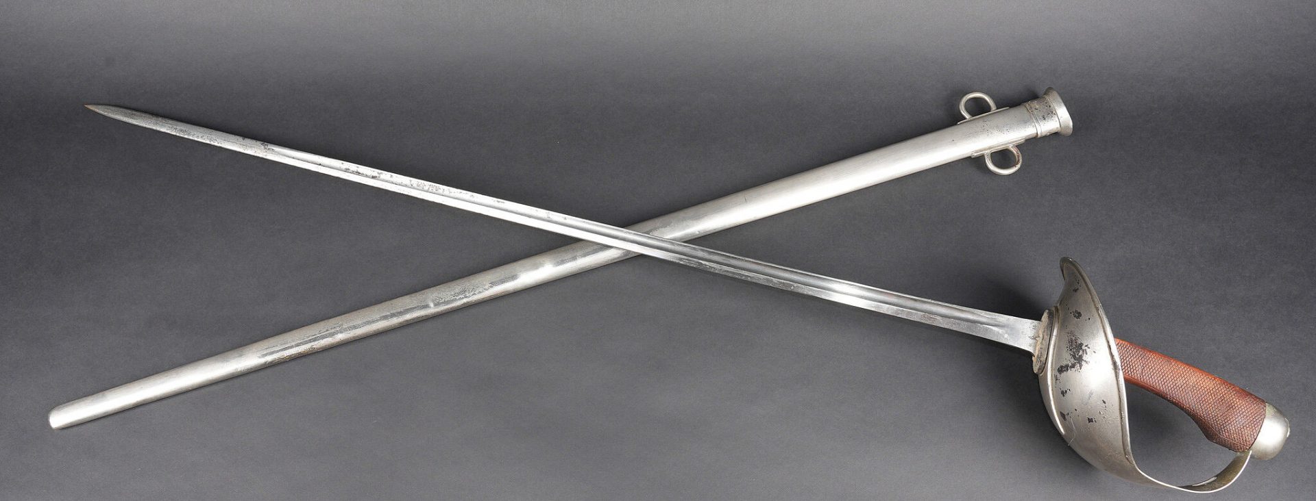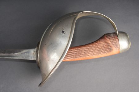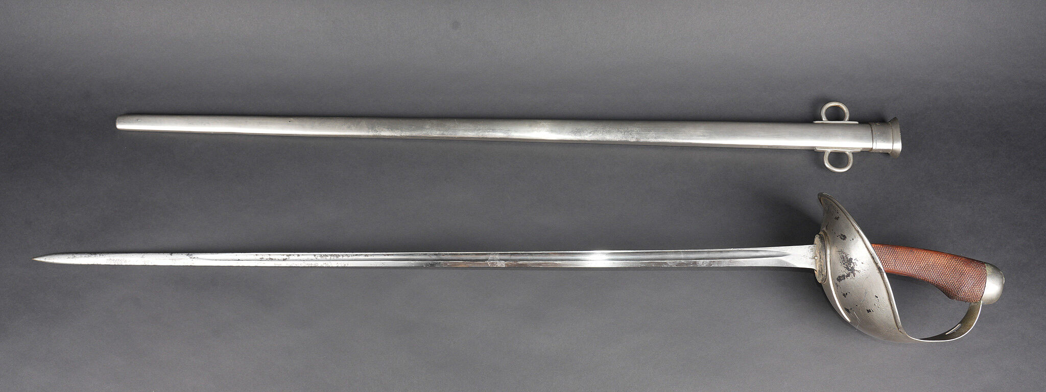 Sabre de cavalerie anglais modèle 1908 du Royal Horse Guards. Belle lame datée Août 1915, poignée ergonomique quadrillée en bon état. Coquille avec marquage R.H.G. à l’intérieur pour Royal Horse Guards et numéro d’arme. Fourreau poli daté 1916. Bel état, usure d’usage. British cavalry sabre model 1908 of the Royal Horse Guards with fine blade dated August 1915, ergonomic chequered grip in good condition, bowl guard marked R.H.G. internally for Royal Horse Guards with weapon number, and polished scabbard dated 1916. Good overall condition with normal service wear.