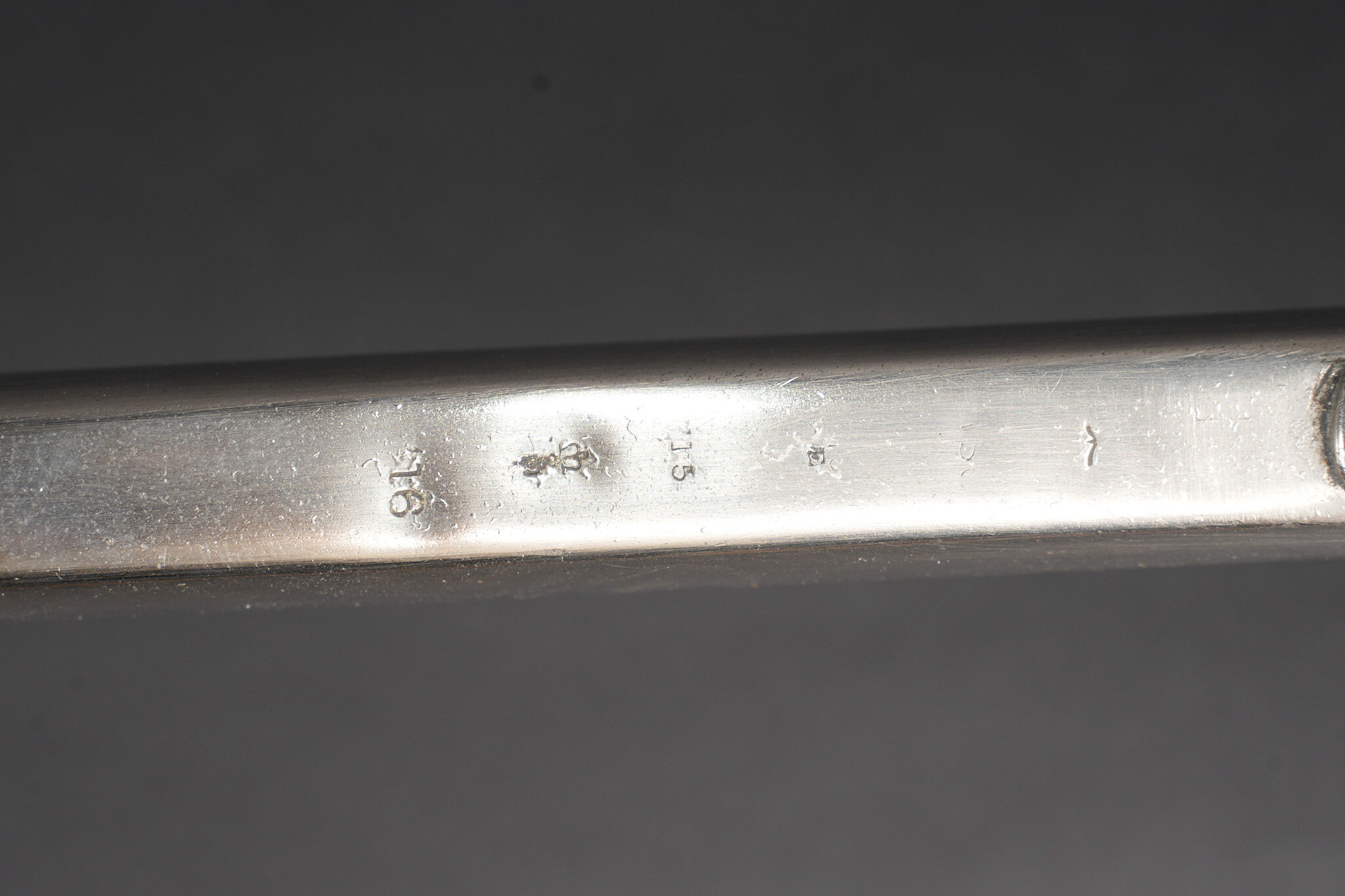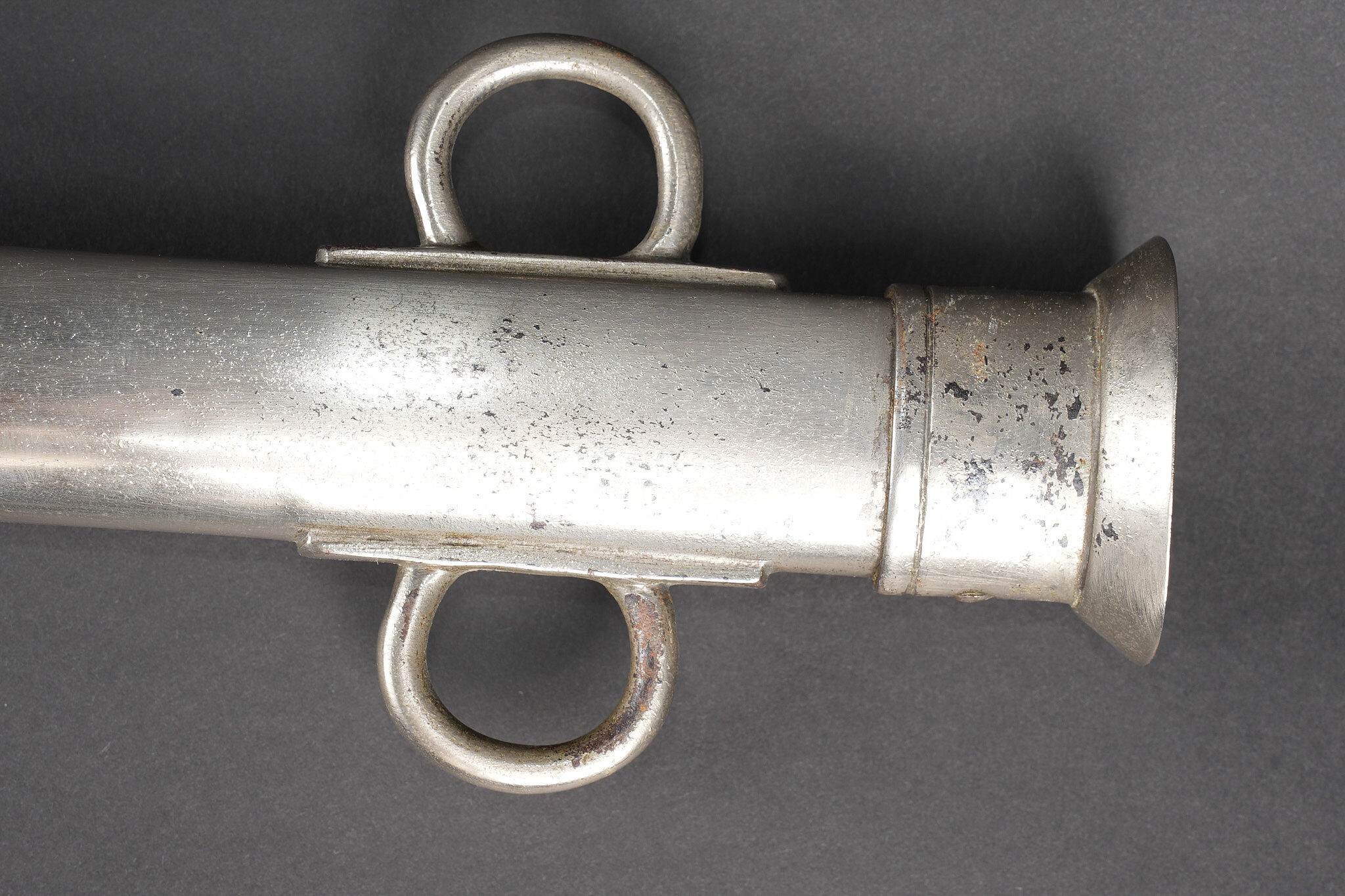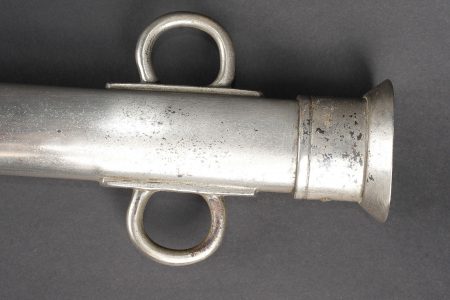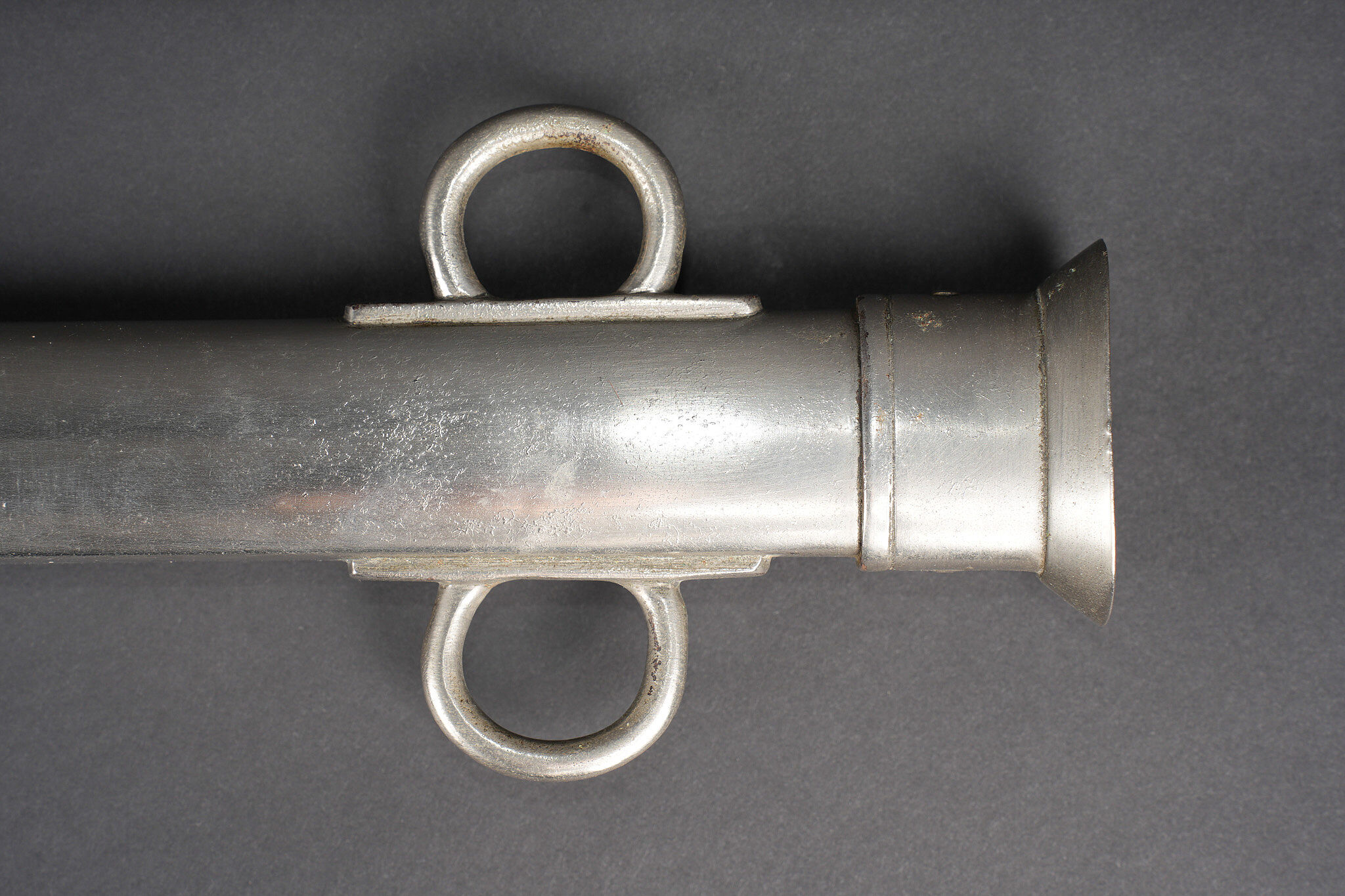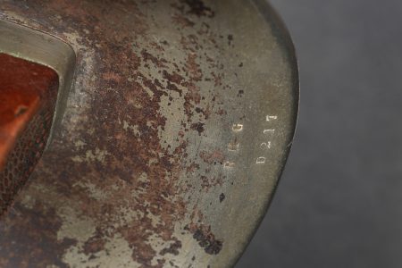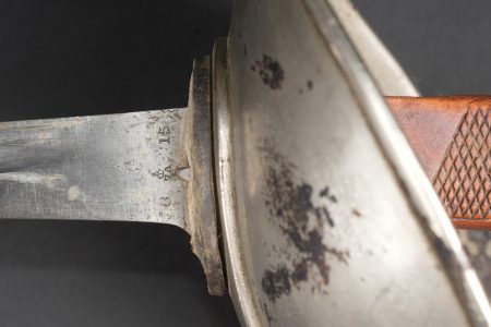 Sabre de cavalerie anglais modèle 1908 du Royal Horse Guards. Belle lame datée Août 1915, poignée ergonomique quadrillée en bon état. Coquille avec marquage R.H.G. à l’intérieur pour Royal Horse Guards et numéro d’arme. Fourreau poli daté 1916. Bel état, usure d’usage. British cavalry sabre model 1908 of the Royal Horse Guards with fine blade dated August 1915, ergonomic chequered grip in good condition, bowl guard marked R.H.G. internally for Royal Horse Guards with weapon number, and polished scabbard dated 1916. Good overall condition with normal service wear.