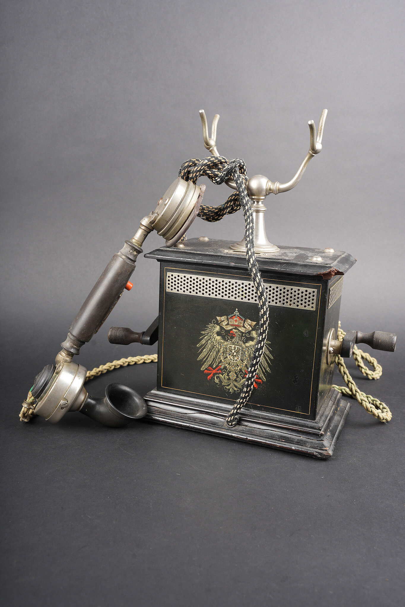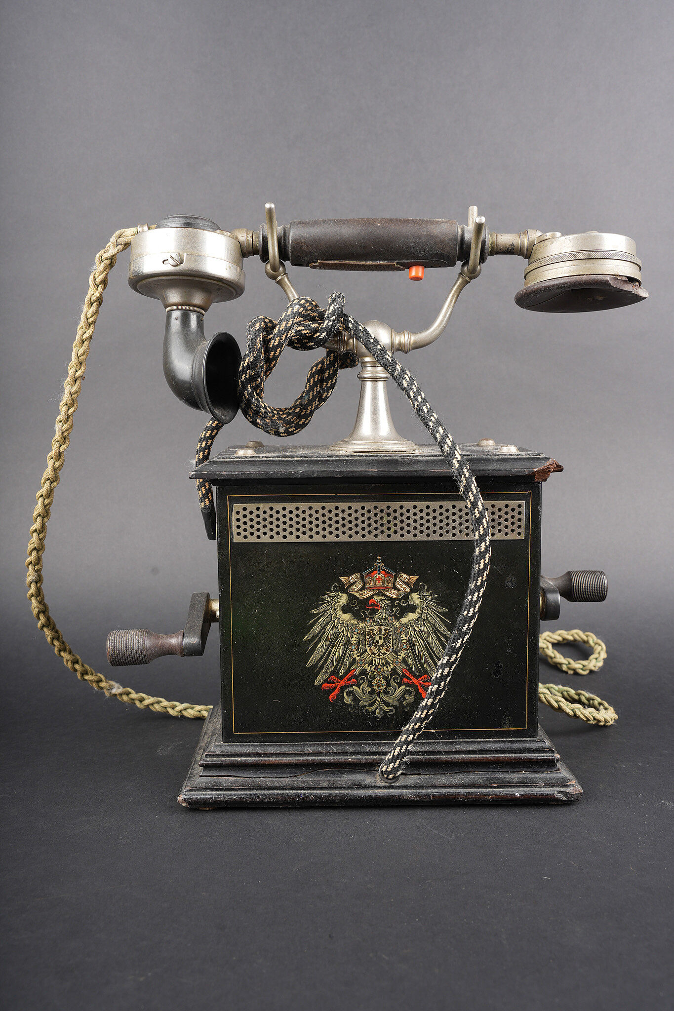 Téléphone allemand type OB05 de 1912. Très beau téléphone impérial allemand, de bureau, type OB05 année modèle 1905, daté 9.5.12 pour 1912. Avec de part et d’autre une aigle impériale allemande sérigraphie, ses deux manivelles, son combiné et un cordon, sans fiche. Très bel état, usure d’usage, quelques cassures et manques sur l’écouteur. Très décoratif. OB05 telephone very fine imperial German desk telephone type OB05, model year 1905, dated 9.5.12 for 1912. Decorated on both sides with imperial German eagle transfers. Retains both cranks, handset and one cord without plug. Very attractive condition, service wear, minor breaks and losses on the receiver. Highly decorative