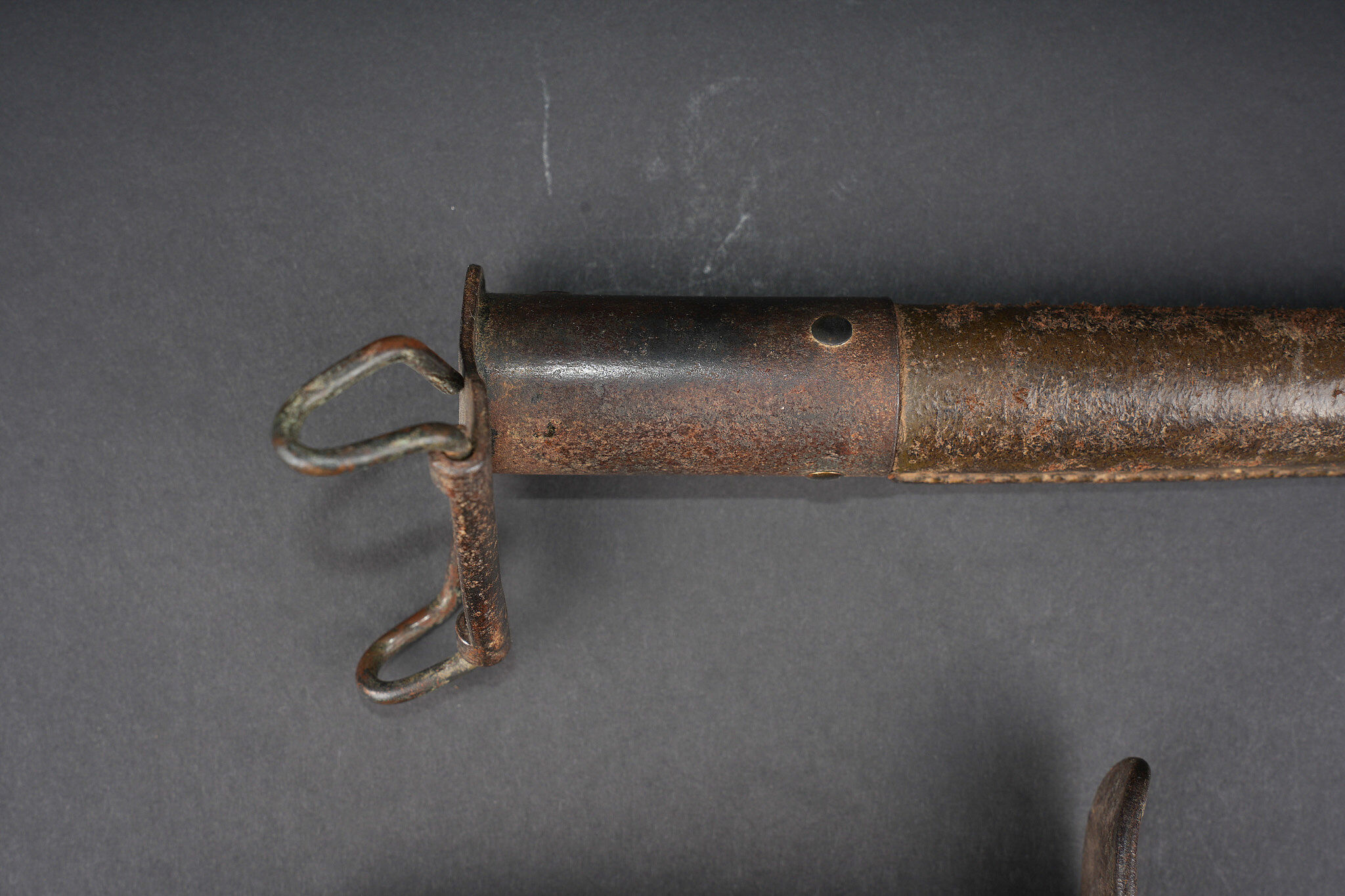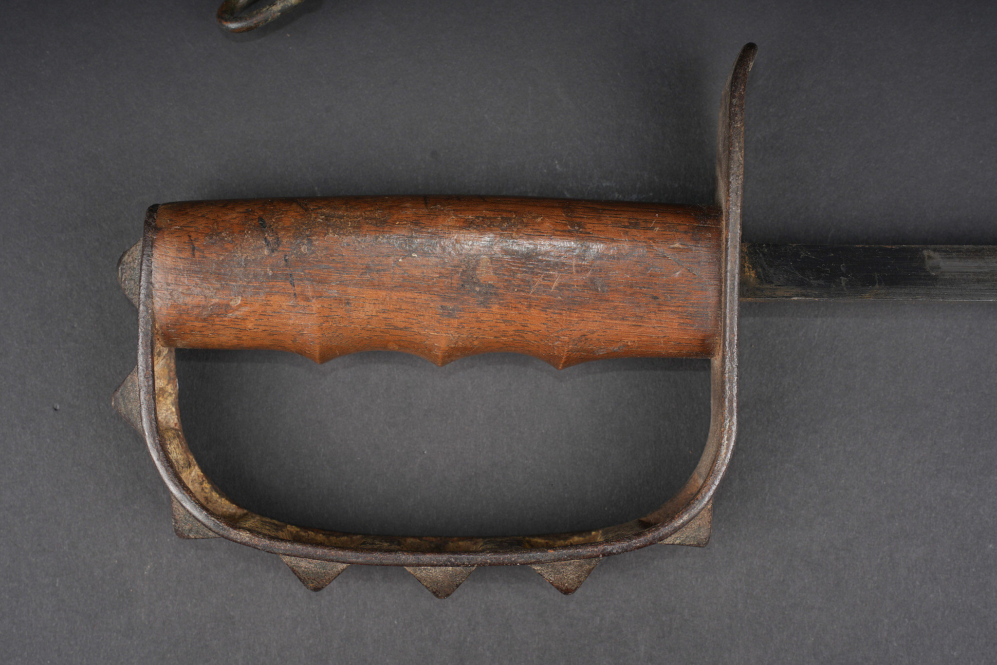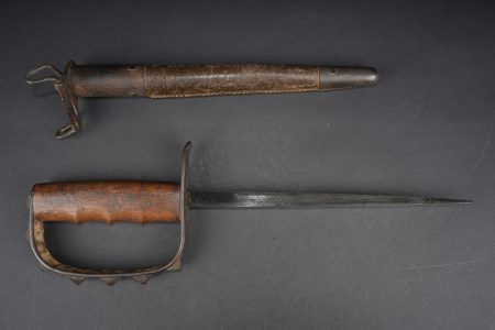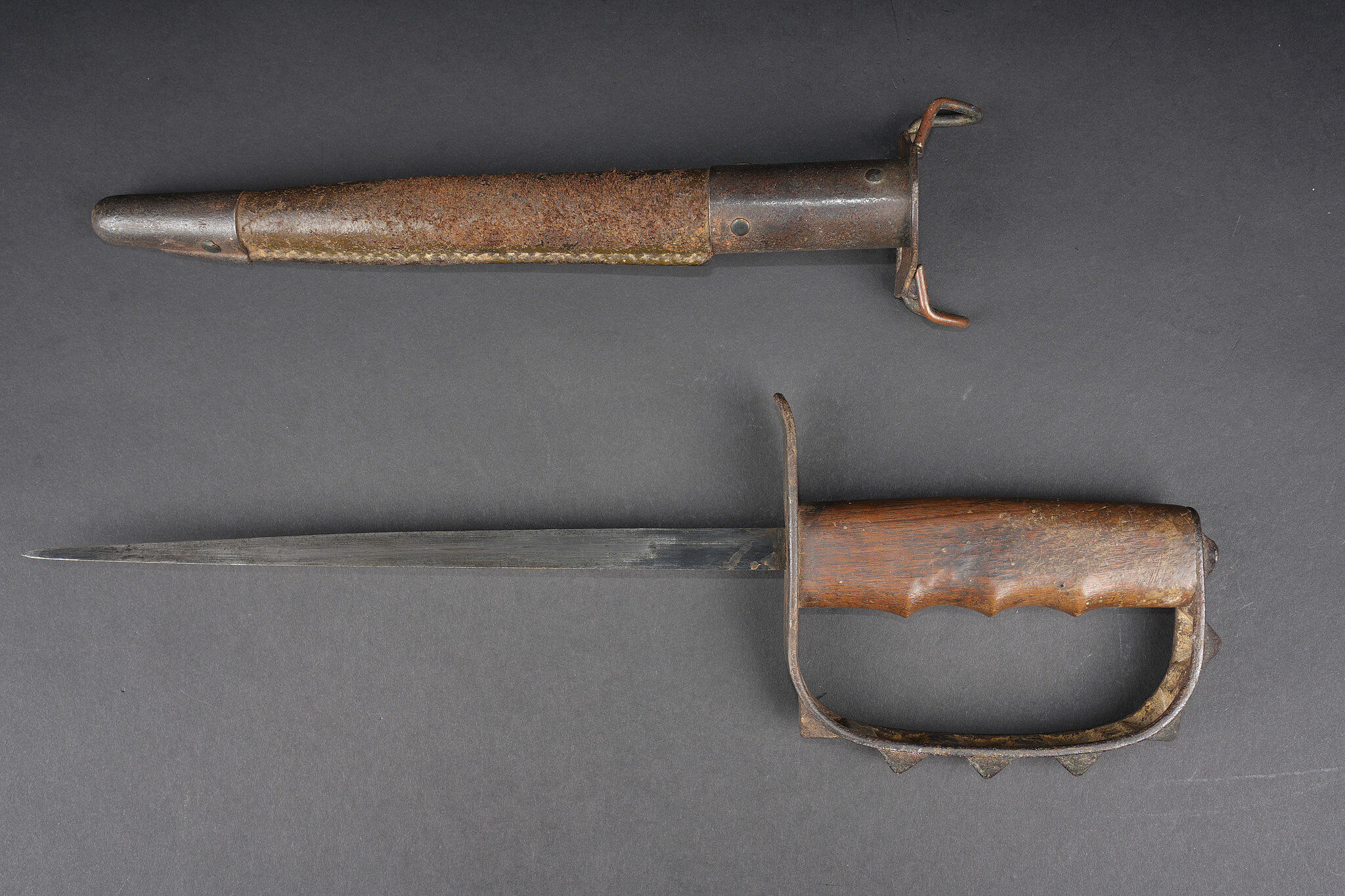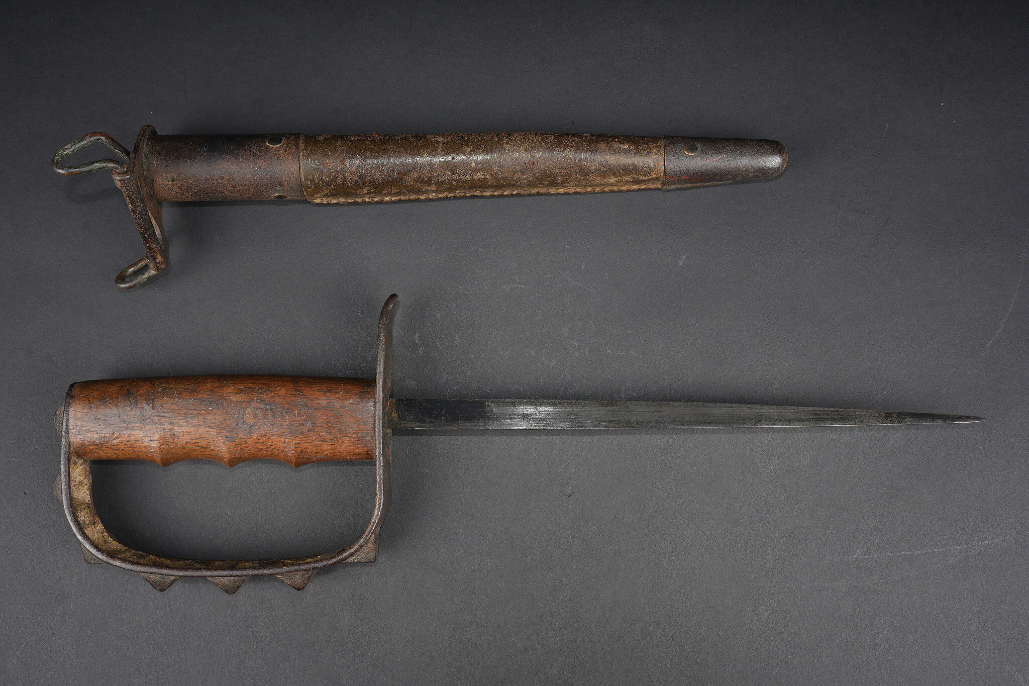 Poignard de combat Trench Knife US17. Poignée en bois, marquage sur le dessous du quillon LF & C 1917, belle lame triangulaire. Garde garnie de pics pyramidaux. Fourreau en cuir et garnitures en métal, légèrement oxydées, avec son crochet de ceinturon. Bon état, usure d’usage, patine. US Mark I trench knife with wooden grip, marked LF & C 1917 beneath the guard, fitted with a fine triangular blade and guard with pyramidal spikes. Leather scabbard with metal mounts showing light oxidation, complete with belt hook. Good condition with service wear and patina.