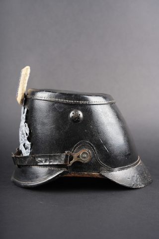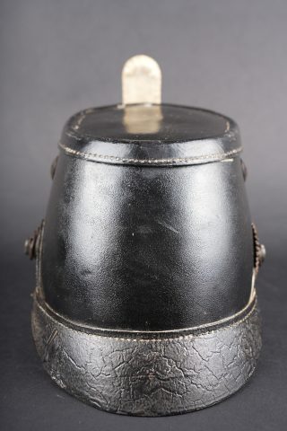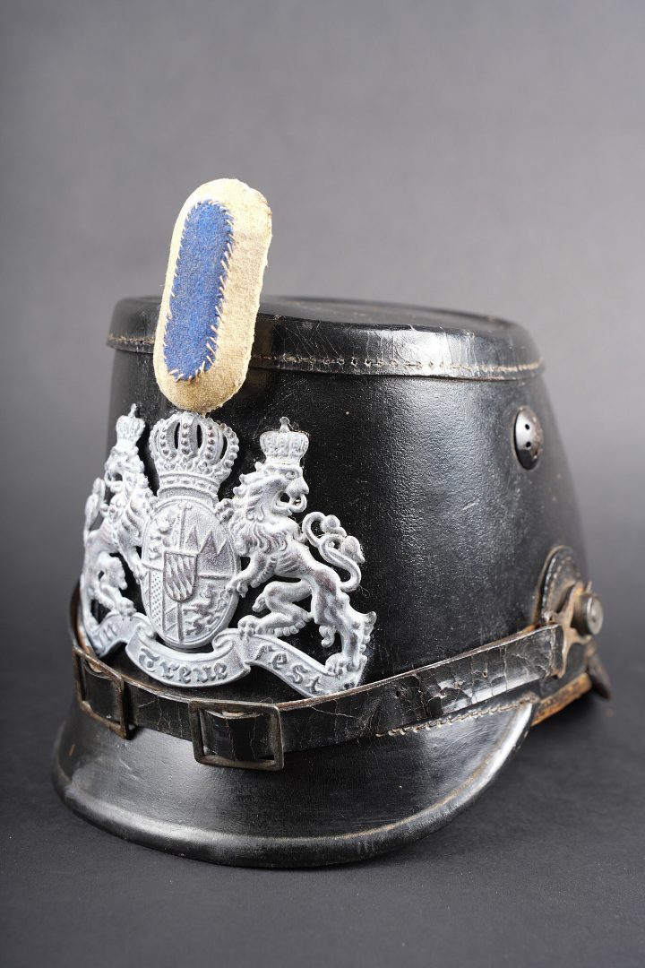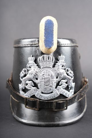 Détails de la vente >Tschako bavarois M1915. Belle bombe, non repercée, de forme spécifique bavaroise. Bel aspect, marquage fabricant à l’intérieur sur la calotte. Belle plaque bavaroise en fer peint... en savoir plus