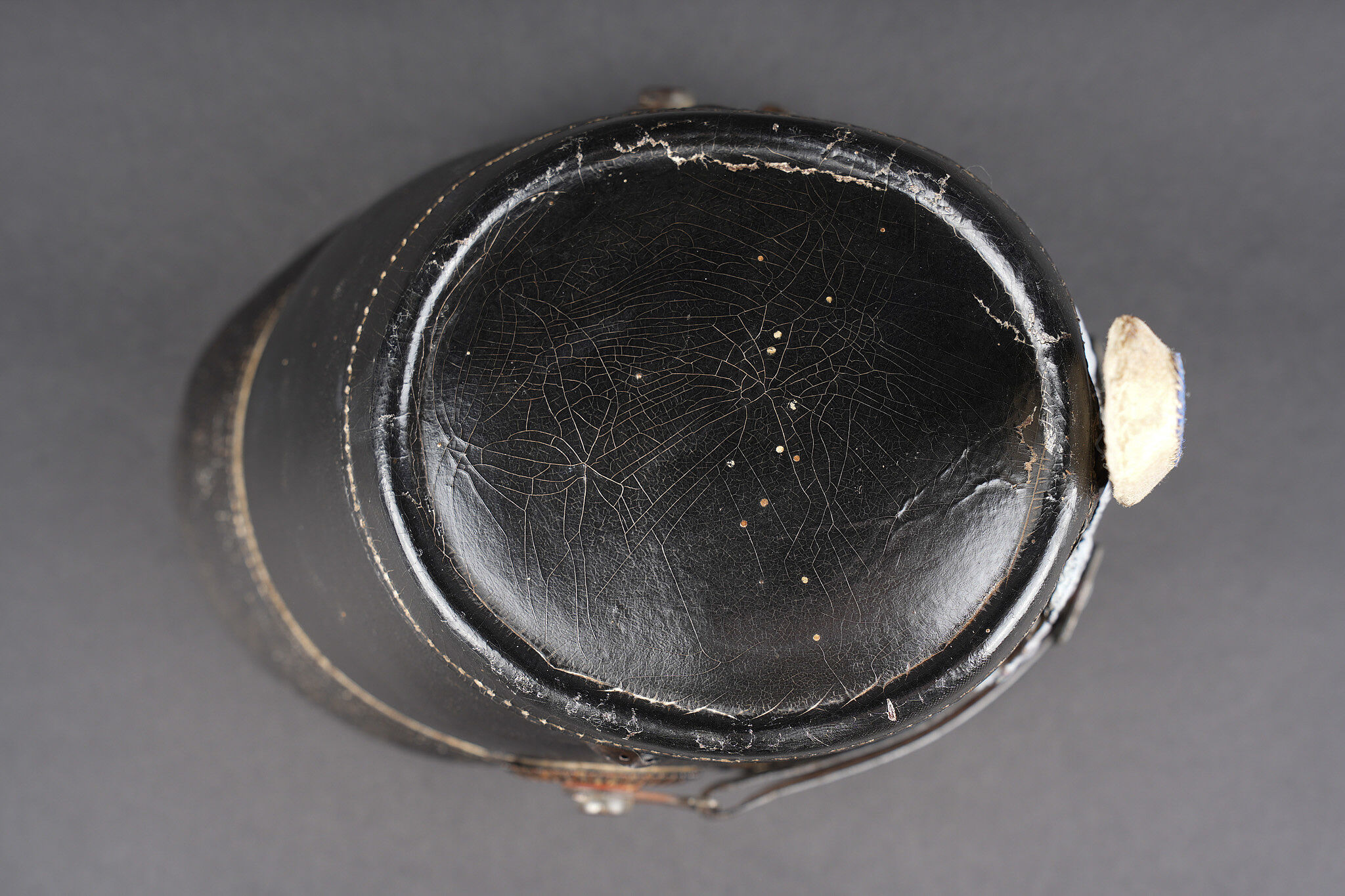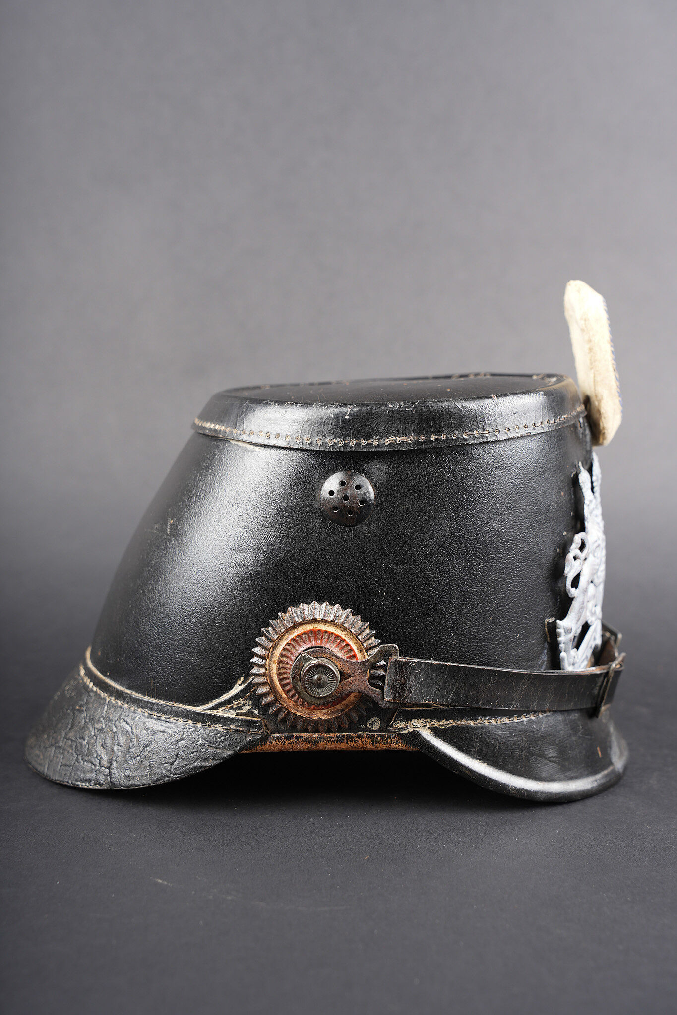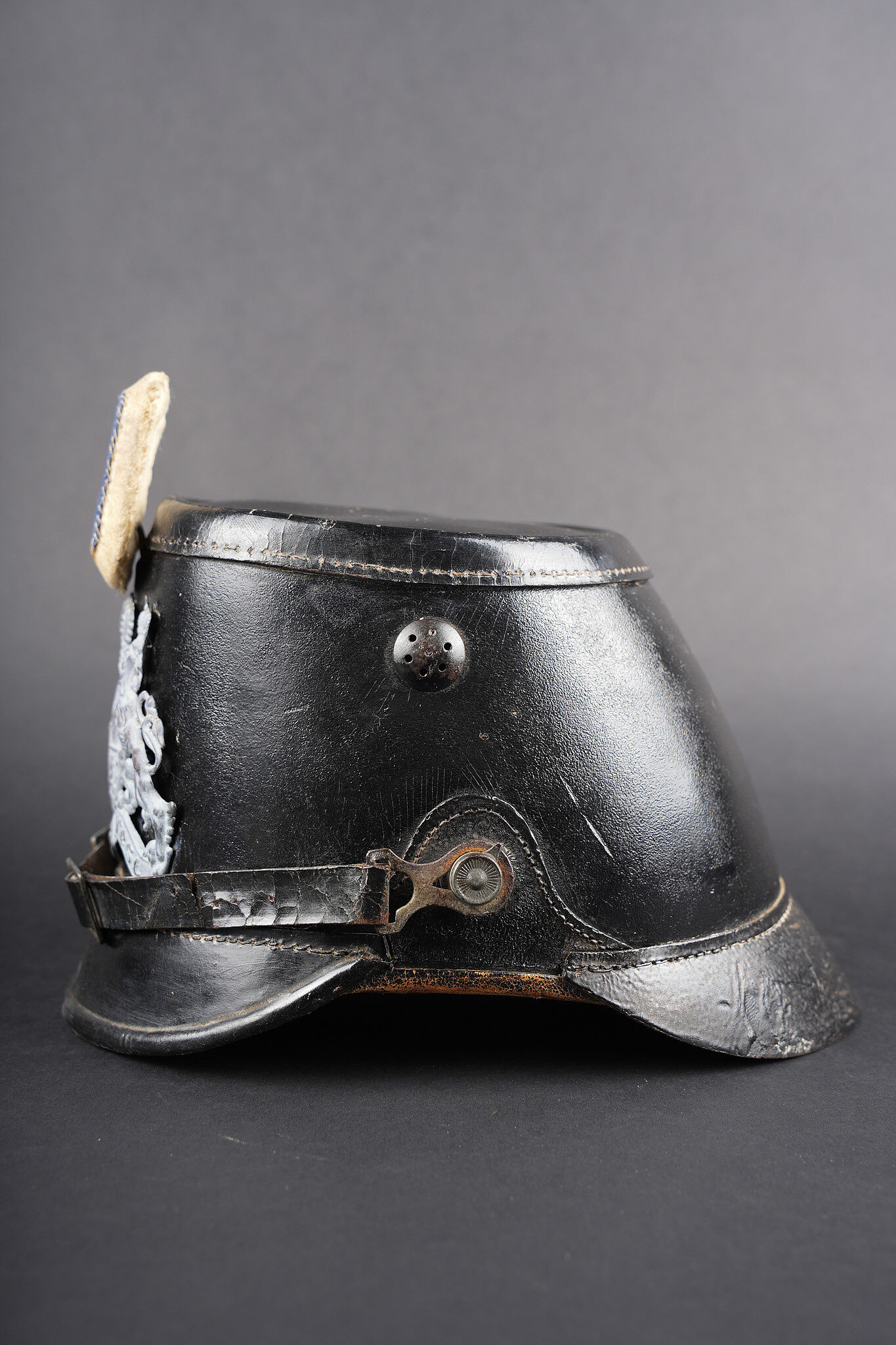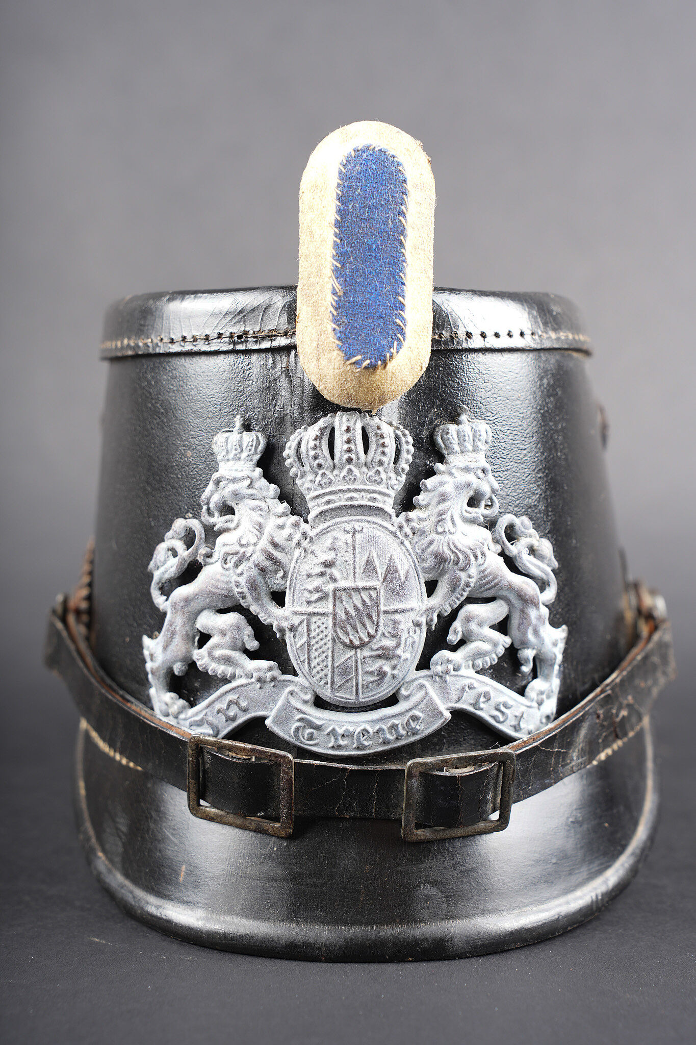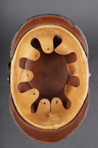 Tschako bavarois M1915. Belle bombe, non repercée, de forme spécifique bavaroise. Bel aspect, marquage fabricant à l’intérieur sur la calotte. Belle plaque bavaroise en fer peint feldgrau, fixée par une cordelette tendue, non démontée mais avec une très belle empreinte sur le vernis de la bombe. Feldzeichen blanc et bleu, probablement réparé anciennement. Reichskokarde reproduction. Jugulaire en cuir ciré noir. Belle coiffe à dents de loup en cuir havane, très souple. Une belle coiffure. Bavarian M1915 Tschako with sound shell of specific Bavarian form, not re pierced, maker marked inside the crown. Fine feldgrau painted steel Bavarian plate held by tension cord, never removed and leaving a strong imprint in the shell finish. White and blue feldzeichen likely repaired long ago, reproduction Reich cockade, black waxed leather chinstrap, supple havana leather wolf tooth liner. A fine example.