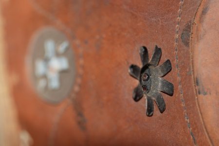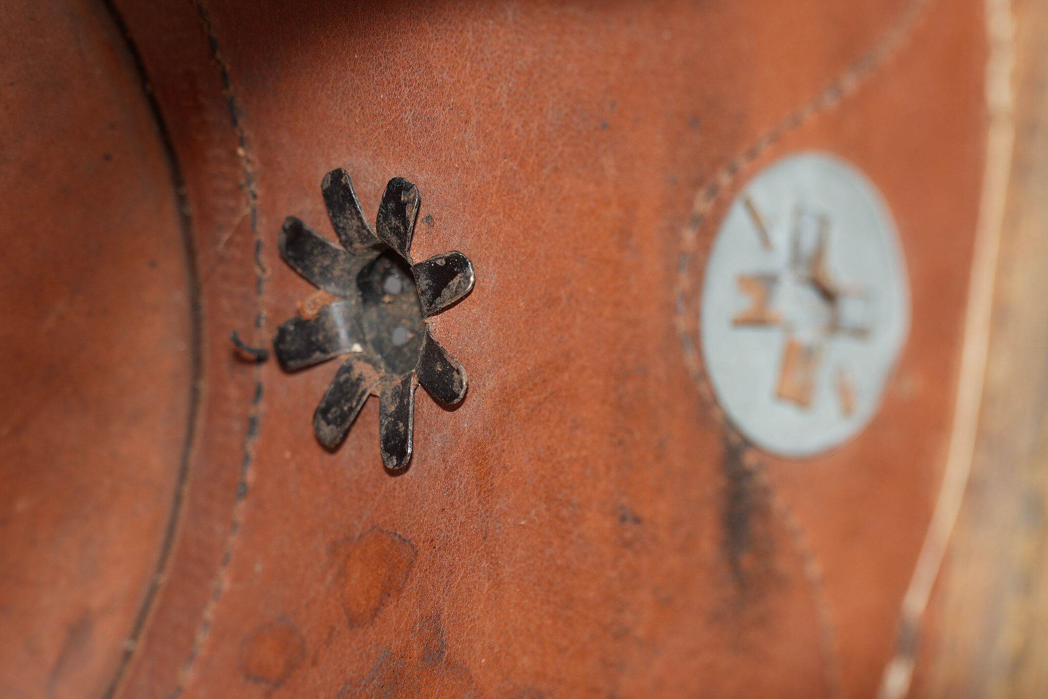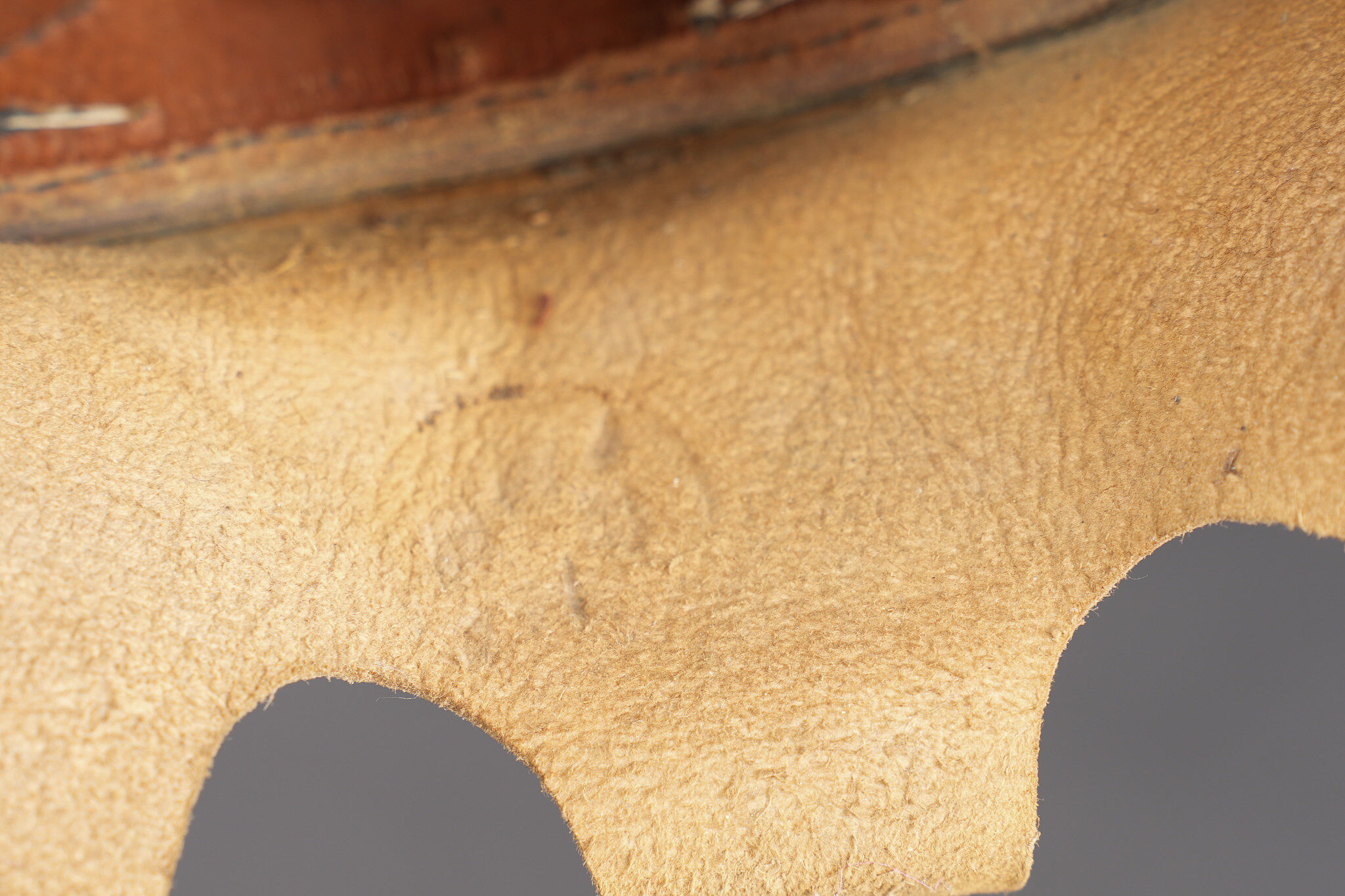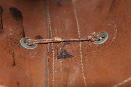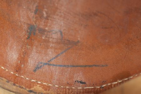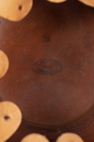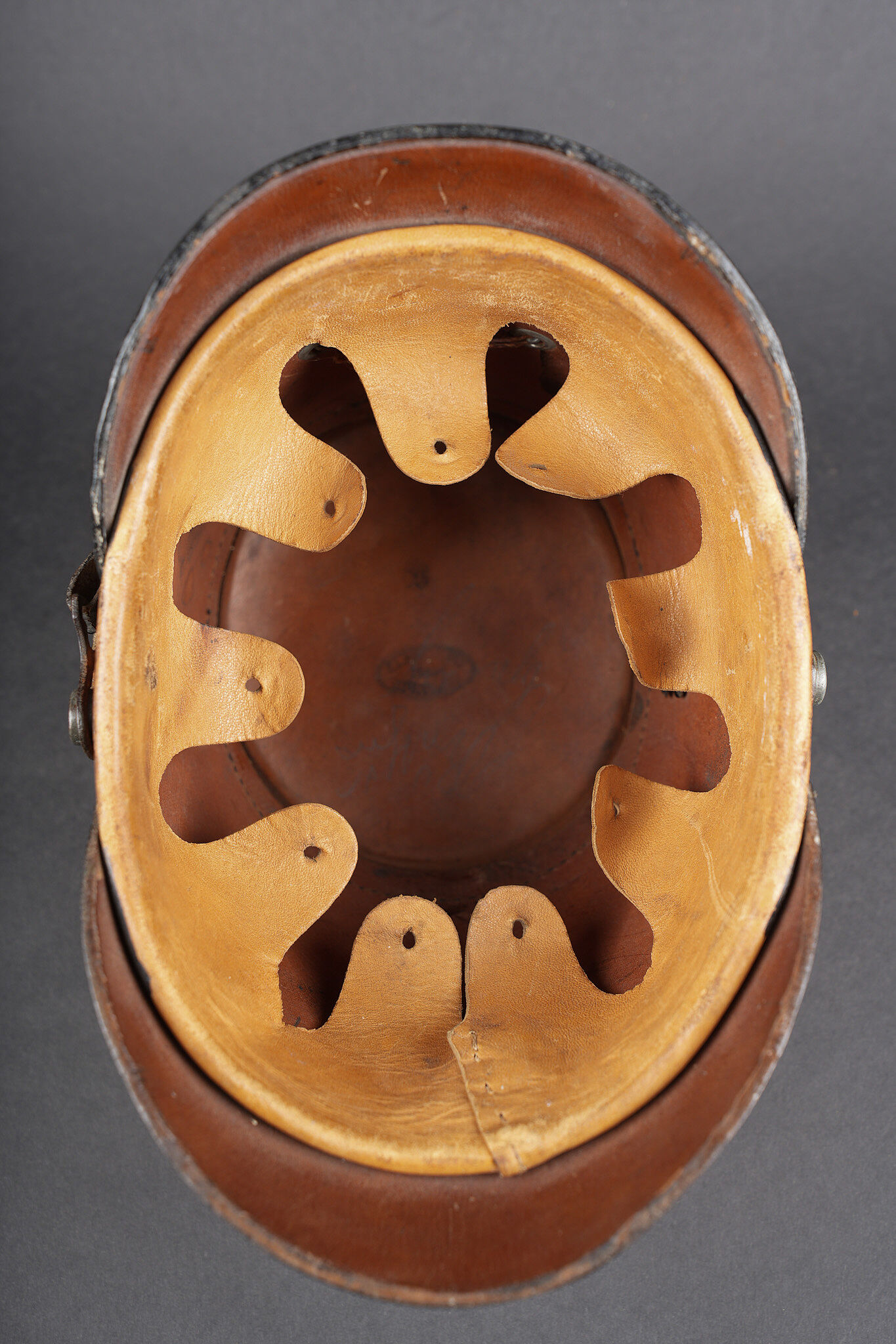 Tschako bavarois M1915. Belle bombe, non repercée, de forme spécifique bavaroise. Bel aspect, marquage fabricant à l’intérieur sur la calotte. Belle plaque bavaroise en fer peint feldgrau, fixée par une cordelette tendue, non démontée mais avec une très belle empreinte sur le vernis de la bombe. Feldzeichen blanc et bleu, probablement réparé anciennement. Reichskokarde reproduction. Jugulaire en cuir ciré noir. Belle coiffe à dents de loup en cuir havane, très souple. Une belle coiffure. Bavarian M1915 Tschako with sound shell of specific Bavarian form, not re pierced, maker marked inside the crown. Fine feldgrau painted steel Bavarian plate held by tension cord, never removed and leaving a strong imprint in the shell finish. White and blue feldzeichen likely repaired long ago, reproduction Reich cockade, black waxed leather chinstrap, supple havana leather wolf tooth liner. A fine example.