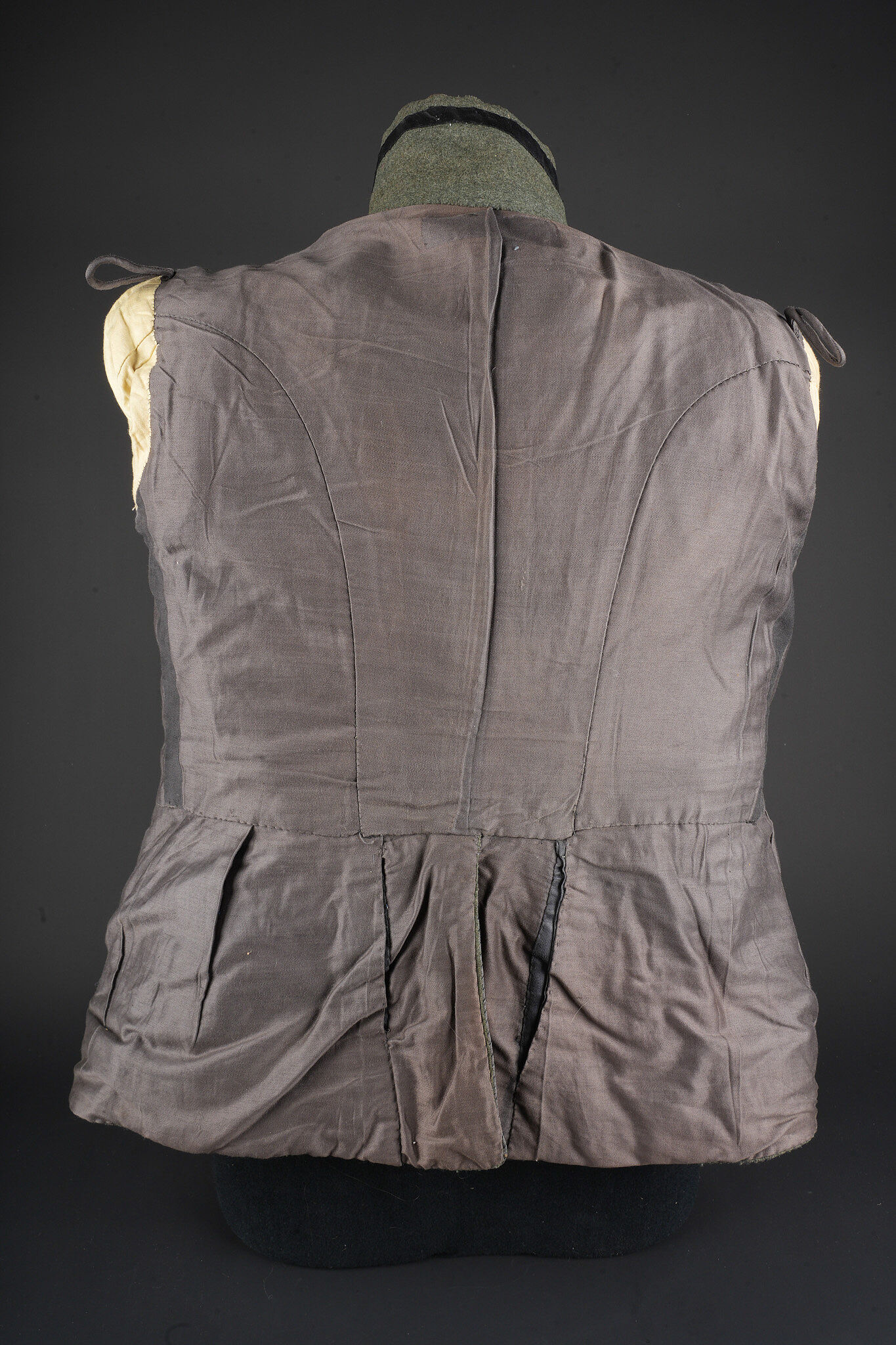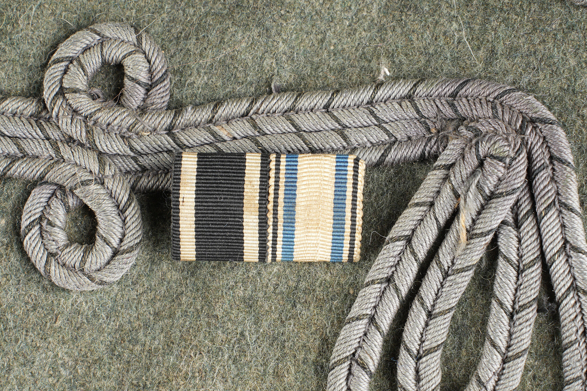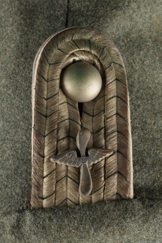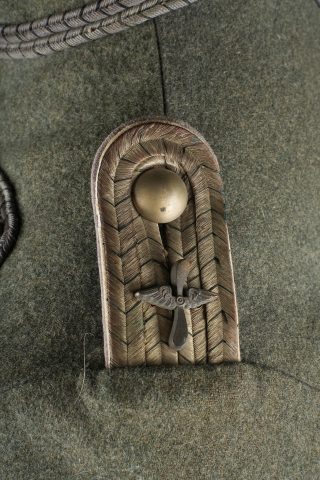 Tunique Attila feldgrau d’un officier d’aviation prussien. Attila feldgrau de hussard avec tresses et brandebourgs gris à liserés noirs. Col droit fermant par 3 crochets. Fermeture par 5 olives striés en maillechort. 10 boutons ronds en maillechort, de parement, sont présents, à recoudre. Un rappel de croix de fer et Bay. MVK. 2 jeux d’attentes pour badges, dont probablement brevet aviation. Epaulettes de Leutnant prussien en tresse métallique et liseré noir, dessous gris des troupes techniques, liseré intermédiaire blanc, cousues à l’emmanchure. Sur chaque épaulette l’attribut des troupes d’aviation, une hélice ailée en laiton. Quelques traces d’usure et accrocs mineurs. Bel état. Field grey Attila tunic of a Prussian aviation officer. Hussar style tunic with grey braiding and black edged frogging. Stand collar closing by three hooks. Front fastening by five ribbed nickel silver olives. Ten round nickel silver cuff buttons present, to be resewn. Ribbon bar for Iron Cross and Bavarian MVK. Two sets of traces for badges, likely including pilot insignia. Prussian lieutenant shoulder boards in metallic braid with black edging, grey technical branch underlay and white intermediate piping, sewn to the shoulder seam. Each shoulder board bears a brass winged propeller insignia of the imperial flying troops. Minor wear and small snags. Fine condition